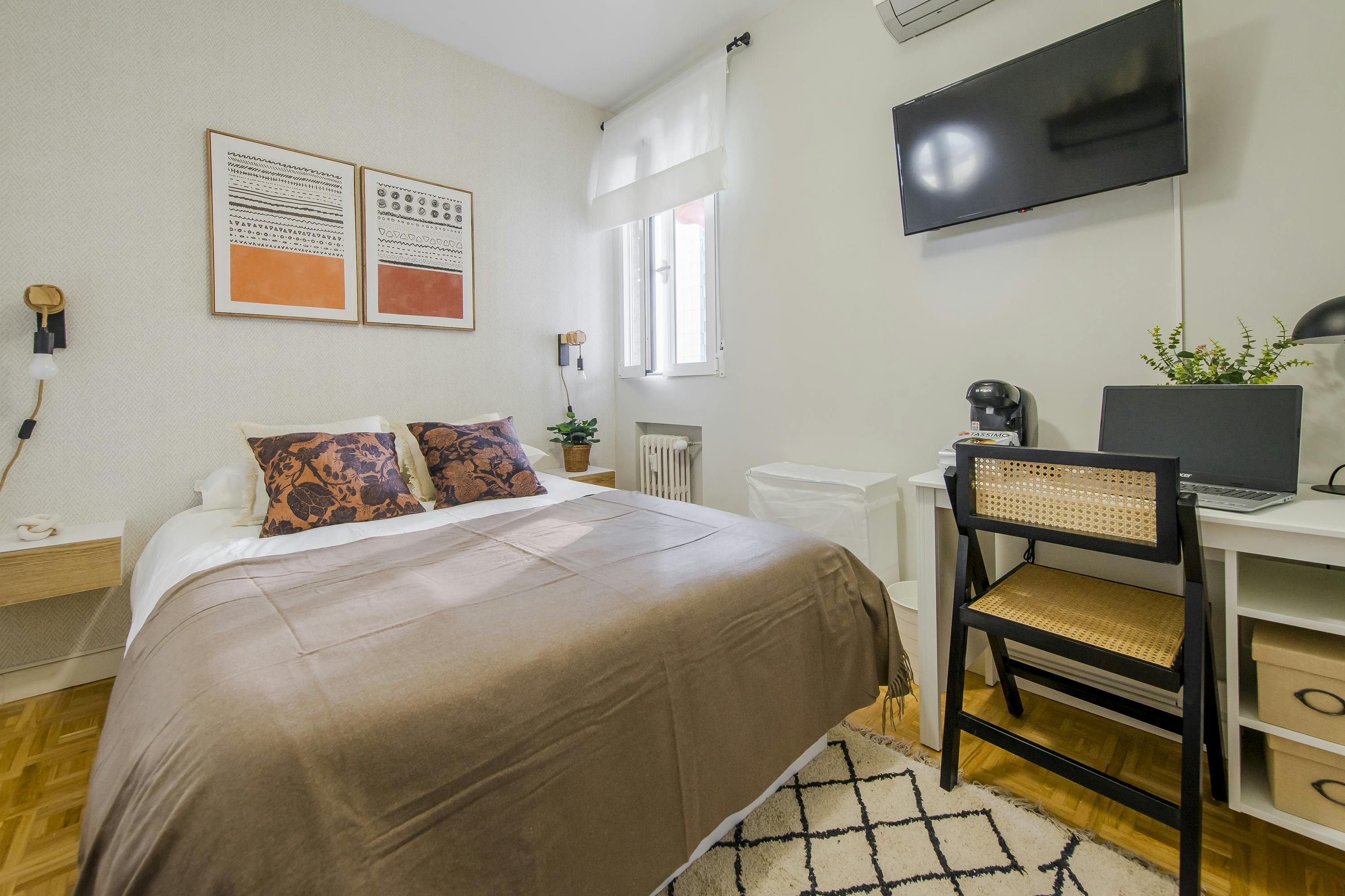 💢💢💢 This bedroom comes with: ✔Exterior window 🛏Type of bed: 135x190 cm We present you a beautiful room in Calle Orense. The room has a sofa bed, mirror, huge wardrobe, desk, smart tv so you can enjoy your favourite channels and streaming platforms and a spectacular view from the 11th floor of the building. The property consists of: 3 full bathrooms (1 of them is private), fully equipped kitchen (fridge, oven, microwave, ceramic hob, utensils) and 7 comfortable bedrooms. The price includes: - Maintenance technician - Contract management - Cleaning of the common areas once a week - Flexibility of contracts - Rooms with high quality standards - Lockable door - Customer service - All utilities included (water, electricity, gas and wifi) - Kitchen utensils. Unbeatable location right in the heart of the Nuevos Ministerios area, a few metres from the Metro and RENFE stations and a few streets away from the Santiago Bernabéu Stadium and the Corte Inglés of Nuevos Ministerios. There are also several bus stops, supermarkets, shops, banks, hairdressers, gyms and health centres nearby; all this together with a spectacular social and cultural life in the whole area. We are waiting for you! 🔔Administration fee must be paid by cash (Other types of payments, please contact us) 🔔Profile: 18-35 years (older ages may be accepted case by case) 🔔A weekly cleaning in common areas is included in the price. 💢💢�...