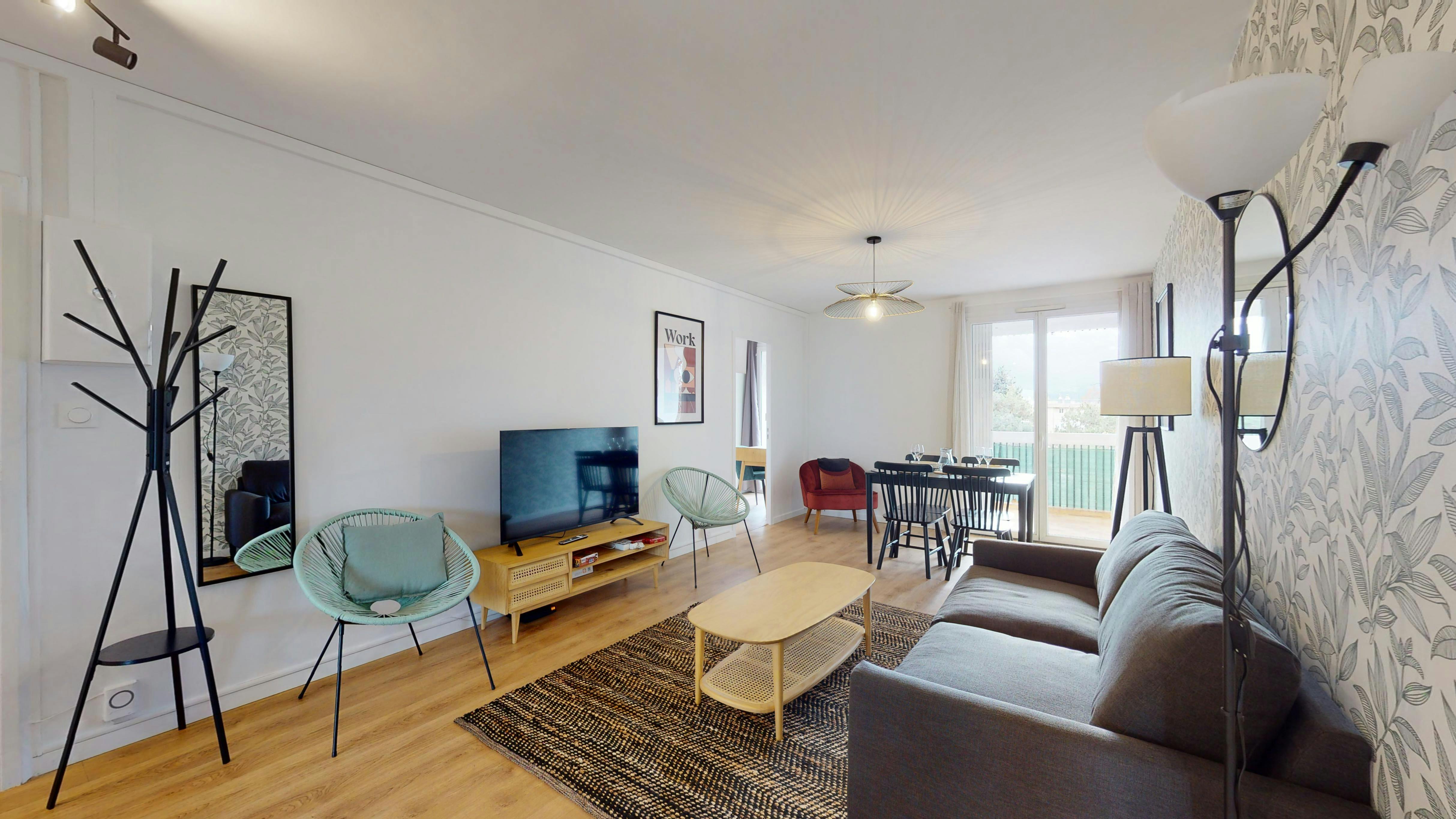 Bail avec clause de solidarité. Découvrez notre colocation conviviale située dans un appartement confortable de 85 m2. L'appartement est composé d'une cuisine équipée pour partager des repas, d'une buanderie pratique pour gérer votre linge, et d'un séjour lumineux avec un grand balcon pour se détendre. L'ambiance y est chaleureuse et parfaite pour des étudiants ou jeunes professionnels en quête d'un foyer partagé. La chambre disponible, nommée "Room 2", est conçue pour accueillir une personne. Elle offre un espace personnel agréable avec un lit double de qualité supérieure, une grande armoire pour ranger vos affaires, ainsi qu'un bureau et une chaise pour travailler au calme. La chambre partage une salle de bain moderne avec douche et toilettes avec les autres locataires. Situé à Aix-en-Provence, l'appartement est bien desservi par les transports en commun : la station de métro Pérouse (M1) se trouve à seulement 8 minutes à pied, et l'arrêt de bus Dunant (Bus 5) est à une minute. Le quartier est dynamique et offre tout ce dont vous avez besoin à proximité. Eligible AP...