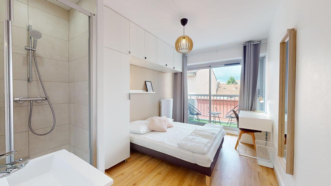Notre agence vous présente cette colocation 4 chambres de 82 m2 située au 33 Rue Hippolyte Kahn. 🛏 LA CHAMBRE Cette chambre est lumineuse et dispose d'un lit double, d'une table de chevet avec lampe, d'un miroir, d'un bureau avec lampe et de nombreux rangements. Une cabine de douche et un meuble vasque sont disponibles directement dans la chambre pour plus d'intimité et de confort. Le + de la chambre : un balcon privatif aménagé pour profiter du soleil ☀️. 🏠 LES ESPACES COMMUNS Cet appartement de 5 pièces à la rénovation récente s'ouvre sur une entrée avec rangements desservant un séjour avec cuisine ouverte. Celui-ci dispose d'un canapé, d'une table basse, d'une TV connectée, d'un fauteuil, d'une table avec 4 chaises et de rangements. La cuisine dispose d'un four, de plaques de cuisson, d'un micro-ondes, d'un réfrigérateur avec congélateur, d'un lave-linge, d'un évier et de tous les rangements et ustensiles nécessaires. La salle d'eau dispose d'une double vasque et d'une douche à l'Italienne. Les toilettes sont séparées. Cet appartement est équipé d'un chauffage collectif. Il est situé au 2e étage d'un immeuble. 📍 LE QUARTIER L'appartement est idéalement situé en plein centre de Villeurbanne, à deux pas des commerces (supermarché à 300m) et des espaces de loisirs. Côté transports, le métro à 200m (ligne A - arrêt République - Villeurbanne) permet de rejoindre le centre de Lyon en une dizaine de minutes. Les gares de Perrache et Part-Dieu sont accessibles en respectivement 15 et 12 minutes de transports. De nombreux bus desservent également la zone. Les universités de Lyon sont rapidement accessibles : Campus de la Doua (Lyon 1) à 15 minutes de transports Ucly à 15 minutes de transports Lyon 3 manufacture des tabacs à 20 minutes de transports Lyon 2 campus des quais à 20 minutes de transports Bail individuel à la chambre. Pas de caution solidaire. Chacun est libre de partir quand il veut sans se soucier des autres colocs, dès le moment où il respecte un mois de préavis. Éligible aux APL...