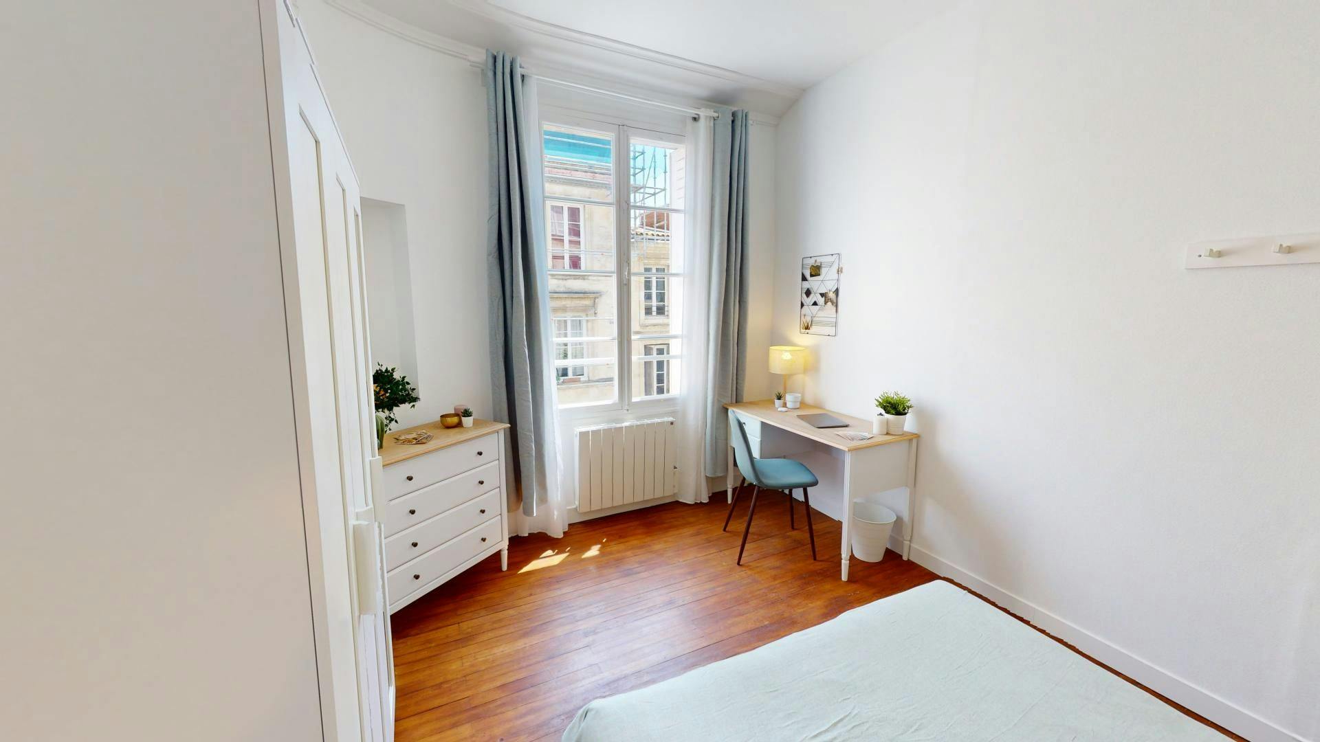 Furnished flat share ! All our flats are located in the city centre and close to all amenities and public transport (Metro, Tramway and Bus). This lovely private bedroom in a fully equipped, furnished and all-inclusive flatshare in Bordeaux is a mix of comfort and design. It has got household furnishings, including a bed with pillows and duvet What is missing is your things to feel at home! The room can be locked if you need intimacy. All our rooms are fully furnished (bed, desk, wardrobe, duvet, pillows...). The flatshare can be found in the Chartrons Grand Parc neighborhood, in the heart of Bordeaux. Plenty of shops, public transports, restaurants are accessible close by. The apartment is on floor 0 without lift. It is entirely equipped and is composed of a large kitchen with refrigerator, microwave, pans, crockery, kitchen ustensils, kettle... The accommodation also contains an ironing board, a washing machine, a clothes rack, an iron. Additionally, you will find cleaning items in the accommodation: bagless hoover, dustpan and brush, broom, mop and bucket... Every Joivy furnished flatshare includes all expenses: housing insurance, water, electricity, unlimited wi-fi, condominium fees, household waste tax. All our flats are fully equipped (washing machine, dishes, decoration...) by our teams, who also take care of the technical and material maintenance. The Chartrons district is best known as the historic birthplace of its Bordelais wine dealers the neighbourhood extends from the beautiful leafy spaces of the “Jardin Public” to the peaceful river banks, passing through the well-connected cosmopolitan district of Notre Dame along the way. Chartrons offers an array of architecture to appreciate; from bourgeois buildings dating from the XVIII century to more urban landscapes, from residential streets to shopping zones, not to mention the immense public parks! The vibrant area is constantly evolving, it’s well known for its many riverside restaurants and bars open till late along the quai des Marques. Here you can also shop till you drop in some of the many clothing and homeware stores the area has to offer! In the futuristic Cap Sciences museum you can participate in interactive exhibitions, or discover international works at the contemporary art museum CAPC. Close by, you’ll be able to take a breather in the peaceful public gardens which boasts a beautiful lake and botanical garden. This district in Bordeaux is equally well connected with public transport links: bus, and tram lines B and C. Minimum stay : 1 mois Apartment eligible for CAF up to 258€ / month. The CAF for Caisse d'allocations familiales is a free public service eligible for all, including foreigners and can help you financially to pay part of your housing according to your situation whether you are French or foreign. To find out the potential amount of your assistance, go to the CAF website and complete the online APL (housing assistance) estimate. Service fee : from 490€ The service fee covers the writing of the lease but also the assistance throughout your stay. The service fee covers the repair and maintenance of the equipment as well as access to our ultra-reactive support in case of need for intervention in your accommodation. Deposit : 900...