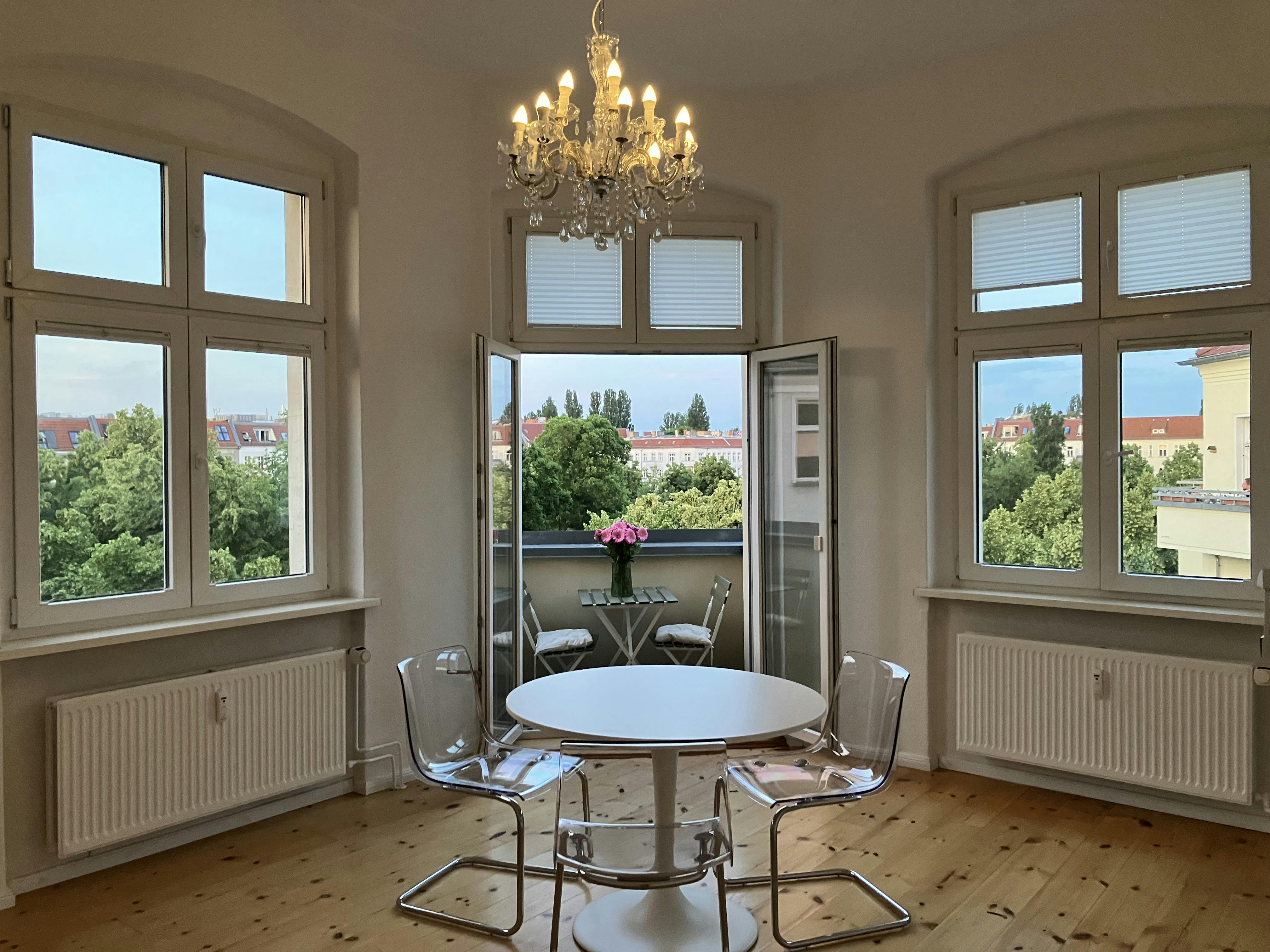 Bathe in sunlight, breathe in space, and look out over clear skies — this rare penthouse combines soaring 4-meter ceilings, expansive windows, and a private terrace with panoramic views of lively Boxhagener Platz. The spacious bedroom welcomes you with a comfortable double bed for restful nights, while the fully equipped kitchen invites you to cook, host, or simply enjoy a quiet dinner at home. The living room, with its generous sofa and smart TV, is designed for relaxation after an inspiring day in the city. Right outside your door, you’ll find the very best of Berlin: vibrant cafés, diverse restaurants, boutique shops, and the weekly market on Boxi. For balance, Volkspark Friedrichshain offers jogging paths, green spaces, and tranquil corners to recharge. Whether you are here for a few months or an entire year, this apartment is more than just a place to stay — it’s your home base for experiencing Berlin’s unique energy, creativity, and charm...