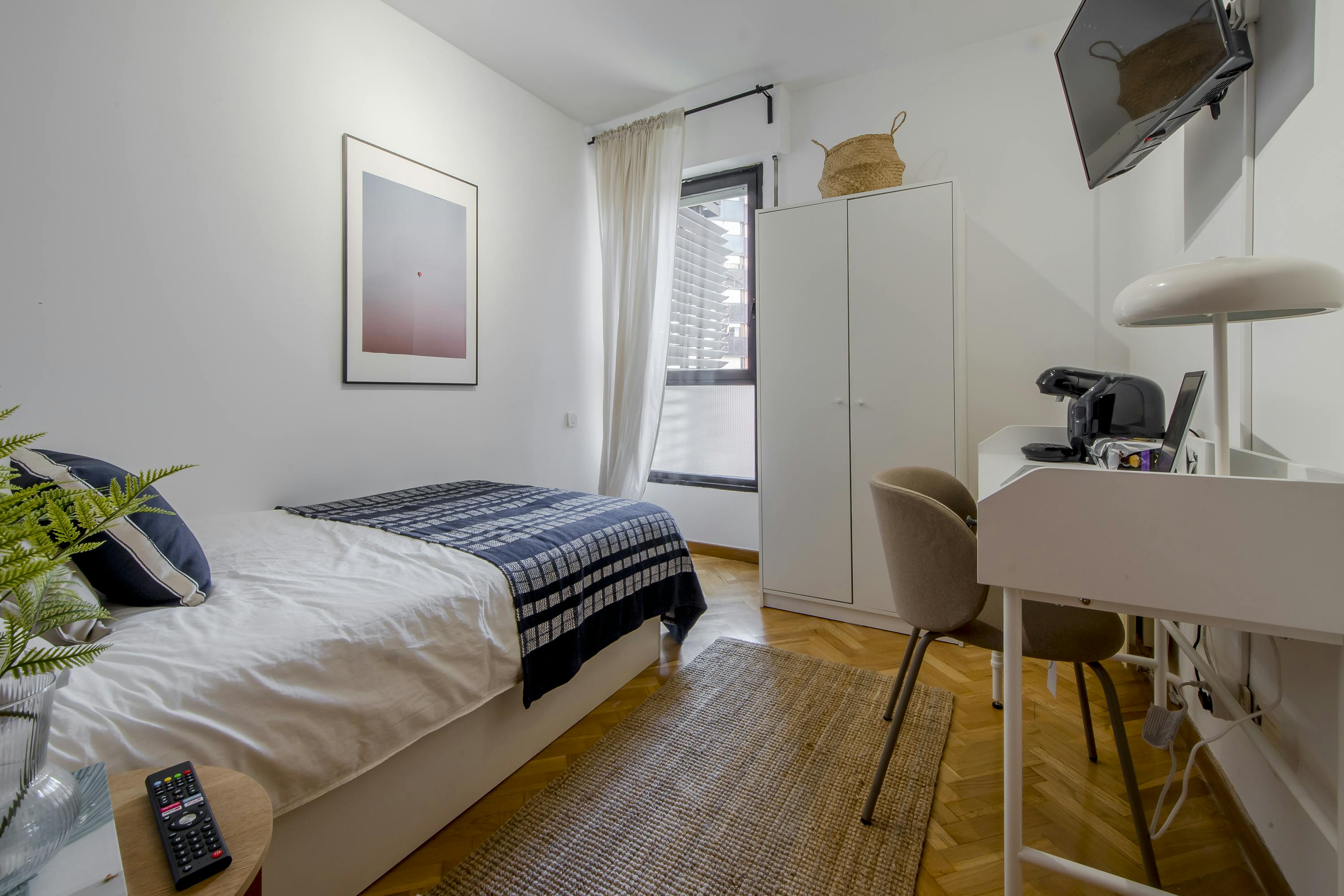 This bedroom comes with: ✔Exterior window 🛏Type of bed: 105x190 cm We present you a beautiful room in Calle de Marqués de Lozoya 34. The property consists of: 2 bathrooms and a toilet, fully equipped kitchen (1 fridge, oven, microwave, ceramic hob, utensils) and 6 large rooms. The room has bed with canapé, mirror, wardrobe, desk, smart tv so you can enjoy your favourite channels and streaming platforms and a spectacular view to the street. The price includes: - Maintenance technician - Contract management - Cleaning of the common areas once a week - Flexibility of contracts - Rooms with high quality standards - Lockable door - Customer service - All utilities included (water, electricity, gas and wifi) - Kitchen utensils. Unbeatable location close to Sainz de Baranda Metro station and the emblematic Retiro Park, several bus stops, supermarkets and shops; all together with a spectacular social and cultural life of the city. We are waiting for you! 🔔Administration fee must be paid by cash (Other types of payments, please contact us) 🔔Profile: 18-35 years (older ages may be accepted case by case) 🔔Weekly cleaning of rooms and common areas is included in the rent 💢💢�...