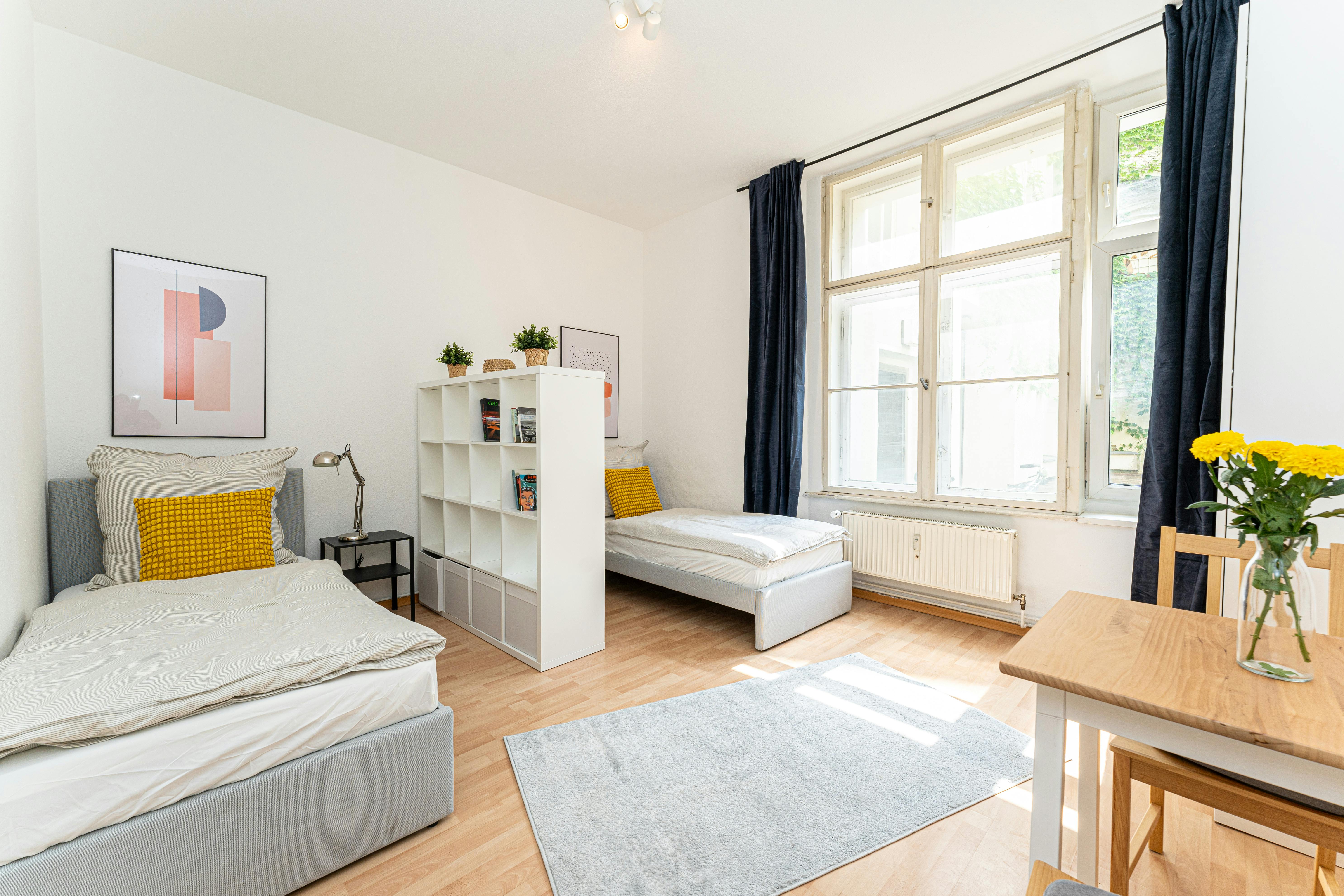 Die kürzlich sanierte Altbauwohnung sorgt mit ihrer hochwertigen, modernen sowie gemütlichen Einrichtung für ein besonderes Wohnambiente. Die Wohnung liegt in einem ruhigen Hinterhaus mit Blick in den grünen Garten, wo man die Sommermonate genießen kann. BESICHTIGUNG MÖGLICH Die funkationale Wohnung gliedert sich in den offenen Küchenbereich, 3 Schlafzimmer, sowie eine Abstellkammer und ein Badezimmer mit Badewanne. Zwei der drei Schlafzimmer sind mit gemütlichen Einzelbetten ausgestattet, welche sich flexibel zusammenstellen lassen können oder auch einzeln mit einem Raumteiler genutzt werden können. Zusätzlich bietet je ein geräumiger Kleiderschrank Platz für die Kleidung. Ein Arbeitsplatz für 2 Personen ist ebenfalls jeweils vorhanden. Das dritte Schlafzimmer bietet ein komfortables Boxspring Bett und ebenfalls einen geräumigen Kleiderschrank, sowie einen Arbeitsplatz für 2 Personen. Somit kann die Wohnung von 5 - 6 Personen genutzt werden. Das Badezimmer besitzt alle notwendigen Ausstattungen, einen Waschtrockner sowie ein gemütliches Wannenbad. Die voll ausgestatteten Küche bietet genug Platz für Kochabende. Ausstattungsmerkmale: Möblierung und Ausstattung durch professionellen Innenausstatter Boxspringbetten, sowie flexible Einzelbetten Voll ausgestattete, moderne Küche mit Geschirr, Töpfen, Schüsseln, Küchenutensilien etc. Kühlschrank mit Gefrierfach Backofen Modernes Cerankochfeld Geschirrspülmaschine Nespresso Kaffeemaschine, Toaster & Wasserkocher Hochwertige Handtücher & Bettwäsche Staubsauger / Bügeleisen / Bügelbrett / Wäscheständer / Reinigungsutensilien / Fön Kostenloses Internet Umgebung: Die Wohnung befindet sich in zentraler Lage von Wedding, in unmittelbarer Nähe zum Charite Campus Virchow Klinik und dem Robert-Koch-Institut. Darüber hinaus bietet die Fehmarner Straße sowie die umliegende Nachbarschaft ein reiches Angebot an gemütlichen Cafes, belebten Bars, verschiedensten Restaurants sowie Ausgehmöglichkeiten. Auch bietet der Hohenzollerkanal, welcher nur wenige Gehminuten entfernt ist, zum Verweilen oder Spazieren an der Uferpromenade ein. In nur 3 Minuten kann zu Fuß die Station “Amrumer Straße” erreicht werden, von der aus die U-Bahn und Buslinien in die Stadt abfahren und somit das Erkunden von Berlin mit seinen zahlreichen Sehenswürdigkeiten und das Erleben des besonderen Berliner Flairs sowie das Nachtleben problemlos möglich ist. Ein Supermarkt (Edeka) ist in nur 5 Minuten erreichbar und sogar das Einkaufen spät am Tag oder am Sonntag wird durch die klassischen Berliner Spätkäufe ermöglicht. Entfernungen: 3 min zur U-bahn Station AMrumer Straße 5 min. zum Supermarkt (Edeka) 15 min zum Shopping Center “Galeria Markthalle” Haustiere: Für Haustiere erheben wir eine monatliche Gebühr von 50-100€, sowie erhöht sich die Endreinigung um 100...