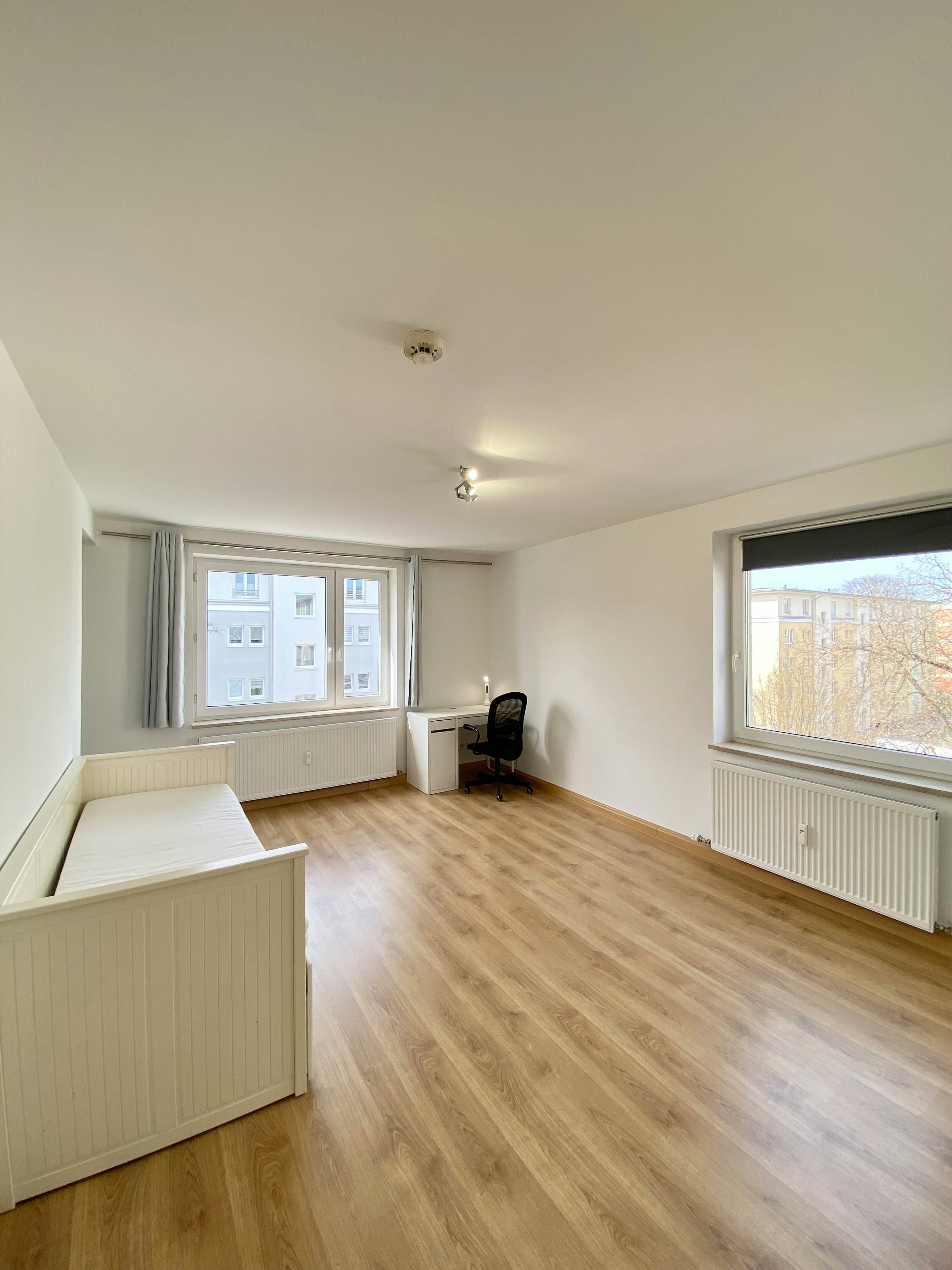 Bright Room with Balcony in Newly Renovated 120 m2 Co-Living Apartment near Olympiapark Welcome to your new home! This bright and spacious room is part of a freshly renovated 120 m2 apartment with 4 bedrooms, a bathroom, a separate toilet, a fully equipped kitchen, a living–dining area, and a hallway. 🛏️ About the Room Three large windows → very bright and sunny Beautiful parquet flooring Private balcony Furnished with: Large extendable bed (IKEA Hemnes, 160×200 cm) Wardrobe Desk, swivel chair & table lamp 🏡 The Apartment The entire flat has just been renovated — you will be the first to move in after renovation. The kitchen includes: fridge & freezer, dishwasher, microwave, kettle, and all essential utensils. A washer–dryer is available in the bathroom. 🧼 Cleaning & Costs We don’t have a cleaning schedule, but a professional cleaning service regularly cleans the apartment. All-inclusive rent covers: Cleaning & cleaning supplies Internet Electricity Washing & dishwashing liquid → No extra costs for you 👥 Your Flatmates You’ll be living with three friendly young professionals: Mariana (22) – Intern Angelo (26) – Product Manager Didier (24) – Working at BMW We enjoy relaxed co-living: cooking, hanging out, or doing activities like sports, biking, beer gardens, or parties — always optional. Privacy is respected: when the door is closed, you have peace and quiet. 📍 Location Quiet residential area next to Olympiapark. Everything you need is close by: LIDL, ALDI, DM, Vollcorner, bakery, fruit & vegetable shop, pharmacy (5 min walk) Bus & U-Bahn (U3 – Olympia-Einkaufszentrum, 2 min walk) → 7 min to city center, 8 min to main train station 🚗 Extras Parking spaces in front of the building Bicycle storage room Olympiapark only 5 minutes awa...