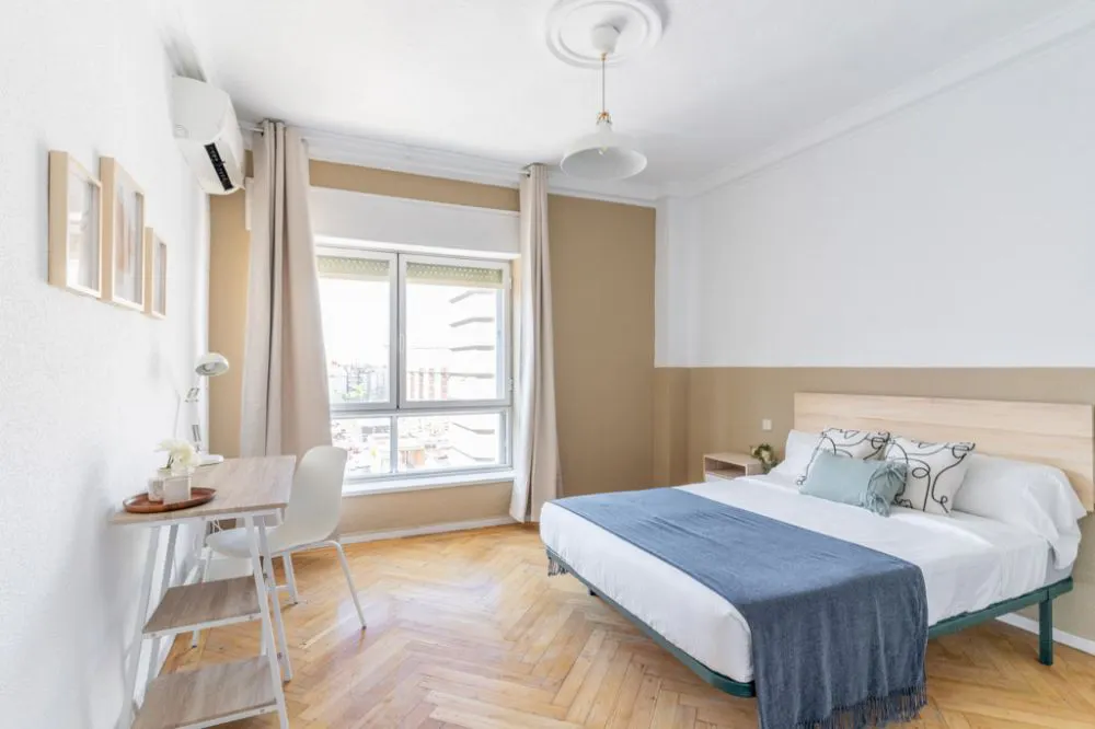 Beautiful newly renovated apartment located just 4 minutes walk from the Avenida América interchange. This apartment has 6 double bedrooms and two bathrooms, a dining area with TV and also a fully equipped kitchen with the most important appliances such as a refrigerator, stove, oven, washing machine and microwave. All necessary household items are also included. The apartment is located between the Prosperidad and Salamanca neighborhoods, and is perfectly connected to the center of Madrid so that any young student can enjoy a comfortable and pleasant stay. Many of the schools are nearby, such as the IE Business School just 11 minutes walk away or the EAE Business School 17 minutes away, among many others. This apartment is located in an ideal area as it is connected to three important neighborhoods of Madrid such as Salamanca, Prosperidad and Guindalera, with which you can enjoy a wide variety of shopping areas, parks and food spaces. On Avenida América is one of the most important transport interchanges in the city that allows you to connect by bus, metro or train to any part of Madrid. While in the areas near the apartment you can find several supermarkets, pharmacies and restaurants. The nearest transportation point is the Avenida América interchange, which connects with subway lines 4, 6, 7, and 9, as well as several EMT and interurban bus lines. -Prosperidad market: Just 5 minutes away is the prosperidad market, a municipal market and food market that opened its doors in 1954. -Serrano Street: Nearby is Serrano Street, known for its luxury stores, as well as all the necessary stores to enjoy fashion in Madrid. -Berlin Park: This green area is perfect for a moment of respite in the city, besides being able to admire one of the original pieces of the Berlin Wall. - Don't smoke - Pets are not allowed - Parties are forbidden - Take out the trash daily - Short-term visits are allowed - (hidden) informs that in this flat a device has been installed in order to allow the monitoring of the noise level (decibels) 24 hours a day. The system emits an alert whenever the sound level exceeds the maximum allowed by the Community of Madrid, mainly between 11pm and 6am. Large furnished room with air conditioning in Prosperidad Beautiful room on Avenida América with a double bed that stands out for the entry of natural light and views over the main avenue, it is an ideal place to rest and with an excellent connection by public transport. Designed for students and young workers looking for a comfortable experience in Madrid, the room comes equipped with a 135x190 cm bed, a large closet, a desk with chair and lamp, as well as air conditioning, creating a perfect environment for both relaxing and studying. or work. In addition, the door has a lock to guarantee your privacy at all times. The size of the room is 13.30 m2. *Bedding is not included; only a mattress cover is provided. Please keep in mind that the amount requested in the "other additional costs" field refers to tenant assistance coverage....