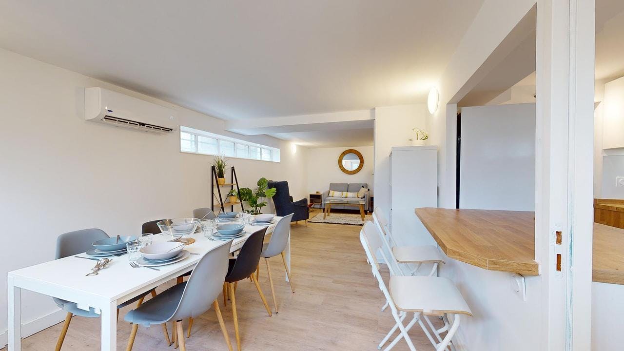 Notre agence est fier de vous présenter cette colocation de 118 m2, située 33 Rue Thénard à Lyon 69008. 🏠 L’APPARTEMENT 🏠 Notre logement comprend : Un espace salon composé d'un canapé, deux fauteuils, une table basse en verre, un tapis ainsi que des plantes naturelles. Cette espace donne accès au deux premières chambres du logement. La salle à manger dispose d'une grande table avec ses six chaises, une machine à café ainsi que de nombreux rangements. Cette pièce est attenante à la cuisine qui est séparée par un bar. La cuisine comprend une machine à laver, une plaque de cuisson à induction, un four, un micro-ondes, un Cookeo, un gaufrier ainsi qu'une bouilloire. Deux réfrigérateurs ainsi que de nombreux rangements sont aussi à disposition dans la cuisine. Vous trouverez deux salles de bain à l'étage avec un meuble vasque et miroir ainsi qu'une douche. À savoir : ce logement dispose de la climatisation dans chaque pièce du logement. 🌇 LE QUARTIER 🌇 Situé au cœur du 8ème arrondissement de Lyon, le quartier autour de la Rue Thénard offre un cadre de vie agréable et pratique. Vous y trouverez de nombreux commerces de proximité, tels que des boulangeries, des supermarchés, et des pharmacies. Les amateurs de gastronomie apprécieront les divers restaurants et cafés à quelques pas. Plusieurs écoles et parcs sont aussi accessibles à pied. Le quartier est également bien desservi par les infrastructures sportives et culturelles, avec des gymnases, des bibliothèques et des centres culturels à proximité. 🚌 LES TRANSPORTS 🚌 ➢ Lignes de bus : Les lignes de bus C16 et 26 sont à seulement 3 minutes à pied du logement, facilitant vos déplacements quotidiens. ➢ Ligne de tram : La ligne de tramway T2 est accessible en 10 minutes de marche, vous connectant rapidement aux autres quartiers de Lyon. ➢ Ligne de métro : La station de métro Grange Blanche (ligne D) se trouve à environ 15 minutes à pied, offrant un accès direct au centre-ville et aux principaux points d’intérêt de Lyon. Les informations sur les risques auxquels ce bien est exposé sont disponibles sur le site Géorisques : (hidden...