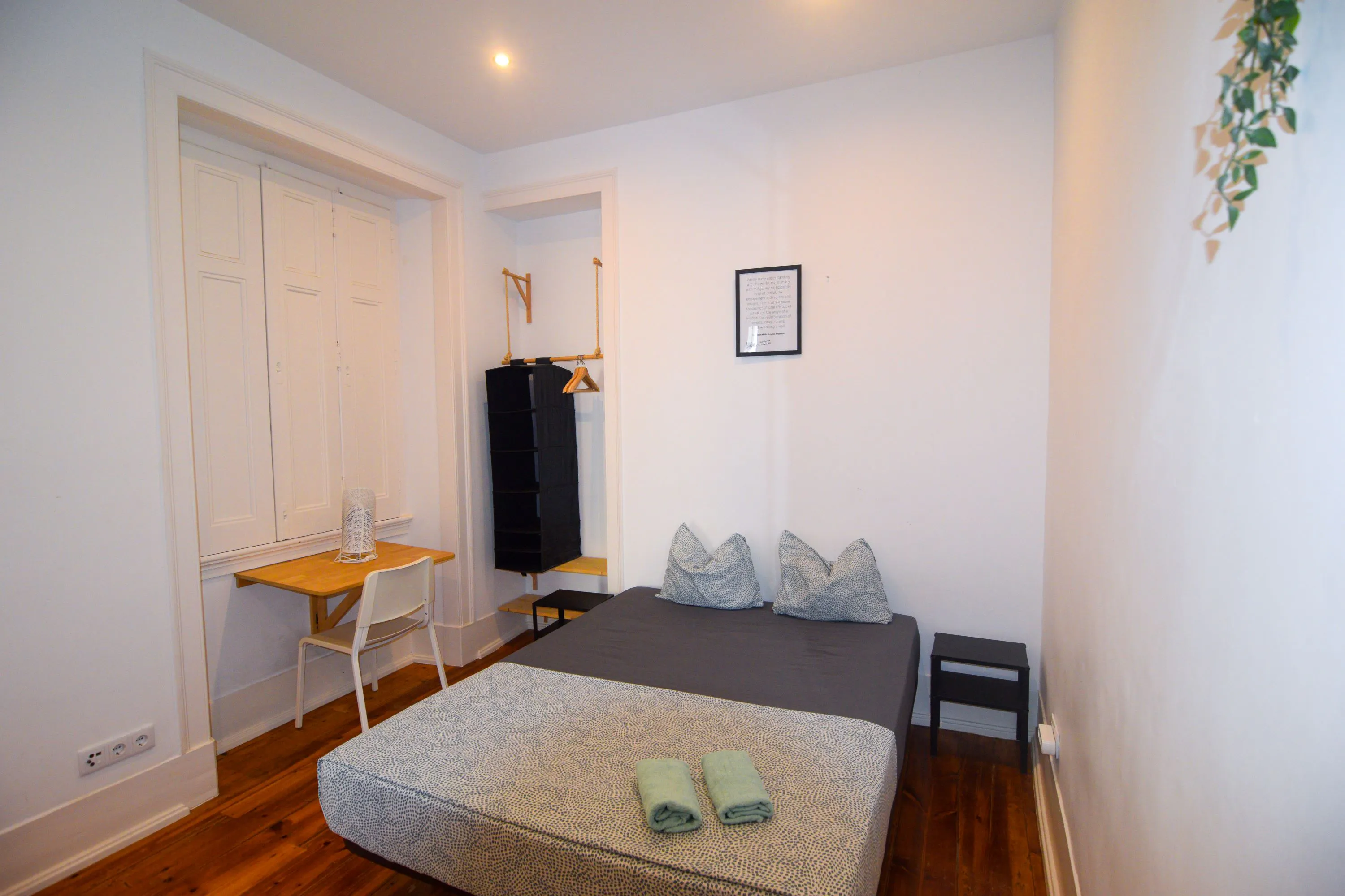Welcome to the Embassy Suite: Elegant Living in Lisbon Experience the elegance of this chic apartment located in a peaceful neighborhood, offering stunning views of the Port of Lisbon. The area is filled with easily accessible small groceries and cafés, perfect for your daily needs. Accommodations at the Embassy Suite In the Embassy Suite, you'll find five exclusive private rooms, complemented by 2.5 shared bathrooms, a kitchen that boasts an astonishing view of the Tagus River Port, providing an inspiring backdrop for your culinary creations. Room E includes a double bed, a desk with a chair, and a lamp. Moreover, the room has a window with internal building view. Apartment features: - Third floor. No elevators. -Residential building, quiet hours from 10 pm till 8 am, calm environment, no parties, no smoking place. - These are non-smoking rooms. If you're seeking a vibrant and culturally rich destination to call home this winter, look no further than Lisbon. Recently recognized as a paradise for remote professionals and freelancers, Lisbon offers the perfect blend of authentic history, rich culture, and modernity, all under its sunniest skies. What better fuel for productivity than the radiant sun itself? We warmly welcome individuals from creative industries and embrace the potential for collaboration. Whether you’re a writer, artist, musician, or any other creative professional, Lisbon’s lively atmosphere will inspire your work and nourish your artistic spirit. Due to the unique architectural features of many Portuguese buildings, central heating can be rare. To keep you warm and comfortable, we provide portable heaters in every bedroom. We also supply fresh linens and towels for your convenience. Common areas will be cleaned twice a week, linens and towels will be changed every fifteen days. For added flexibility, we’ve implemented a user-friendly self-check-in process, allowing you to arrive at your convenience. Personalized Support at Our Central Desk: Our central desk is dedicated to providing our guests with personal attention during office hours. Our friendly staff is available to assist with any issues and offer the best recommendations for exploring the city. If you need assistance during your stay, don’t hesitate to reach out to us...