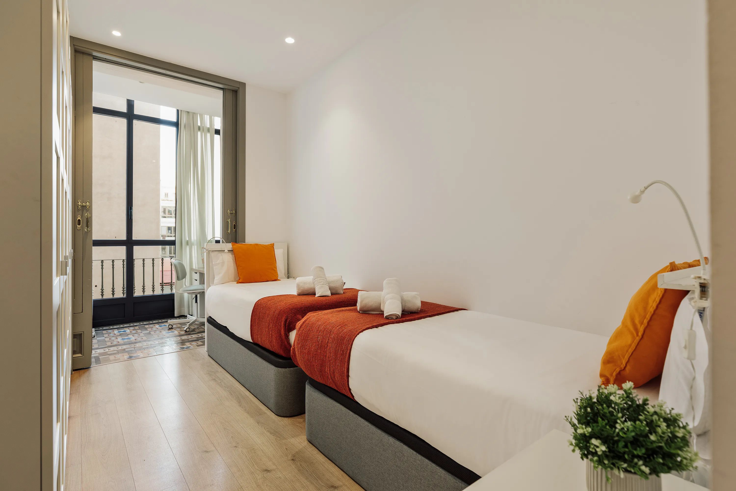 These 3-bedroom and 2-bathroom apartments are modern and elegant in style. They are located in the attractive L'Eixample district, 5 minutes walking from Plaça Catalunya and the Plaça Universitat and Passeig de Gràcia metro stations that connect with the entire city. It is situated in a lively area with numerous bars and restaurants. It features mosaic floors and modernist-style doors that make it a very cosy apartment. The apartments are exterior-facing and have a balcony, air conditioning, heating, and Wi-Fi connection. The living room has comfortable sofas and a television. The kitchen is fully equipped with an oven, microwave, refrigerator, ceramic hob, washing machine, and dryer. The bedroom has two beds, two spacious desks, and a large wardrobe. It also has a large gallery that provides plenty of natural light to the room. Additionally, the bed comes with a storage base, providing more storage space. The apartment is provided with towels and bedding upon arrival. The photographs shown are a selection of various apartments in the same building. Apartments may vary in decoration and space distribution, but all have the same style. A specific apartment will be assigned upon arrival. - Prices for bookings of minimum 3 months. For shorter bookings, please consult prices. Accommodation prices and management fees are subject to contract duration and advance notice of apartment entry date. 150€ utilities Deposit: (Subject to length of stay) Final Cleaning: 150€ - Agency fees: * 1-2 months: 200€ + VAT * 3-5 months: 450€ + VAT * 6-9 months: 750€ + VAT * 10-11 months: 1,200€ + VAT Our reception is located at number 1 Passatge Sert, where you can collect your key between 9:00 and 20:00 hours Monday to Friday (except holidays Monday to Friday). If your arrival is on Saturday or Sunday (or a weekday holiday), key collection is at number 228 Aribau Street. For corporate bookings, 21% VAT must be added to the published price. This room is rented exclusively for recreational, vacation, or long-term tourist stay...