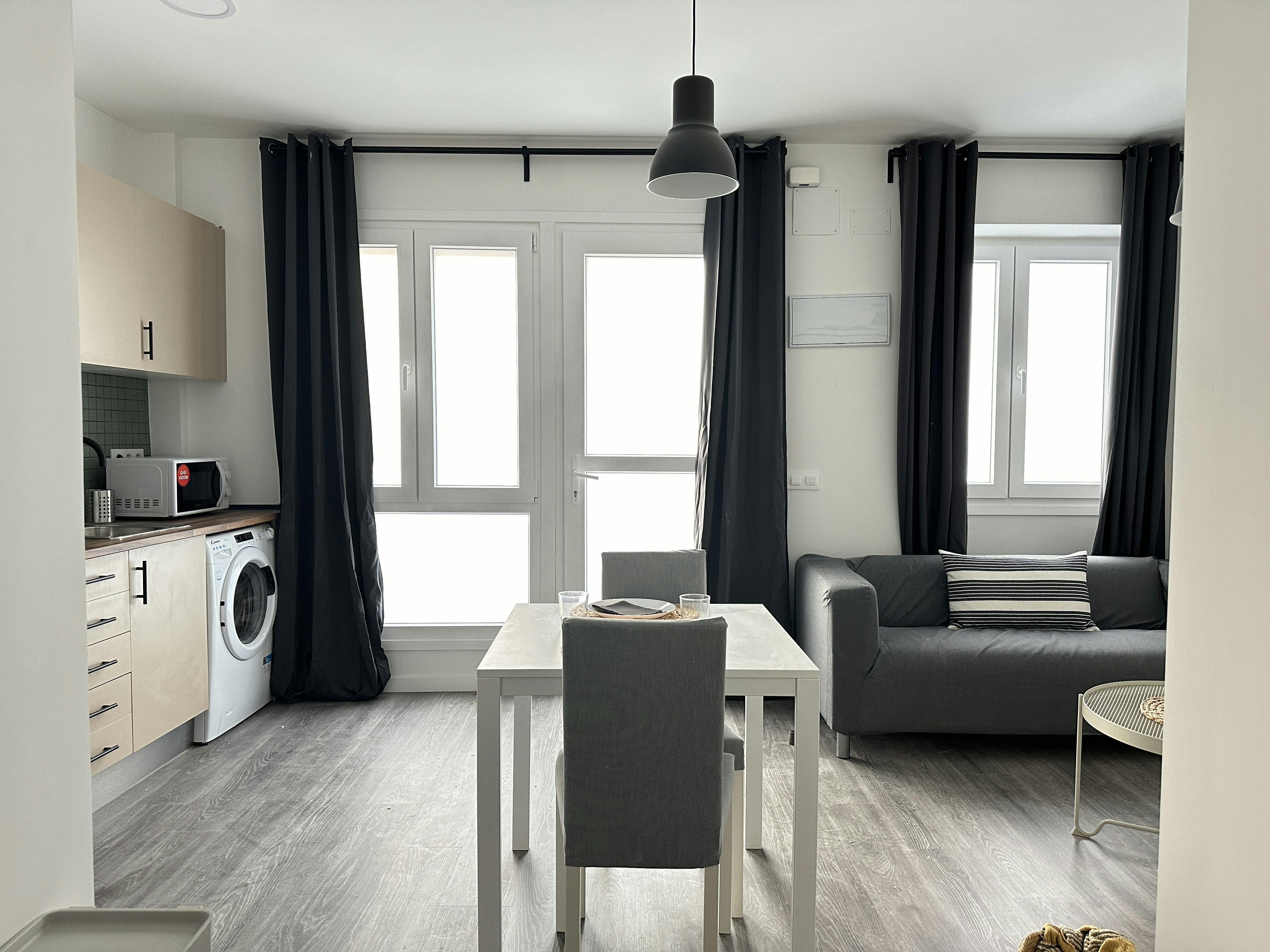 This *large studio* with an *open-plan layout* combines the *living room* , *kitchen* , *bedroom* , and *bathroom* into one space, featuring a *modern* and *minimalist decor*. In the *living area* , there is a *comfortable sofa* in neutral tones, along with an *elegant coffee table* , perfect for relaxing. In front of the sofa, a *flat-screen TV* is mounted on the wall, accompanied by a *pair of floating shelves* , ideal for storing books and decorative items. The *kitchen* is fully equipped with a *fridge* , *ceramic hob* , *oven* , *microwave* , and *washing machine*. Next to the kitchen, a *dining table for two* creates a cozy dining space. The *bedroom* , integrated into the same area, features a *double bed* with two *bedside tables* , and two *spacious wardrobes* for storage. Lastly, the *bathroom* includes a *large walk-in shower* , maintaining the studio’s *modern* and *functional design*. Lucero , a charming neighborhood in the Latina district of Madrid, is distinguished by its unique blend of old and modern buildings, *creating a peaceful and appealing residential environment for students.* Accessibility is a standout feature, thanks to the efficient public transportation system, especially the metro, with *the nearest station being Lucero (Line 6).* While Lucero doesn't host universities within its core, its strategic location allows easy access to prominent educational institutions in Madrid via the metro, such as the Complutense University of Madrid in Moncloa, the Polytechnic University of Madrid with its various campuses, ESIC University , and Rey Juan Carlos University. In addition to business schools like IE Business School and EAE Business School , among others. Living in Lucero , you'll find numerous *shops, restaurants, and local parks, such as the Olivar Park.* And within a few minutes by public transport, you can enjoy the *Madrid Amusement Park.* Rental conditions: - Free Check-in time: 9:00h - 18:00h from Monday to Friday. - We offer to pick up service from the airport with a cost of 65€+VAT - The utility costs are as described in the listing. Nevertheless, if the usage of utilities exceeds the amount that the fixed price for utilities covers, it might be that extra costs will have to be paid. Please, be aware that HousingAnywhere is an online booking platform. Therefore exchanging contact details and offering viewings is not possible. If you would like to reserve this accommodation, send me a booking request or a message and I will get back to you as soon as possible....