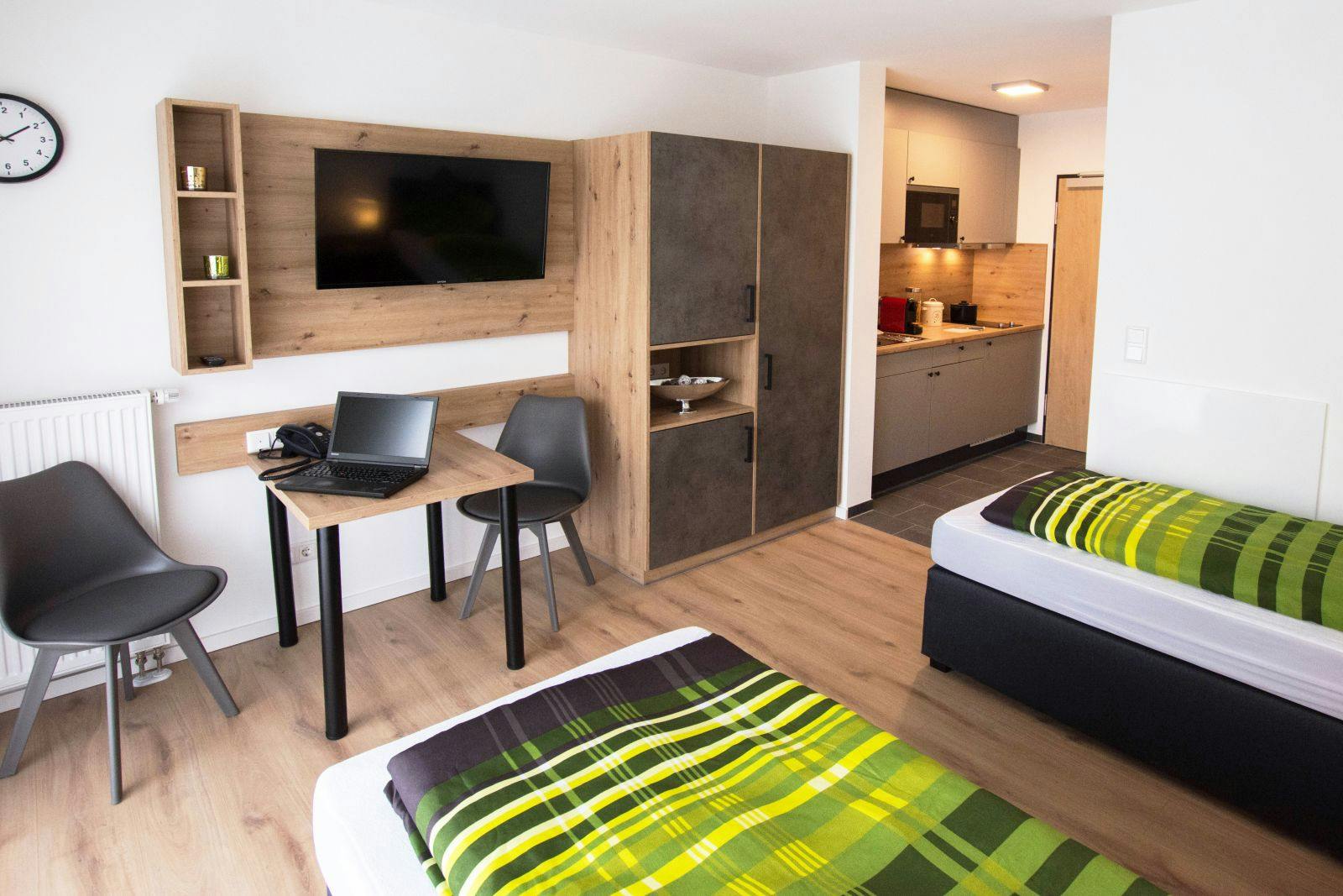 🌟 Modern & Comfortable Apartment in Munich’s Lochhausen District! 🌟 🏡 Apartment Overview Welcome to this stylish and well-equipped 22m2 comfort apartment in Henschelstraße, Munich. Designed for a seamless living experience, this bright and tastefully furnished space offers modern amenities and a functional layout perfect for long-term stays. Whether you're a student, professional, or traveler, this cozy apartment ensures a hassle-free and comfortable stay. 🛏️ Living & Sleeping Space This apartment features a spacious living and sleeping area, complete with two comfortable single beds, a dining table for two, and a large wardrobe for storage. The floor-to-ceiling windows with soundproof elements ensure a peaceful atmosphere, while a 40” Smart TV allows you to stay entertained with your favorite content. 🍽️ Fully Equipped Kitchen Enjoy the convenience of a self-catering kitchenette with: ✔️ Microwave with grill function ✔️ Spacious refrigerator with freezer ✔️ Ceramic cooktop and stainless-steel sink ✔️ Capsule coffee machine for a perfect start to your day 🚿 Modern Bathroom A sleek 4.5m2 private bathroom includes a walk-in glass shower, a large mirror, and a hairdryer for added convenience. 🌿 Private Terrace & Outdoor Space Step outside to a 9.6m2 covered terrace with garden furniture, where you can unwind after a long day. Smoking is permitted in this outdoor space. 📍 Prime Location & Connectivity Located in the peaceful Lochhausen district, this apartment is just 400m from Lochhausen S-Bahn Station, providing direct access to Munich city center in minutes. Nearby attractions include: 🚆Munich-Pasing Train Station (6.9 km) 🏰Nymphenburg Palace (10 km) 🎡Olympic Stadium & Olympiapark (14 km) 🌳Aubinger Lohe Forest (2.6 km) 🛒 Amenities & Services ♿ Elevator & wheelchair accessibility 🛍️ Minimarket on site 🏢 Concierge & express check-in/out 💬 Send a message today to make this modern apartment your home in Munich!...