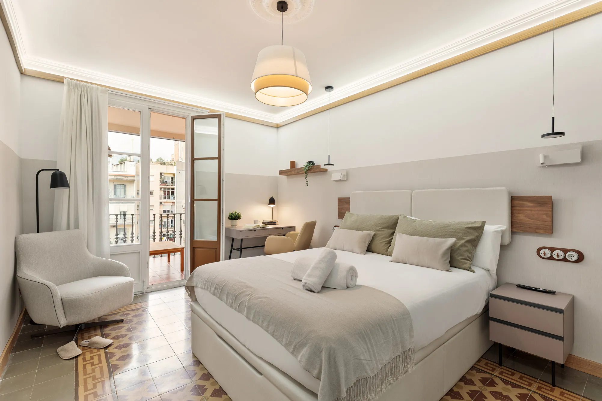 Newly renovated 4-bedroom, 4-bathroom apartments with a modern and elegant style. They are located in the attractive L\'Eixample neighbourhood, on one of the most sought-after pedestrian streets in the city. Consell de Cent has been included in the ranking of streets with the most personality in the world. It is full of restaurants, shops, meeting places and art galleries, it is an exceptional way to discover the soul of Barcelona. A central and well-connected location, 5 minutes\' walk from Plaça Cataluña and the Plaça Universitat and Passeig de Gràcia metro stations, which connect to the whole city. They have mosaic floors and high ceilings, typical of the Barcelona architectural style. The apartments are exterior-facing and have a terrace, air conditioning, heating and Wi-Fi connection. The living room has a comfortable sofa and seating area. The kitchen is fully equipped with oven, microwave, fridge, ceramic hob, washing machine and dryer. The bedroom has a private terrace and an en-suite bathroom. It also has a TV, a large desk, a bedside table and a wardrobe. Towels and bed linen are provided upon arrival. The apartment has home automation details that will make your stay much more comfortable and safe: the lift has direct and exclusive access to each apartment, which is only accessible to guests via a code. Electronic key security both at the apartment entrance and in each room. Adjustable lighting in both the living room and bathrooms, the latter with mirror mode functions for use. The apartments may vary in terms of the floor mosaics and some decorative details in the common areas. Upon arrival, a specific apartment will be assigned. - Prices for bookings of at least 3 months. For shorter bookings, please check prices. Accommodation rates and management fees are subject to the length of the contract and the advance booking date. Rent: €1320 + €90 utilities Deposit: €1,300 (subject to length of stay) Final cleaning: €100 - Agency fees: * 1-2 months: €650 + VAT * 3-5 months: €750 + VAT * 6-9 months: €900 + VAT * 10-11 months: €1.200 + VAT No parties allowed. Our reception is located at 1 Passatge Sert, where you can collect your key between 9:00 and 19:30 Monday to Friday (except public holidays). If your arrival is on Saturday or Sunday (or a weekday public holiday), key collection is at 228 Aribau Street. For business bookings, 21% VAT must be added to the published price. This room is rented exclusively for recreational, vacation, or long-term tourist stays Gran Tenedo...