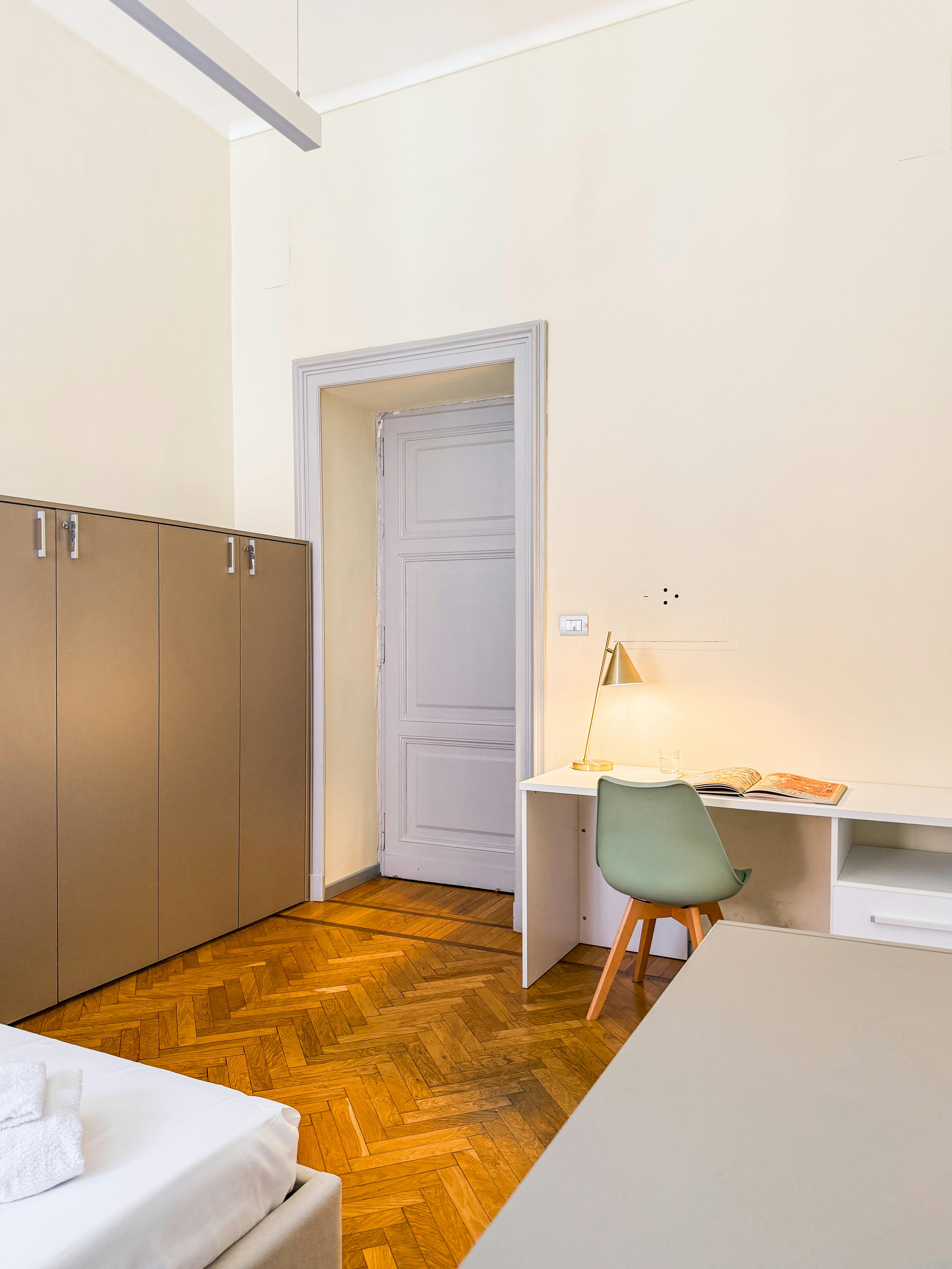 ITA Appartamento ristrutturato situato a 5 minuti a piedi da Piazza Castello, completo di letti, scrivania, sedie, luci e armadio. Cucina in comune attrezzata con pentole, piatti, bicchieri, posate, forno, piano cottura a induzione. Bagno con doccia e lavatrice in comune. Ampia zona giorno per 3-6 persone completa di tavoli e sedie. Riscaldamento centralizzato, servizio di portineria 8.30-12.30 / 14.30-18.30. Bollette e servizio di pulizia settimanale incluso. La zona intorno a Corso Re Umberto a Torino si trova nel cuore pulsante della città, offrendo un accesso privilegiato a tutte le sue attrazioni. Grazie alla sua posizione centrale, è ben collegata a tutti i mezzi di trasporto, facilitando gli spostamenti per gli studenti dell'ESCP e per chiunque voglia godere delle comodità del centro di Torino. ENG Renovated apartment located at 5 min walk to Piazza Castello, complete with beds, desk, chairs, lights and wardrobe. Shared kitchen equipped with pots, plates, glasses, cutlery, oven, induction hob. Bathroom with shared shower and washing machine. Large living area for 3-6 people complete with tables and chairs. Central heating, concierge service 8.30-12.30 / 14.30-18.30. Bills end weekly cleaning service included. Welcome ESCP. The area around Turin's Corso Re Umberto is located in the beating heart of the city, offering prime access to all its attractions. Because of its central location, it is well connected to all means of transportation, making it easy for ESCP students and anyone who wants to enjoy the conveniences of downtown Turin to get around. Important information: Utilities are included in the rent. In case of unusually high consumption, a final adjustment may be applied at the end of the contract and any additional amount will be charged accordingly. Please note that an administration fee equal to 8% of the total rent (calculated on the full duration of the stay) applies. This fee covers contract management, support throughout the stay, and assistance during check-in and check-out, and should be paid prior to move in...