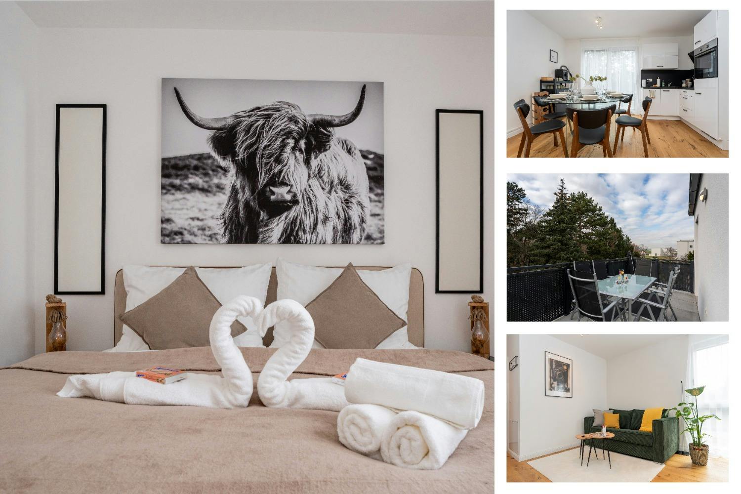 Welcome to NobleNest in Vienna! Our charming apartment promises an unforgettable stay: - Spacious outdoor dining area - Fresh coffee from the fully automatic coffee machine - Public transportation to the city center within walking distance - Large smart TV with Dolby Atmos system, including NETFLIX & Disney+ - Fully equipped kitchen - 2 bedrooms with box spring beds - Sofa bed Discover Vienna from a central location and experience the luxury of NobleNest. We look forward to hosting you! Experience pure comfort in our bedrooms featuring a king-size and queen-size bed. The high-quality box spring beds and exterior blinds create the perfect sleeping environment. In the fully equipped kitchen, complete with a stove, dishwasher, refrigerator, and everything you need for delicious cooking, modern convenience meets the enticing aroma of freshly brewed coffee from the fully automatic coffee machine. The spacious bathroom surprises with a walk-in shower and a practical washer-dryer – fresh towels, shower gel, and shampoo are, of course, included. A hassle-free self-check-in allows for flexible arrivals. Additionally, a dining area with seating for 5 is naturally available. Make use of the workstation for productive hours or dive into the world of entertainment with the smart TV, offering streaming options like Netflix and Disney+. Board games provide a warm, family-friendly atmosphere. Look forward to first-class comfort in our inviting nest – a home for an unforgettable stay. The entire apartment is at your disposal. Make yourself feel right at home! We are available to you at all times during your entire stay, whether by phone or through the (hidden) app. There is no on-site staff. Your well-being is important to us! We provide high-quality bed linen and towels. Additionally, a welcome set with coffee and tea awaits you. Shower gel & shampoo are, of course, also available. Look forward to a charming surprise from a local, family-owned cosmetics manufacturer – a special gesture that has something for everyone! Additional services: - Late check-out and early check-in are subject to availability and can be booked for an additional fee. - Cleaning during the stay can also be booked for an additional fee. Before check-in, a registration form must be filled out. There are also house-rules that need to be accepted before Check-In. You will get the house-rules before you Check-In. Check In: 15:00 Check Out: 11:00...