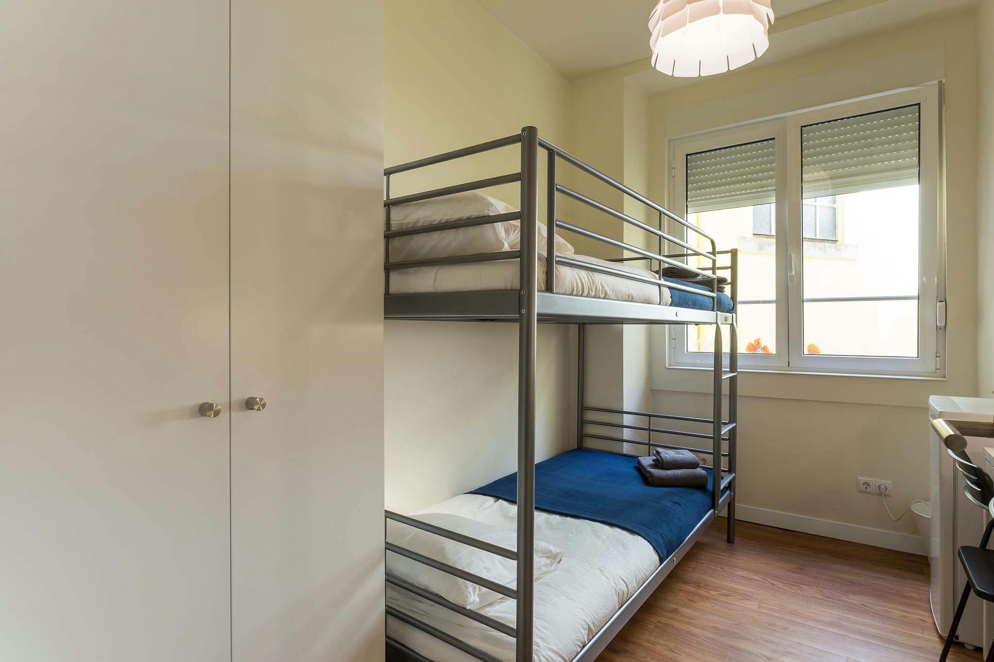 Bedroom in an apartment with 6 bedrooms. The room is equipped with a bunk bed. It also has a key and can be locked for your privacy. The room includes a TV, a desk, a lamp, a wardrobe, as well as a small fridge with a freezer compartment and a kettle. We clean the common areas daily, including providing liquid soap and toilet paper. A monthly cleaning of the room is also included, which includes changing the bed linen and towels. In the kitchen, there are 2 large combined refrigerators, one for each floor. A hairdryer is provided in the bathrooms. On each floor, there is also a set of irons and ironing boards available. Please Note: - Children under 16 are not allowed. - Smoking is not permitted indoors, but there are several designated areas for smoking in the garden, on the terrace, and on the balconies. - The mentioned price is for one person, and an additional charge of 100 euros applies for each extra person...