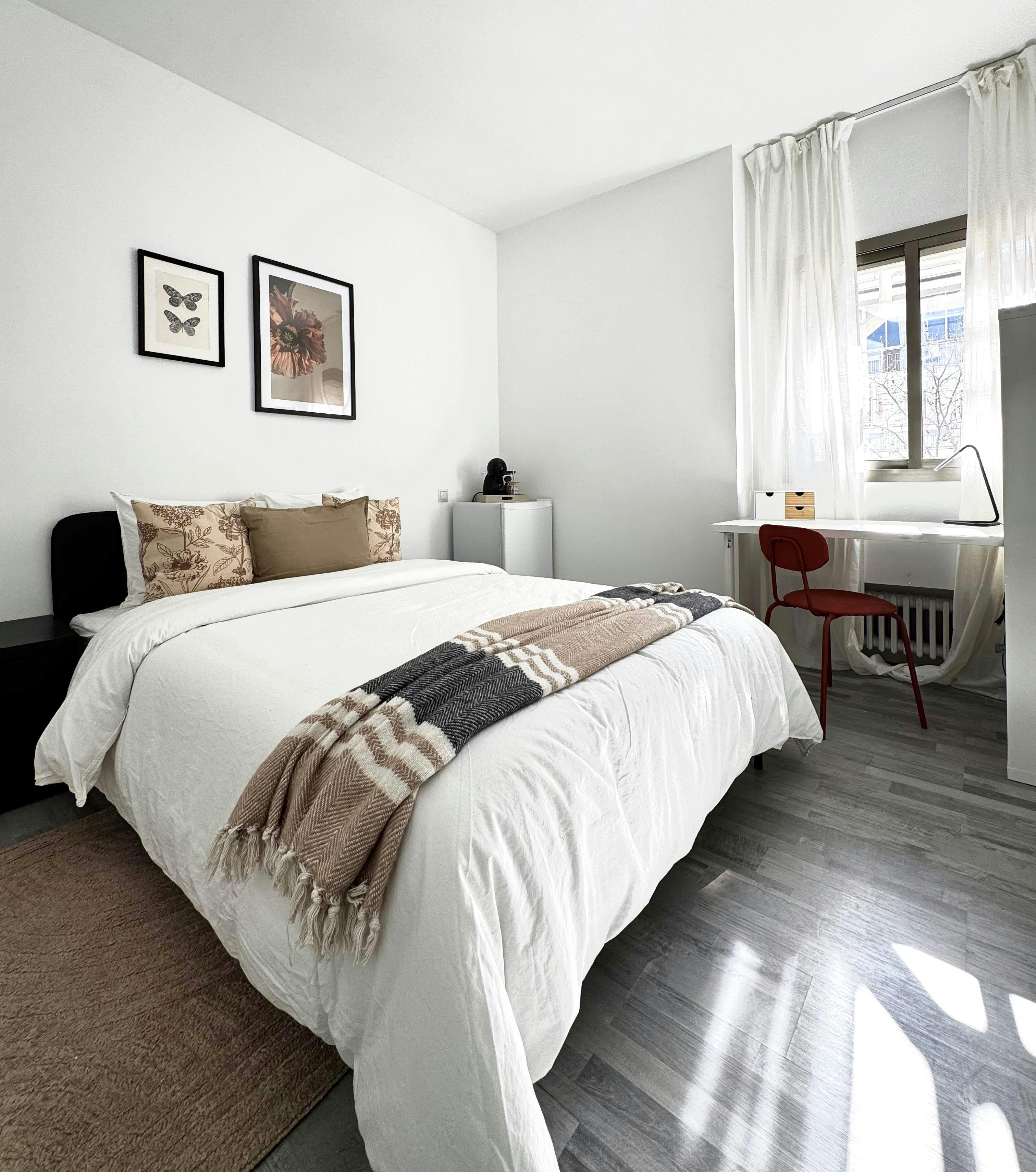 🏡 Cozy room in the heart of Madrid! 🛏️ About your room: This beautiful bedroom offers a king-sized bed, a wardrobe, a full length mirror and a desk. The modern decorative touches make this room vibrant and perfect for studying or working. You will also have access to a personal mini-fridge and a coffee machine. The room has a lock on the door, so you can enjoy your privacy. 🍳 About the apartment: The modern kitchen, which you share with other tenants, is fully equipped, with a washing machine, a dishwasher and cooking utensils available. The shared bathrooms have a standing shower, a sink, and a toilet each. There is also a common eating area connected to the kitchen .All common spaces are cleaned once a week. This apartment is only available for women. 📍 About the area: The location is unbeatable, close to the Instituto de Empresas (IE), Paseo de la Castellana and Av. América. A few minutes walk away you will find the Gregorio Marañón metro station (Lines 7 and 10), as well as having access to restaurants, shops and large supermarket chains. You also have transport options such as buses, bicycles and carsharing at your disposal. Exclusive benefit for our residents: Thanks to our collaboration with Banco Sabadell and Sanitas, you will be able to access a free bank account, without commissions, with a debit card included, and a Sanitas health insurance with the best conditions on the market! Contact us today! 🔔 The €150 move-out cleaning fee will be deducted from the deposit. At the end of the contract, the tenant must pay a final administrative fee of 160 euros (“Exit Fee”), intended to cover the costs associated with the management and preparation of the property after it has been returned. This fee includes, among others: 🔸 The final complete cleaning of the property. 🔸 A monthly deep cleaning of the common areas, in addition to the weekly surface cleaning provided during the stay. 🔸 The replacement and/or refurbishment of minor items such as dishes, kitchen utensils, or other household goods. 🔸 The repair of small marks or stains on the walls resulting from normal use....