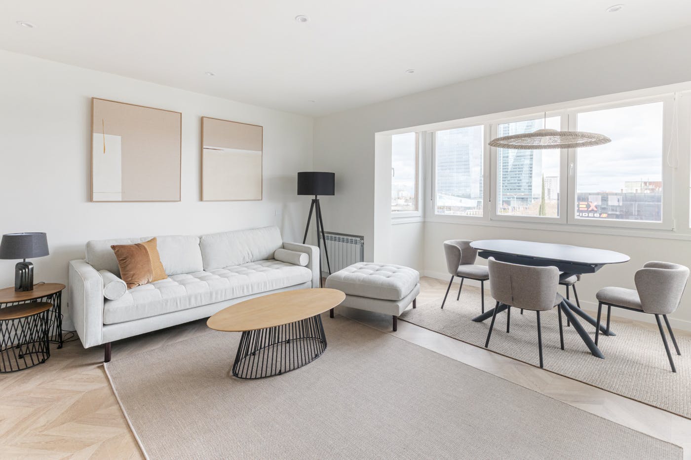 *Monthly rental apartment (from 32 days to 11 months).* This spacious 2-bedroom, 2-bathroom apartment is located in a prime area of Chamartín. It stands out for its spaciousness, functional layout, and abundant natural light thanks to its large windows. The living-dining room is spacious and comfortable, with a modern design that provides plenty of light. It has comfortable sofas, a TV, and a dining table, ideal for working from home with its stunning views of the city. The open-plan kitchen with a modern island is fully equipped with top-of-the-range appliances. It offers everything you need for comfortable cooking, including an oven, microwave, and dishwasher. It also includes a washing machine and dryer. The apartment has two bedrooms. The master bedroom is en suite and has a double bed, built-in wardrobes, and a bathroom with a shower. The second bedroom, also spacious, has a single bed, storage space, and a table and chair in case you need to work or study. Finally, a second bathroom with a shower. Chamartín is one of the best areas of Madrid to live, with numerous shops, restaurants, and green areas nearby. In addition, it is close to important business, educational, and business centers such as the Cinco Torres. The apartment has excellent transport connections: a nearby metro station and several bus lines that facilitate mobility to any point in the city, such as Chamartín station (L1 and L10) a 5-minute walk away and Begoña (L10) a 12-minute walk away, as well as Plaza de Castilla (L1, L9, L10) a few minutes away with many transport lines. An excellent option for those looking for comfort, spaciousness, and a strategic location in Madrid. SERVICES INCLUDED: - Check-in (after 15:00h) and Check-out (before 12:00h) in the apartment - Regular cleaning and linen change, - WIFI included in all our apartments - Maintenance included (For damage due to normal use) - Fully equipped and furnished apartments - Multilingual manager assigned during the entire stay REGISTRATION (empadronamiento): only possible for stays longer than 6 months Be aware that HousingAnywhere is an online booking platform. Therefore exchanging CONTACT DETAILS and offering VIEWINGS is NOT POSSIBLE. The platform keeps your payment safe until 48 hours after your move-in date. In case the accommodation is not as advertised, you will be entitled to get a refund....