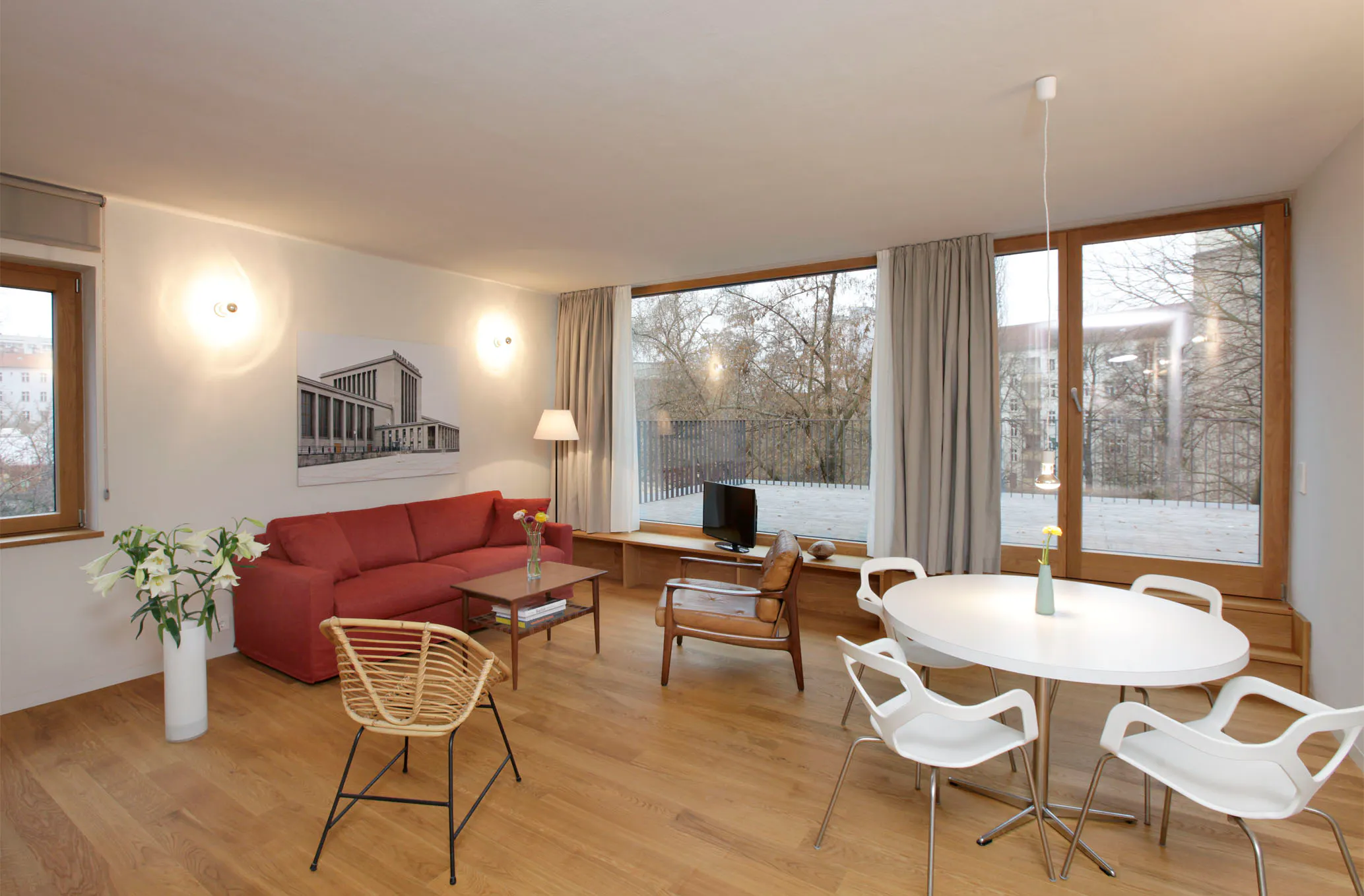 72 m2 / 2 Rooms / very quiet apartment on the 2nd floor with spacious rooftop-terrace / 2 Single beds, 1 comfortable sofa-bed (180 cm wide) Apartment offers: High Speed Internet, TV, DVD, HIFI, Washing Machine, Dryer, Dishwasher This apartment is truly unique. It is located extremely centrally on the border between the fashionable districts of Mitte and Friedrichshain. The Alexanderplatz is an easy 15 minutes' walk or two U-Bahn stations away. The building, a renovated Washhouse of the most magnificent building on the famous Karl Marx Allee (Block C-Sued), is situated on a huge park-like estate. The lush garden is shielded from the hustle and bustle of the city by the surrounding architecture and with its large old trees provides a uniquely idyllic retreat after an exciting day in the city. The building has been designed as a low-energy building and constructed according to the highest ecological standards. Premium quality materials and details, such as solid oak flooring, oak windows with triple glazing and clay plastered interior walls provide a healthy living environment and a comfortable atmosphere. A huge rooftop terrace offers a splendid view of the ample verdant garden. The apartment is generously furnished (LED flat-screen TV, DVD player, HIFi etc.), comes with a fully equipped modern kitchen, a bedroom for two persons and a spacious living room with a top of the range German-made sofabed that converts into a very comfortable bed for two occasional guests (180 cm wide and 200 cm long). Towels, linen and extra large comforters (220 x 150 cm) are provided. The interior furniture and fittings, too, have been carefully selected with a view to providing a healthy living environment. Towels, linen and extra large comforters (220 x 150 cm each) are provided. The bathroom contains a spacious bath tub for two with centrally-positioned drain and shower partition, WC and washbasin. Washing mashines and dryers are available in the building. Parking your car is easy, as the apartment disposes of its own parking space on the premises...