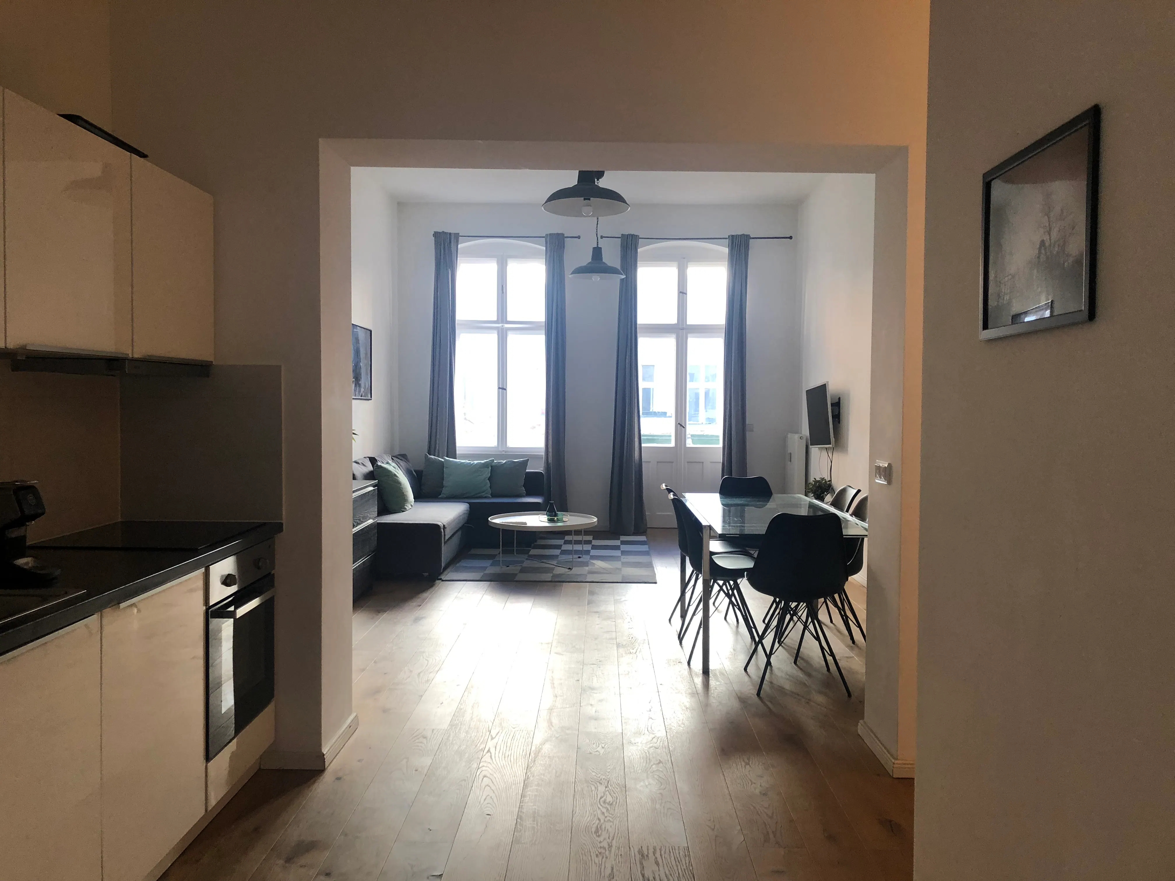 🏡 Spacious & Stylish 2-Bedroom Apartment in Vibrant Wedding ✨ The Apartment:Welcome to this stunning and spacious 2-bedroom apartment, perfect for couples, small families, or professionals! The apartment boasts a bright and airy living room with large windows, high ceilings, and a cozy seating area featuring a sofa bed and a TV. Adjacent to the living room, you'll find a dining area with a table for six, ideal for gatherings or family meals. The fully equipped open kitchen includes modern appliances such as an electric hob, oven, large fridge, dishwasher, and washing machine, making meal preparation effortless. The sleeping arrangements consist of two beautifully furnished bedrooms: one medium-sized and one exceptionally large master bedroom with an en-suite bathroom. Both bedrooms include comfortable double beds with quality mattresses, nightstands, chests of drawers, and spacious wardrobes. The apartment also features a second bathroom, both equipped with a toilet and shower. A small balcony offers a cozy outdoor space, perfect for enjoying fresh air and city views. The elegant parquet flooring and central heating ensure a warm and inviting atmosphere year-round. 🏢 The Building:Located on the 2nd floor of a well-maintained Altbau front building (VH), the apartment offers a charming blend of historical character and modern comfort. Enjoy a picturesque green courtyard view from both bedrooms, while the living room overlooks a lively street. 📍 The Location:Situated in the heart of Wedding, this apartment is nestled on a quiet street within a bustling neighborhood. You'll have everything at your doorstep—shops, supermarkets, restaurants, bakeries, cafés, a theater, a cinema complex, and a variety of museums and art galleries. The area is home to a diverse community, including families, students, and professionals, thanks to its proximity to four universities. For nature lovers, the beautiful Volkspark Rehberge is just a short stroll away, offering a perfect escape for outdoor activities and relaxation. 🚆 Public Transportation:Excellent public transport connections ensure seamless mobility: U6 Seestraße U-Bahn station (6-minute walk) U9 Amrumer Straße U-Bahn station (9-minute walk) Trams 50 & M13 (5-minute walk) This well-connected and beautifully furnished apartment is ready to become your next home!...