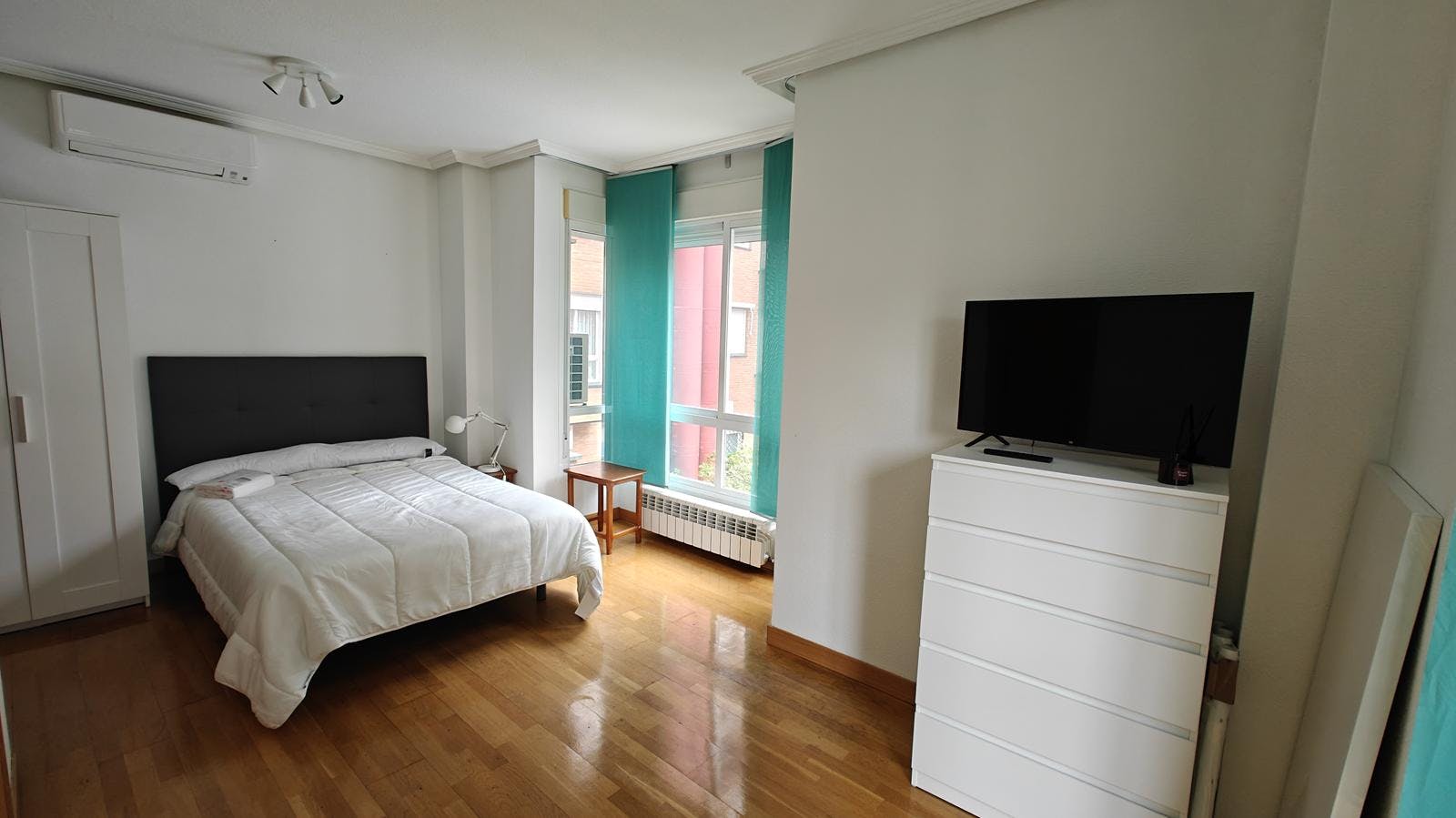 iRent Madrid alquila habitación MUY amplia, exterior y con baño privado. La habitación cuenta con una cama doble, armario de tres puertas con espejo, cómoda de 5 cajones, escritorio con silla (no visible en la foto), mesilla de noche, ropa de cama, televisión, aire acondicionado y baño privado con plato de ducha. El inmueble cuenta con otras tres habitaciones y dos baños. Cocina totalmente equipada con dos neveras, horno vitrocerámica, campana extractora, microondas, lavadora y utensilios y mensaje de cocina. Acceso a la azotea con tendedero. Situada en una urbanización privada, con piscina y portería física. En el distrito de Ciudad Lineal, cerca del Metro Alsacia (Línea 2). Todos los suministros (electricidad, agua, calefacción, Wifi Internet y limpieza semanal de zonas comunes) por 50€/mes. Se pide una mensualidad de fianza y una mensualidad (más IVA) de honorarios de agencia...