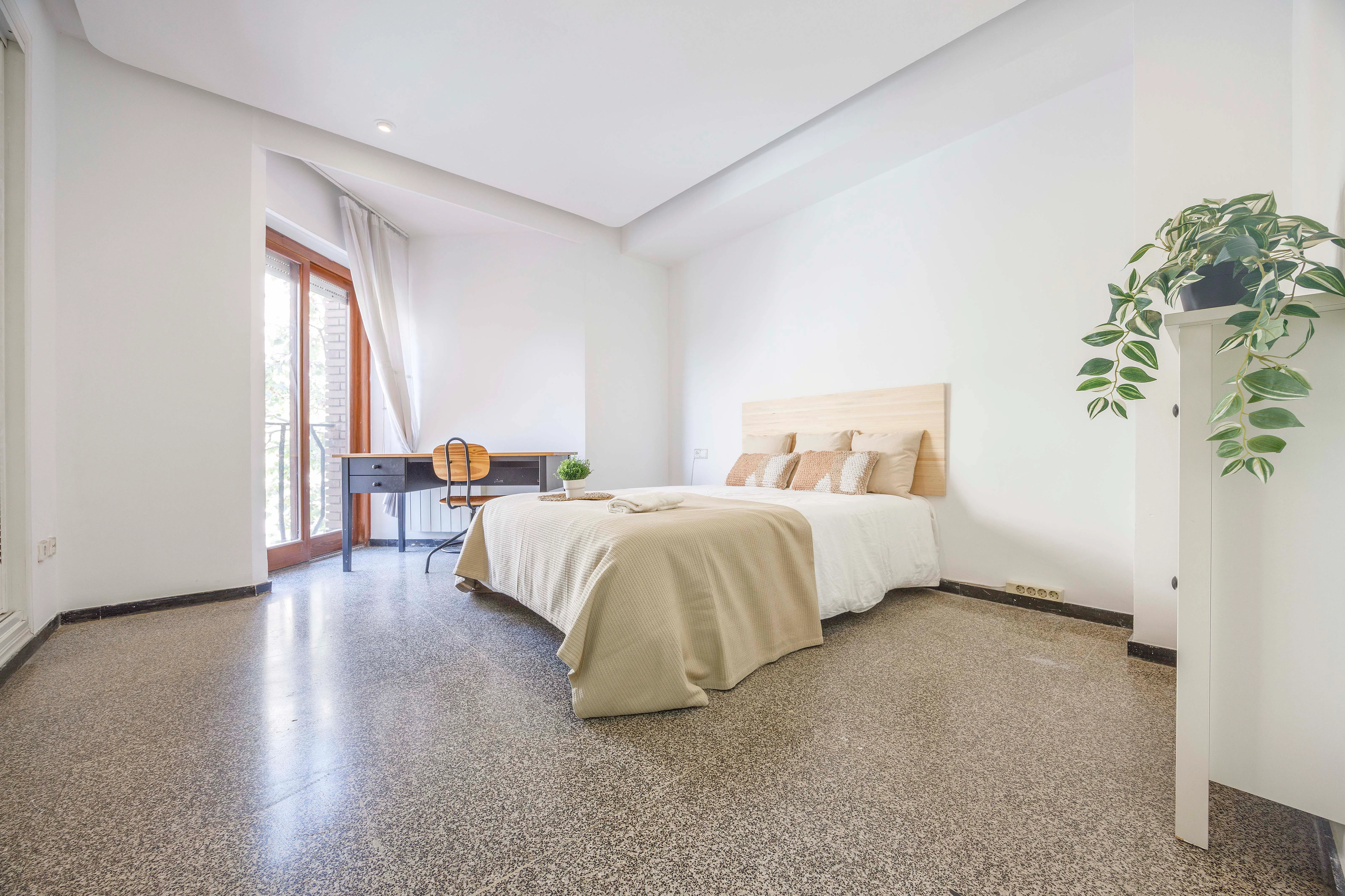 ROOM: Double room with Private bathroom near the center of Valencia. It is a very good option if you are a student or young worker and you want to spend some time in the beautiful city of Valencia. It is a fully equipped and furnished room: - Bed 135x190cm - Private bathroom outside the room (with lock) - Wardrobe - Desk with lamp and chair - Bedside table - Shared balcony - Lock for your privacy - AC APARTMENT: The flat is very spacious with 180m2 and has 3 bedrooms and 3 full private bathrooms. The common areas are really nice, especially the big living room with a charming balcony. It also has a fully equipped kitchen with: - Ceramic hob - Refrigerator - Oven - Microwave oven - Crockery and cutlery EXPENSES: The rental price includes internet and a weekly cleaning of the common areas. The costs of utilities are as follows: -Water: 10€/month -Gas: 15€/month -Electricity: 25€/month, if any month the consumption is more than this, the difference will be paid separately. In this case, the expenses are shared equal parts between the tenants. CLEANING SERVICE: We offer a free cleaning service once a week of the communal areas. It is the tenant's responsibility to keep the flat clean, tidy and in good condition. Our cleaning service is mainly to help you with the cleaning, but it is important to keep everything clean. Cleaning products must be provided by the tenants. You can find a list of the necessary cleaning products in the flat. BEDROOM CLOTHING: For a hygienic reason, we do not provide any bed linen, neither pillow, duvetor duvet cover. CHECK IN AND CHECK OUT: Check in will take place at the office. Once your booking is confirmed, you will receive details of how to get to the office, but it is within easy reach of the airport. We will meet you here to complete the payments, sign the rental contract and provide you with a set of keys to your new home. Check-in hours will be from 16:00 to 20:00. If you arrive in Valencia earlier you can leave your luggage in my office in the meantime. If you arrive later than 8:00PM we will leave the keys at a 24H point, where you can pick them up. Check out will be at the latest on the last day of the rental contract at 11:00AM. If your flight is after this time, you can leave your luggage here at the office free of charge...