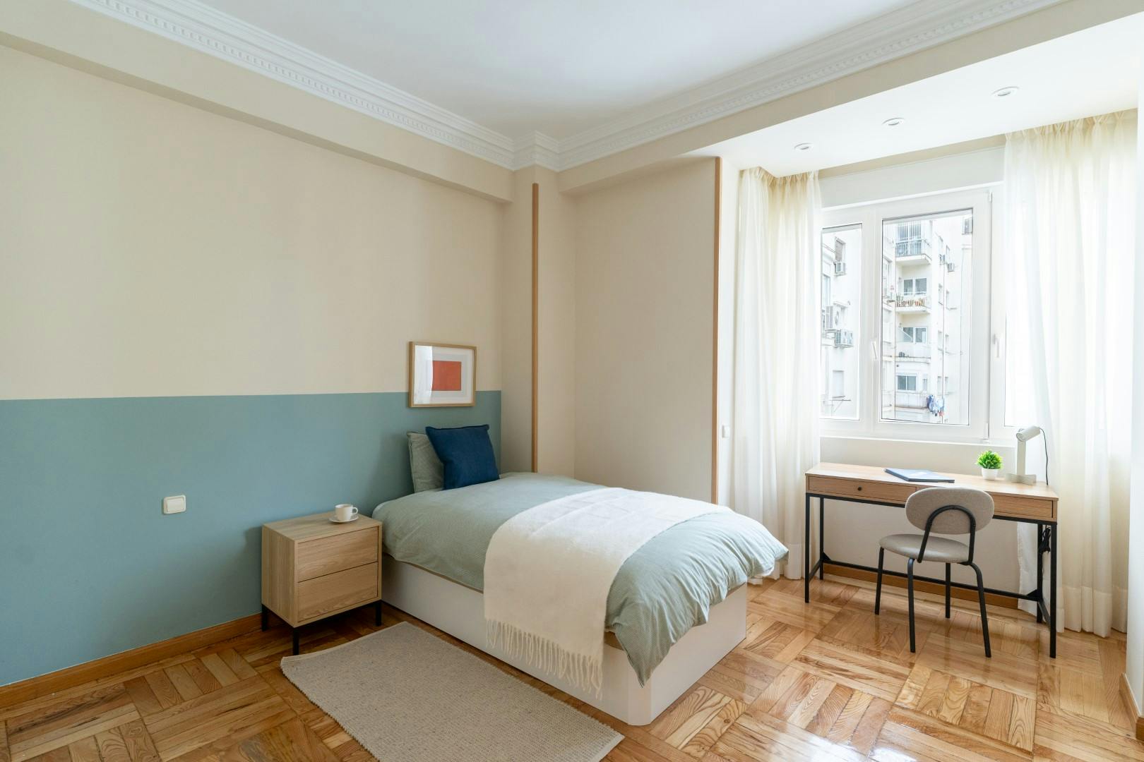 🌞 This cozy and inviting room is perfect for students, professionals, or travelers seeking comfort and convenience in one of Madrid's most tranquil neighborhoods! ❤️ 🏢 Apartment This spacious apartment offers a fully equipped kitchen, complete with a washing machine for added convenience. The shared living area features a comfortable sofa and a TV, perfect for relaxing or entertaining. The bathrooms are shared and well-maintained, providing all the necessary amenities. 🛏️ Your room The room includes a comfortable bed, a practical desk for work or study, and a closet for all your storage needs. The space is bright, providing a peaceful environment perfect for both relaxation and productivity. ❗ Please note: - The accommodation surface area shown in the listing is not accurate, and it is just an indication of the size of your bedroom and the apartment. 🌳 Neighborhood: Living on Calle de Santiago Bernabéu puts you right in the heart of one of Madrid’s most well-connected and vibrant neighborhoods. You won’t have any trouble getting around—the Santiago Bernabéu metro station (Line 10) is just steps away, making it super easy to reach any part of Madrid. A bunch of bus lines also run through the area, so whether you’re heading to work, class, or out for the evening, transport is quick and reliable. Need a bit of fresh air or a nice place for a stroll? Head over to Parque de Berlín, a beautiful local park that’s perfect for walks, picnics, or just chilling out under the trees. You’ll also find plenty of cafés, supermarkets, pharmacies, and shops nearby—everything you need for everyday life is just around the corner. 📨 Send me a message or a booking request. 👤 Include your age and occupation in your message. I look forward to hearing from you and helping you make this beautiful apartment your new home! �...