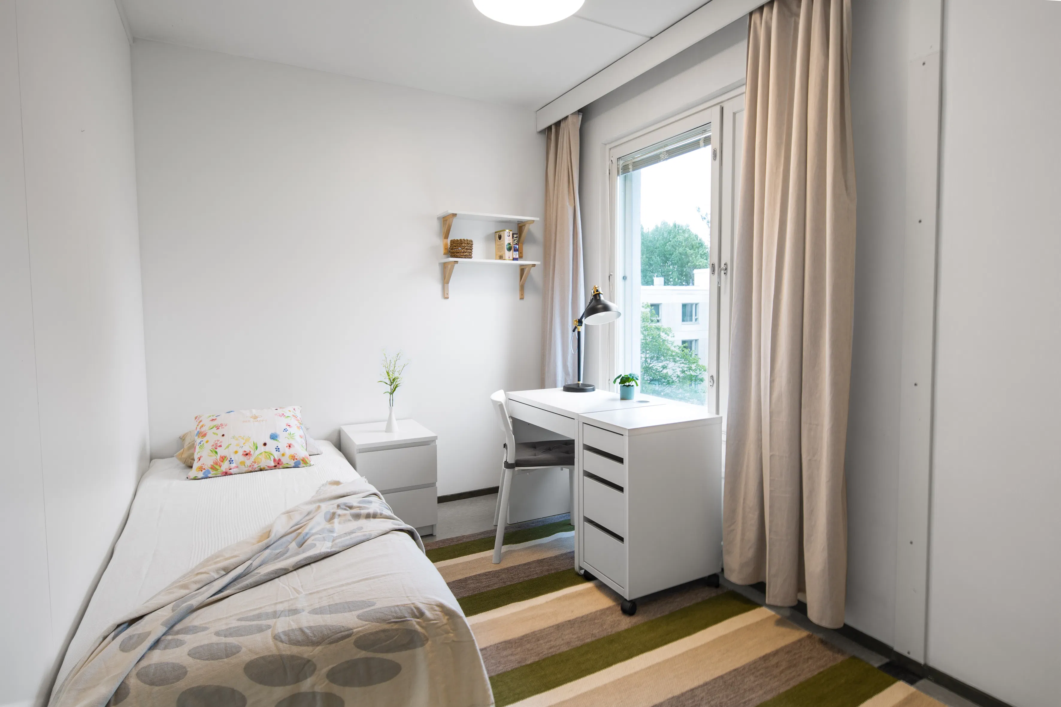 *** LOCATION, LOCATION, LOCATION *** *** All-inclusive rate: water, electricity, heating, internet *** *** Safe area close to city centre, excellent public transportation options *** *** We are a registered Finnish company with English customer service *** ROOM A stylish, furnished 10sqm room in a renovated building in Pasila, on the 5th floor. This room has Nordic-style furniture, everything you need for a comfortable daily life: a bed, night table, desk space, chair, lamp, wardrobes, window blinds, and bedlinen – you will have less to worry, and you can focus on getting the most out of your stay! APARTMENT & BUILDING This apartment has a fully-equipped kitchen to ensure you will be able to prepare your favorite daily meals. The fixtures include: • cooker/oven • microwave oven • fridge/freezer • washing machine • iron/board • coffee machine & electric kettle • kitchen utensils • vacuum cleaner • WiFi This high-rise building has an elevator, a sauna, and a laundry room. Extra luggage and belongings may be stored in the apartment’s dedicated storage space. Bicycles, and outdoor activity equipment have their own dedicated storage space. LOCATION & DISTANCES This apartment is very centrally located with its own character and commercial flavor. Total travel time to city Centre is 15mins. Bordering Central Park to the west, Käpylä to the North, Alppila to the South and Vallila to the East, Pasila is a commercially active area with wide selection of services. This is a safe Helsinki locality around the clock. Pasila is famous for Mall of Tripla – the largest mall in Northern Europe in terms of number of outlets. The mall is also a key hub for public transportation. There are over 250 stores including indoor surfing and volleyball, bars, restaurants and a movie theater. The mall is within a short walking distance from the apartment. Moreover, Helsinki Exhibition Center and Helsinki Arena – the largest event venues in Finland, are situated in this area. Pasila is also the home for high-quality Finnish education institutions such as Haaga-Helia University of Applied Sciences and Helsinki Business College. Transportation options are excellent and include busses, trains and trams. The area offers a wide range of services from grocery shops to sports facilities, which should cover your needs. Below a list of select local amenities along with estimated distances and travel times: • Central train station/city center – 3.7km / 15mins • Grocery shop/ATM – 150m / 2mins • Pharmacy – 700m / 9mins • Käpylä Swimming hall – 450m / 6mins • Haaga-Helia University of Applied Sciences – 800m / 10mins • Helsinki Business College – 700m / 8mins • Helsinki University – 4.4km / 28mins • Stadin Ammattiopisto – 600m / 7mins • Helsinki Arena – 1.5km / 14mins • Helsinki Exhibition Center – 650m / 7mins • Library – 650m / 8mins • Holiday Inn – 700m / 8mins • Hospital – 1.5km / 17mins • Dentist – 60m / 1mins POLICIES & DOCUMENTS REQUIRED • Passport / official ID of the tenant • Rent payment: 2nd of each month • Payment method: bank transfer BOOKING • All the payment information and fees over your stay are detailed here on HousingAnywhere • After the booking is completed, we will prepare your Tenancy Agreement • Keys will be delivered and arranged against the completion of payments MOVE-IN • Keys will be delivered to our key service partner near the apartment following the completion of payments • You will be able to pick-up the keys at a time most convenient to you typically from 08:30 – 21:30 Monday to Sunday • You will need to prove your identity at the pick-up LANDLORD We are a registered Finnish company founded in 2005, specializing in fully furnished stylish private rooms in central locations with all-inclusive rates. We are the top advertiser in Finland with over 350 successful bookings through Housing Anywhere. We manage only our own properties. We are driven by passion to offer tenants around the world a simple moving process, superior customer service and an enjoyable stay. We have the honor to host +150 tenants annually in our apartments that are on average less than 15mins from Helsinki city center. Our team is dedicated of making your move-in as effortless and stress free as possible. Regardless of the tenure of your stay, we have the perfect option for you. We welcome you to join our community of international residents, and allow us to offer you a place to stay. We are looking forward hearing from you. *** Please be aware that HousingAnywhere is an online booking service, and the policy does not allow exchanging of contact information or apartment viewings. If you would wish to book an apartment through us, kindly send us a message or booking request, and we will address all your inquiries....