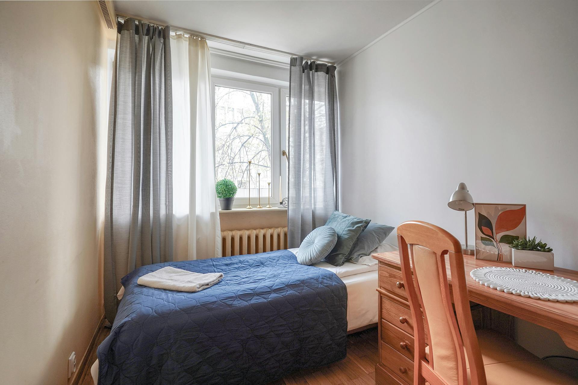 Spacious room in 4-Room Apartment for Rent in Warsaw – Ideal for Students and Working Professionals This fully furnished 4-room apartment is located in a quiet and well-connected area of Warsaw, making it the perfect and young professionals. The apartment is spacious, modern, and designed to offer comfort and convenience for both studying and working from home. Key Features: Size & Layout: The apartment covers [insert square meters] and consists of three well-sized rooms: a cozy living room, two private bedrooms, and a fully equipped kitchen. There is also a stylish bathroom with a shower, along with a separate toilet for added convenience. Location: Situated in a peaceful neighborhood, the apartment is just a short distance from public transport links, including bus and metro🟠 stations, which makes it easy to reach universities, offices, and other key areas in the city. Grocery stores, cafes, and restaurants are within walking distance. Furniture & Amenities: Each room is fully furnished with comfortable beds, desks for studying, and ample storage space. The living room features a comfortable sofa and a flat-screen TV, perfect for relaxing after a long day. The kitchen includes all necessary appliances: a refrigerator, oven, stove, microwave, and a washing machine. Internet & Utilities: High-speed Wi-Fi is available throughout the apartment, making it easy for students to attend online classes or for professionals to work remotely. Utilities, including water, electricity, and heating, are included in the rental price. Security & Comfort: The building is secure with 24/7 surveillance, ensuring peace of mind for residents. The apartment has central heating and large windows, providing plenty of natural light throughout the day. Ideal for Students & Professionals: Whether you're a student looking for a comfortable study space or a working professional in need of a peaceful and well-connected home, this apartment offers the perfect balance of comfort, convenience, and affordability. -------------------- Landlord policies •⁠ ⁠We book fortnightly. Meaning contract can start on 1st or 16th day of the month. And they can end on 15th or last day of the month. •⁠ ⁠Self check-in. You will receive all access codes and instructions before arrival. Check-in is possible at any time •⁠ ⁠You're renting for up to 30 days - no Admin Fee. 31-60 days - 50% of monthly rent Admin Fee. 61+ days - 100% of monthly rent Admin Fee. •⁠ ⁠When the booking is accepted Tenant should provide the security deposit to the Owner by a bank transfer •⁠ ⁠Your contract start date should be the first available day in the calendar. ALL TENANTS ARE OBLIGED TO PAY THE ADMIN FEE TO THE LANDLORD DIRECTLY. At the day of arrival or up to 3 days after arrival. •⁠ ⁠If you rent for one month you dont need to pay the admin fee. Preferred age 19-30! •⁠ ⁠Security deposit is paid in full at the beginning Admin FEE Includes following services: •⁠ ⁠Helping to choose the best accommodation suitable for your needs, •⁠ ⁠contract preparation, •⁠ ⁠Translation of the contract to English, •⁠ ⁠Room preparation with set of bed linen, •⁠ ⁠Payment for airport transfer from Chopin airport or place where are you staying in Warsaw to your new flat, •⁠ ⁠Issuing all necessary documents required to obtain PESEL number or „zameldowanie", - representing you in communications with flat owner. •⁠ ⁠Taking care of keeping flat in good technical condition for use when issues arise, and they are not tenant fault. •⁠ ⁠Cleaning service that comes once every two months to clean the kitchen and bathroom •⁠ ⁠Final cleaning + 400 PLN when You're leaving the apartment. •⁠ ⁠Single Occupancy Only •⁠ ⁠There is a weekly tidiness control that is carried out by sending a video of bathroom and kitchen to the landlord. Each week different room is responsible for sending the video. So in 3 person apartment it will be Your responsibility once every 3 weeks...