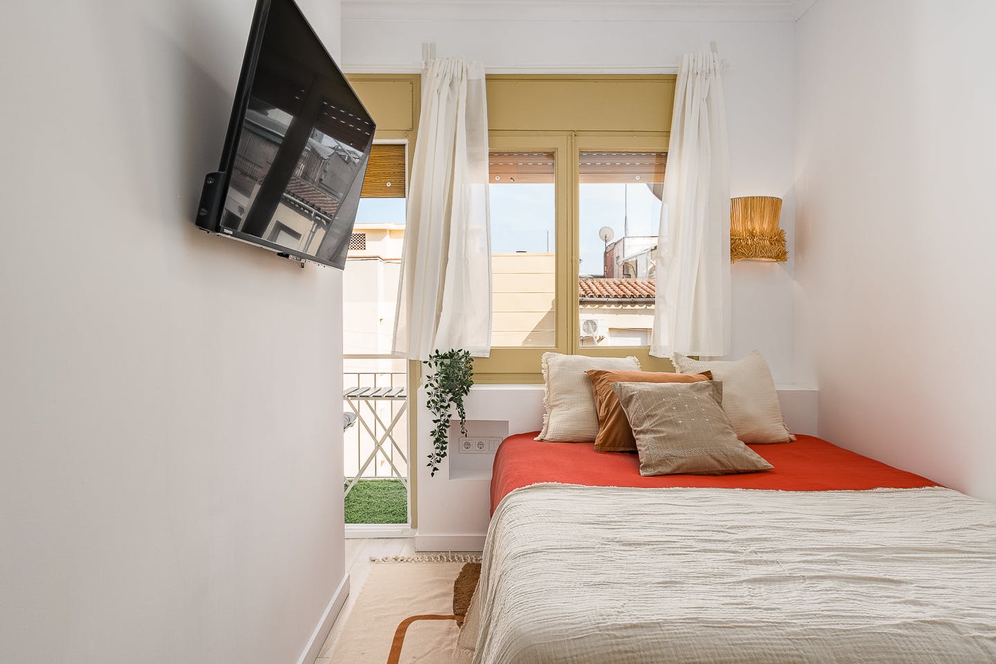 PRIVATE BALCONY | COUPLES ALLOWED |SUPER BRIGHT | NEWLY RENOVATED | ALL NEW FURNITURE – Located in Sant Martí. Includes all utilities (water, electricity, WIFI) and weekly cleaning with supplies. Furnished double room with lift-up bed, Smart TV, desk, closet, bedding, towels, and ceiling fan. Two full shared bathrooms. Kitchen fully equipped with microwave, coffee machine, toaster, cookware, dishware, and utensils. Laundry area with washer-dryer. In vibrant Sant Martí near Sagrada Família and Passeig de Gràcia. Metro L one, L two, L five, five minutes away....