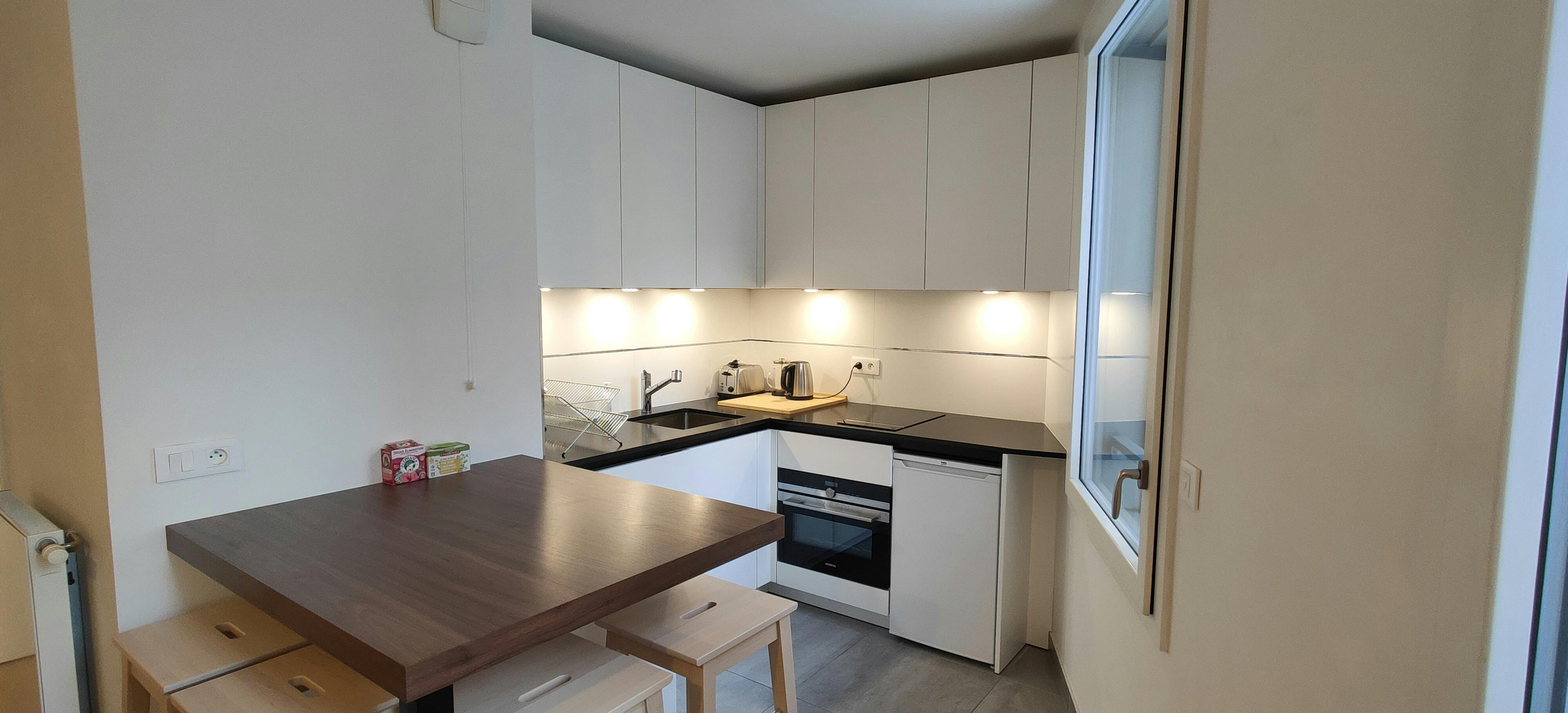 Studio neuf dans immeuble de standing. Très lumineux donnant sur une cour arborée fermée. Cuisine équipée avec four, réfrigérateur, congélateur, plaques, hotte, lave-linge séchant. TV connectée, Internet. De nombreux rangements. Accès immeuble par badge. Alarme intrusion. Alarme incendie - Non fumeur. Local vélo généreux et sécurisé. Nombreux commerces à proximité immédiate et à 5 minutes à pied du métro...