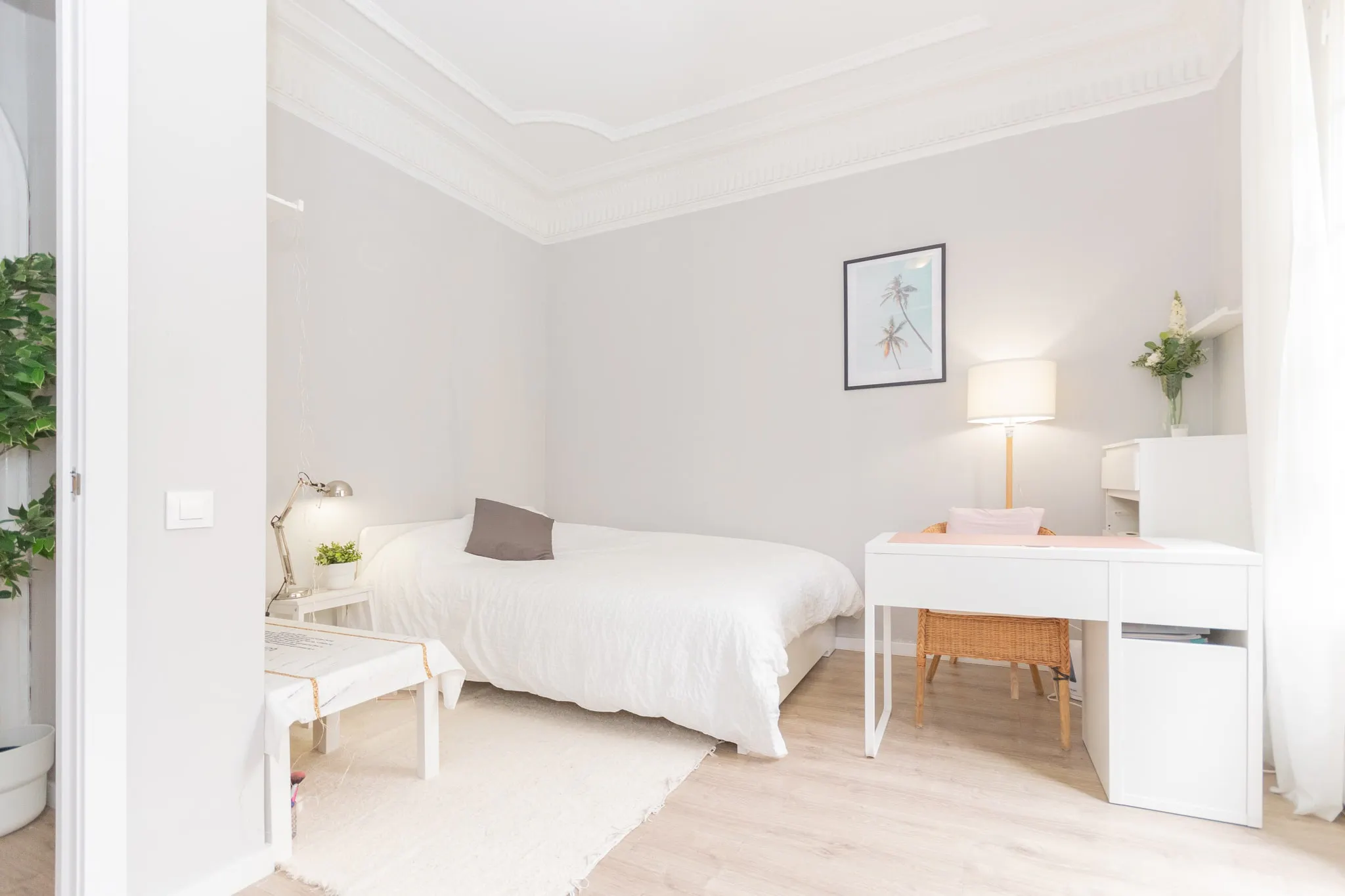 Deluxe room outside, spacious and bright with double bed, bedside tables, desk with reading lamp, study chair, chest of drawers and large closet. It has access to a nice balcony overlooking the street with a rest area. It has shelves, decorative design elements, a wall clock and beautiful plants that make the room a harmonious and lively space. It is located at the end of the main hallway. The room has a size of 17m2. The stay includes bed linen: fitted sheet, pillows with their respective pillowcases, comforter and blanket. It also includes maintenance cleaning every other week of the common areas, technical maintenance service, high speed internet and all utilities included up to the amount indicated in the contract. Located in l’Esquerra de l’Eixample, near Hospital Universitari Sagrat Cor, Piscina Sant Jordi and l’Escola Industrial. Very well connected, close to stores and restaurants, we find this 200m2 coliving. It is a Coliving that consists of a living-dining room and independent kitchen fully equipped with all appliances, two refrigerators and kitchenware. The laundry area has a washing machine and dryer. In the night area, we find teen bedrooms, all of them double and several with access to terrace and balcony. It has two complete bathrooms and toilet with all the necessary comforts, to relax giving you a bath in one of its bathtubs, or take a quick shower in one of its shower trays. The house has original hydraulic floors, aluminum carpentry and heating. About Eixample Esquerra This is one of the most central areas of the city, considered by many, the heart of Barcelona with a large collection of modernist buildings. A highly sought after area with exclusive penthouses and fabulous apartments in regal estates. Many of the buildings in the Eixample are the work of modernist architects who have preserved fantastic original elements; high ceilings, tiled floors with mosaics, cornice ceilings and lots of natural light. Avenida Diagonal, Paseo de Gracia and Rambla Cataluña, with their select international boutiques, prestigious offices and some of the best restaurants in Barcelona, complete the offer of this district, excellently linked to public transport and surrounded by a wide range of tourist attractions. M️ Coliving has the following public transport connections: 8 minutes from Provenca Renfe station (L1) 5 minutes from Metro Hospital Clinic (L5...