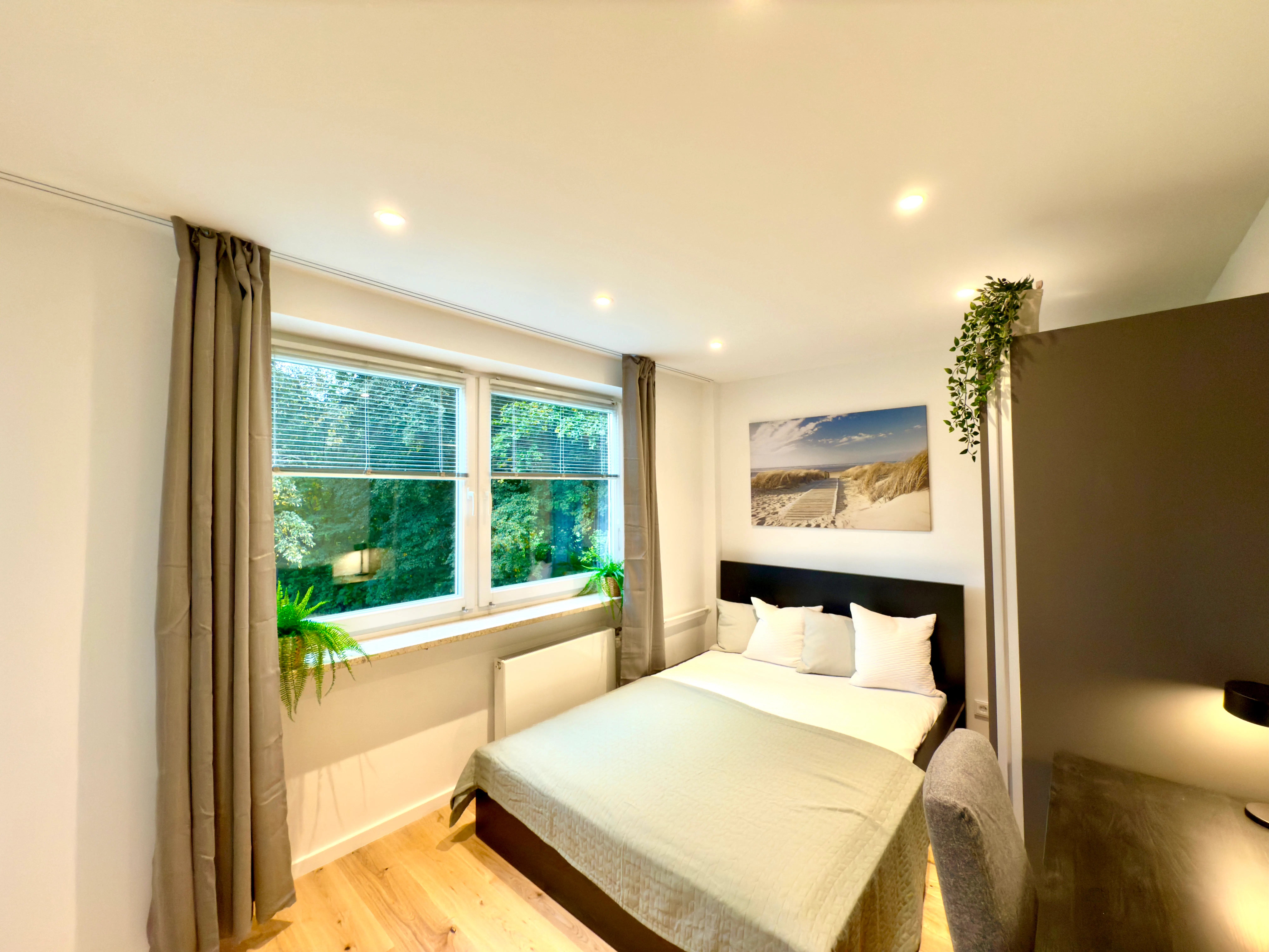 The newly and high-quality equipped room (Room 4) is part of an 81 sqm newly renovated apartment in Munich, Perlach. The generous hallway gives a very inviting impression and provides access to all rooms of the large apartment. The apartment also has a newly furnished bathroom, with a washbasin and LED mirror, a towel radiator and a shower as well as a toilet. The comfortably furnished room has the following brand-new furniture: - 140 cm bed with a mattress protector - Large wardrobe - Desk with drawers and upholstered chair - Decorative wall picture - Access to shared balcony We invite you to have a deeper look inside the apartment at Matterport: https://my.matterport.com/show/?m=QrxZM717HmV The table and floor lamps, plants and office supplies shown in the pictures are for illustration purposes only and are not included with the rental. The kitchen offers all imaginable conveniences: - All kitchen equipment such as plates, glasses, cookware, etc. - Kettle and toaster - Dishwasher - Microwave - Induction hob, oven and extractor hood - Refrigerator The apartment is equipped with everything you need and is perfectly prepared for you to move in and feel at home immediately. Of course, you also have unlimited access to the super-fast WiFi with 100 Mbit/s. The rent already includes all costs for using your room and all common areas (no hidden costs!)...