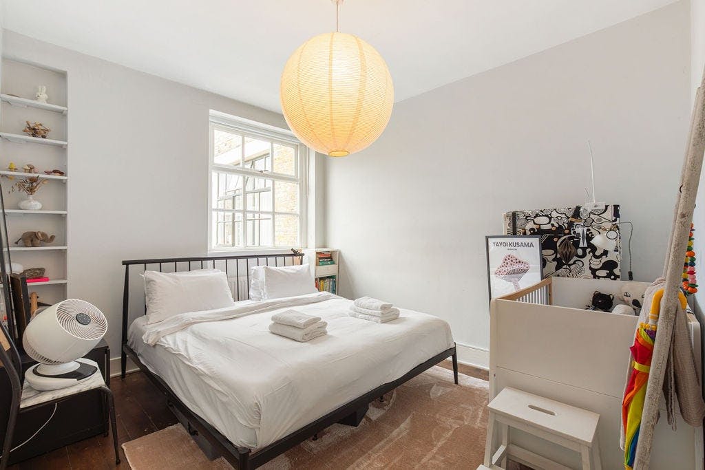 Welcome! A bright, character-filled living space featuring exposed brick walls and large industrial-style windows that flood the room with natural light. It includes a comfortable sofa, a smart tv, a stylish round dining table, and shelves filled with books and curated decor, creating a warm and welcoming atmosphere. A practical, well-equipped kitchen with sleek grey cabinets, modern appliances, and plenty of counter space for cooking. The large window above the sink brings in lots of light, while potted plants and tasteful details give the space a homely feel. Features include a stove, oven, washing machine, and all the essentials for preparing meals with ease. The bedroom features a UK extra-large king-size bed dressed in crisp white linens. The room is thoughtfully furnished with a modern crib, making it ideal for families with young children. The bathroom has all the amenities you will need to freshen up, including fresh towels and toiletries for your convenience. The apartment is always professionally cleaned for your comfort. Enjoy your stay...