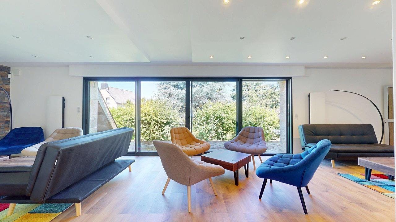🏠 LES ESPACES COMMUNS REZ-DE-CHAUSSÉE : La pièce de vie, très spacieuse, est meublée avec trois canapés, de nombreux fauteuils, tables basses, meuble télévision et télévision. Le salon donne directement sur une large terrasse et un jardin pour pouvoir profiter pleinement de l'extérieur. La salle à manger comporte une grande table à manger avec dix fauteuils ainsi que de nombreux placards de rangement. Elle permet aussi d'accéder au jardin. La cuisine, ouverte sur la salle à manger, est équipée de deux fours, deux micro-ondes, plaques de cuisson, hotte, évier, deux réfrigérateurs avec compartiment congélateur, lave-vaisselle, ainsi que de nombreux rangements et ustensiles de cuisine. Des WC indépendants sont également accessibles au rez-de-chaussée. Le rez-de-chaussée contient deux chambres, toutes deux avec leur salle de bain privative. La buanderie, située au sous-sol, comporte un évier, deux lave-linge et un sèche-linge. PREMIER ÉTAGE : Le premier étage contient cinq chambres, deux salles de bain communes et des WC séparés. Possibilité d'acquérir un kit couette, 2 oreillers et drap housse pour 40 € pour les chambres. 🛏️ LA CHAMBRE Elle est équipée d'un lit double, deux tables de chevet, bureau et armoire de rangement. Elle a accès à deux salles d'eau communes situées l'étage ainsi que des WC séparés. 📍LE QUARTIER Située dans la commune de Saint-Erblon, à environ 12 km au sud de Rennes, cette adresse bénéficie d'un cadre de vie paisible et résidentiel, tout en offrant une bonne accessibilité aux transports en commun et une proximité avec diverses commodités. Niveau transports en commun, on trouve à proximité : Ligne 61 : Relie Saint-Erblon à Rennes (Henri Fréville) via Noyal-Châtillon-sur-Seiche. Ligne 161EX : Assure la liaison entre Bourgbarré, Saint-Erblon, Noyal-Châtillon-sur-Seiche et Rennes (Henri Fréville). Ligne 74 : Dessert Bourgbarré, Orgères, Saint-Erblon et Rennes (Henri Fréville). L'arrêt de bus Leuzières est situé à 4 minutes à pied, offrant un accès rapide à ces lignes. Vous trouverez dans un rayon de 15 min à pied toutes les commodités : supermarché, banques, boulangeries, pharmacies, espaces verts (Parc des Leuzières à 6 minutes à pied). Le centre-ville de Saint-Erblon et ses commerces, boutiques, restaurants est facilement accessible en 7 minutes à pied. Bail individuel à la chambre. Pas de caution solidaire. Chacun est libre de partir quand il veut sans se soucier des autres colocs. Éligible aux APL. Les informations sur les risques auxquels ce bien est exposé sont disponibles sur le site Géorisques : (hidden) Montant estimé des dépenses annuelles d'énergie pour un usage standard : 2921 € par an. Prix moyens des énergies indexés sur l'année 2021,2022,2023 (abonnements compris...