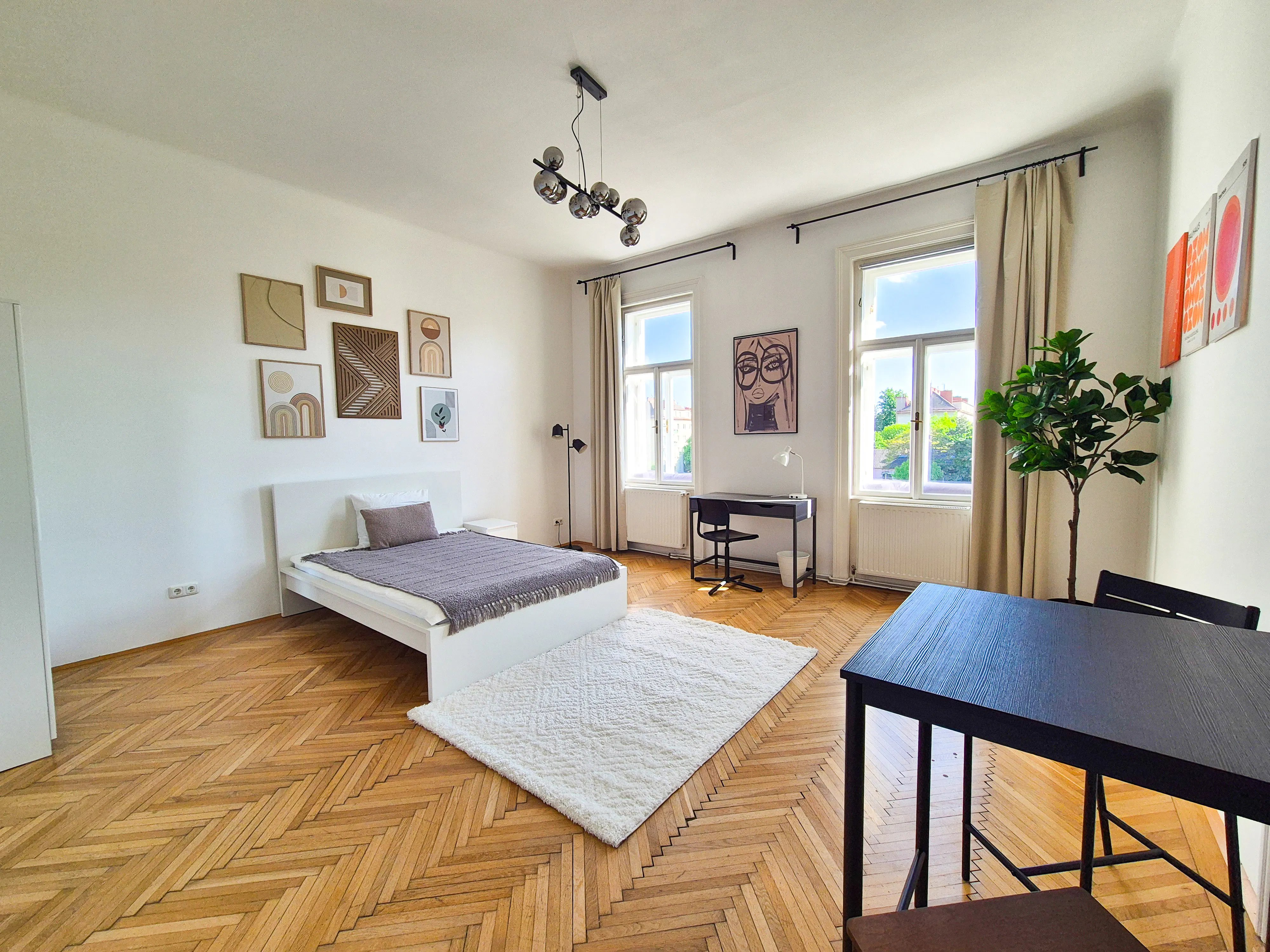 Willkommen in deinem neuen Zuhause in Wien! Diese traumhafte Altbauwohnung in der Hadikgasse vereint historischen Charme mit modernem Wohnkomfort – perfekt für Studentinnen, die stilvoll, unkompliziert und zentral wohnen möchten. Die Wohnung wurde komplett neu und hochwertig saniert und besticht durch ihre großzügigen Räume mit beeindruckend hohen Decken, großen Fenstern und wunderschönem, edlem Eichen-Fischgrätparkett. Hier erwartet dich nicht nur viel Licht, sondern auch ein angenehmes Raumgefühl, das zum Wohlfühlen einlädt. Alle Zimmer sind bereits komplett möbliert – inklusive Bett, Schreibtisch, Stauraum und stilvoller Einrichtung. Du brauchst nur noch deinen Koffer und Bettwäsche mitzubringen, alles andere ist bereits da! Auch praktisch: Es gibt eine moderne Waschmaschine und ultraschnelles WLAN, das perfekt fürs Studium, Homeoffice oder Streaming geeignet ist. Ein echtes Highlight ist der große Balkon, der zum Verweilen mit Freundinnen, abendlichen Grillen oder zum Entspannen nach einem langen Unitag einlädt. Die Gemeinschaftsräume – wie Küche, Bad, Dusche und WC – sind modern ausgestattet und machen das Zusammenleben angenehm und komfortabel. Die Lage ist kaum zu übertreffen: Direkt vor der Haustür befindet sich die U-Bahn-Station (U4), mit der du in nur wenigen Minuten ins Stadtzentrum gelangst. Auch zahlreiche Buslinien und die S-Bahn sind in unmittelbarer Nähe. Die Wohnung liegt in einem sicheren, gut angebundenen Viertel mit Supermärkten, Bäckereien, Cafés und dem wunderschönen Schlosspark Schönbrunn nur einen Spaziergang entfernt. Diese Wohnung bietet alles, was du brauchst: Komfort, Stil, Gemeinschaft und die perfekte Lage für dein Leben in Wien. Ideal für Studentinnen, die ohne Aufwand sofort einziehen und ankommen möchten...