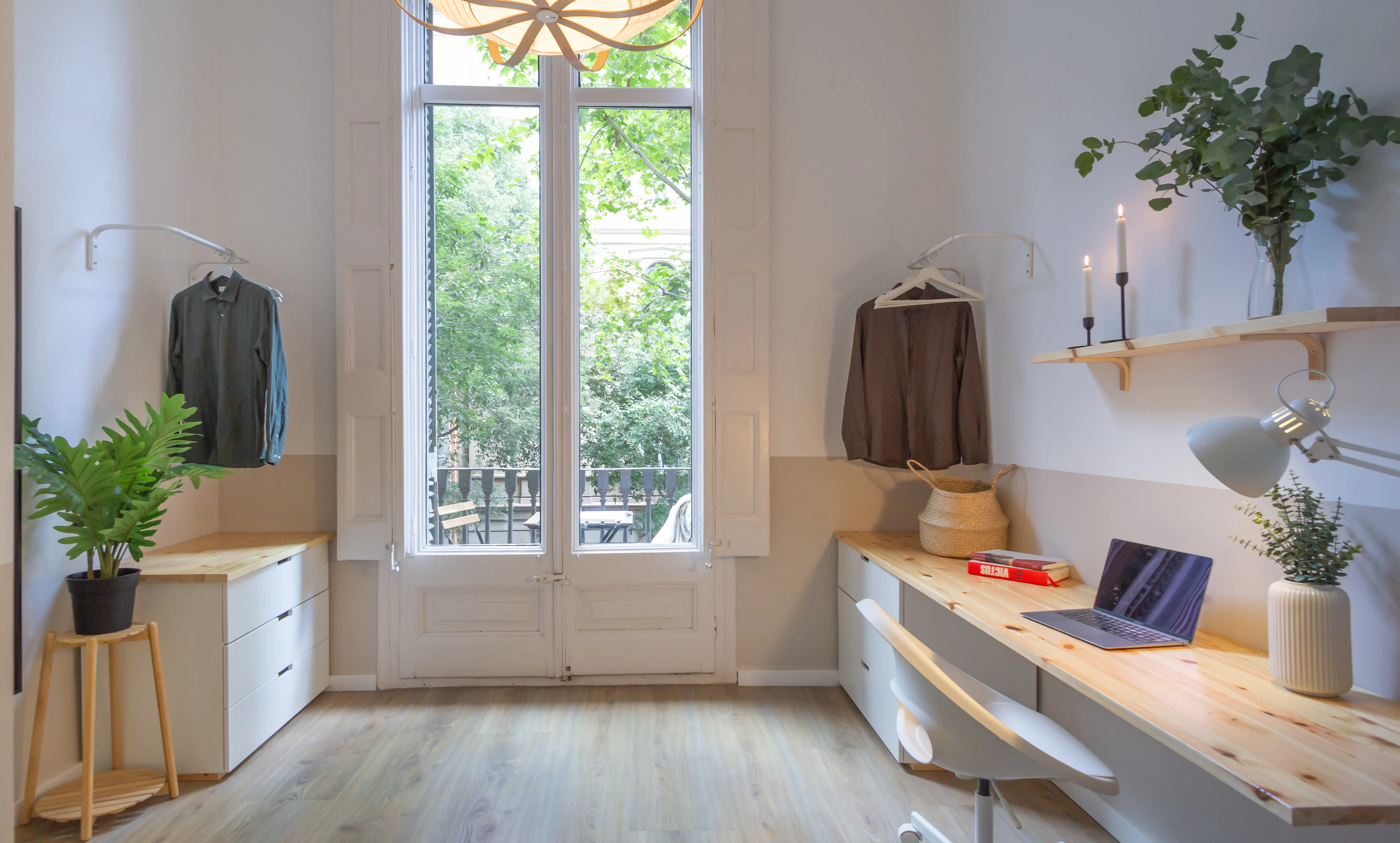 More than just a room. Your stay includes regular cleaning of the common areas, maintenance support, high-speed internet and all the essential household supplies such as soap, paper and cleaning products. You will also have 24/7 assistance from a Community Facilitator, access to community events and exclusive discounts at local partner brands. Everything is designed to make your life in Barcelona simple, comfortable and socially connected. 🏠 About the room Spacious and bright double room with high ceilings and a private balcony. It features a large desk for studying or remote work, an open-concept wardrobe, a full-length mirror, and a lockable door. 📍 About the neighborhood Eixample is a captivating neighborhood in the heart of Barcelona, renowned for its distinctive grid layout and wide, tree-lined streets. Designed by Ildefons Cerdà in the 19th century, it boasts stunning examples of Modernist architecture, including Gaudí’s iconic Sagrada Família, Casa Batlló, and La Pedrera. The area is brimming with stylish boutiques, cafes, and restaurants offering a blend of local and international cuisine. Its elegant avenues, like Passeig de Gràcia, invite you to stroll and immerse yourself in art, culture, and the rich history of Catalonia. 🔑 Membership fee A one-time fee of €275 is applied at the beginning of the stay. It covers the drafting and signing of the contract, check-in support and a full bedding set (duvet, blanket, sheets, two pillows and two towels). 🧹 Final cleaning fee A €125 final cleaning fee must be paid at the time of check-out. 💕 For couples: If the members are a couple, the Welcome Service fee increases by €100 to include the additional set of towels and keys, as well as handling and management for two occupants. The monthly fee increases by €265, which includes utilities for two people and all shared services. ✅ Check-in/out information - Check-in time (Monday - Friday): 15:00 - 18:00 - Check-out time: 11:00 - Check-in between 18:00 and 21:00: an additional fee of 50€ applies - Check-in after 21:00 or on public holidays: an additional fee of 90€ applies 👨👨👧👦 Community events You will be part of an international community where residents often share activities such as language exchanges, outings, workshops or simply conversations in the common areas. 😎 Exclusive discounts Members benefit from special rates at gyms, cultural spaces, restaurants and local services through our community partner network. 📝 Contract type Contracts are fortnightly. Please review the full breakdown of costs on the platform before confirming your reservation. 🐾 Pets are warmly welcomed! Please note that this is a pet-friendly apartment, and pets are allowed with an additional monthly fee. If you are interested in booking this room, send a booking request or a message including your age and occupation. We look forward to welcoming you to Haaus Coliving in Barcelona! 💚 Virtual tour: https://my.matterport.com/show/?m=MJrxxrW6Sn2&cloudEdit=1&ss=12&sr=3.14,-.0...