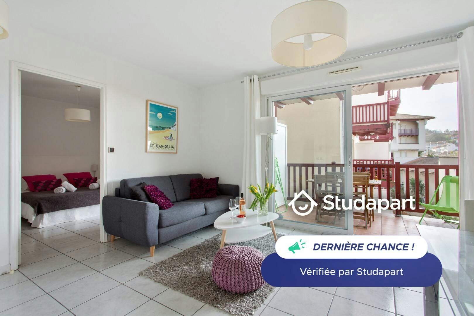 Superbe T2 meublé dans résidence récente, standing et sécurisée, ascenseur. Disponible uniquement en bail étudiant de septembre à juin. Centre ville Ciboure et Saint Jean de Luz, plage et gare à pied. Entièrement équipé et meublé, lave-linge, couchage en 160X200, terrasse couverte, vue océan., local vélo. Tous commerces aux pieds de la résidence. Canapé convertible en couchage quotidien. Updated on 28/07/202...