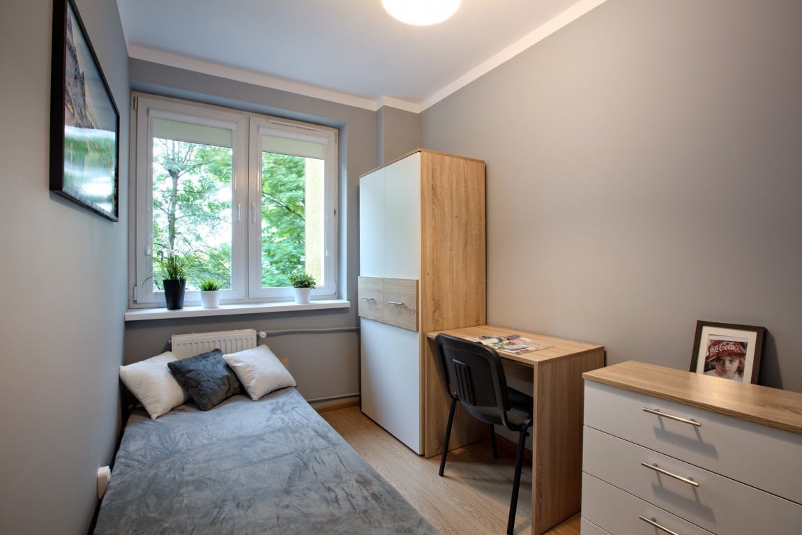 🏡 Your new home in Warsaw! This private bedroom offers a bed, a wardrobe and a desk. The windows allow a lot of natural light in, making this room vibrant and perfect for studying or working. The modern kitchen, which you share with other tenants, is fully equipped. We welcome international students and workers and hope to foster a social and friendly environment for all our tenants!⭐...