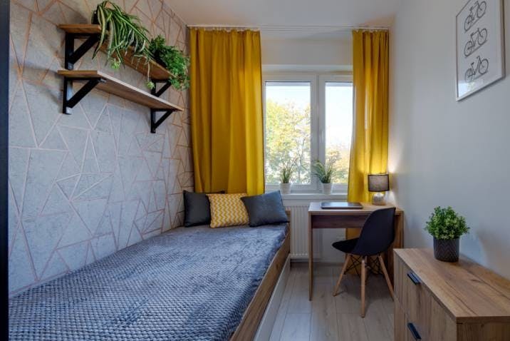 🏡 Your new home in Warsaw! This private bedroom offers a bed, a wardrobe and a desk. The windows allow a lot of natural light in, making this room vibrant and perfect for studying or working. The modern kitchen, which you share with other tenants, is fully equipped. We welcome international students and workers and hope to foster a social and friendly environment for all our tenants!⭐...