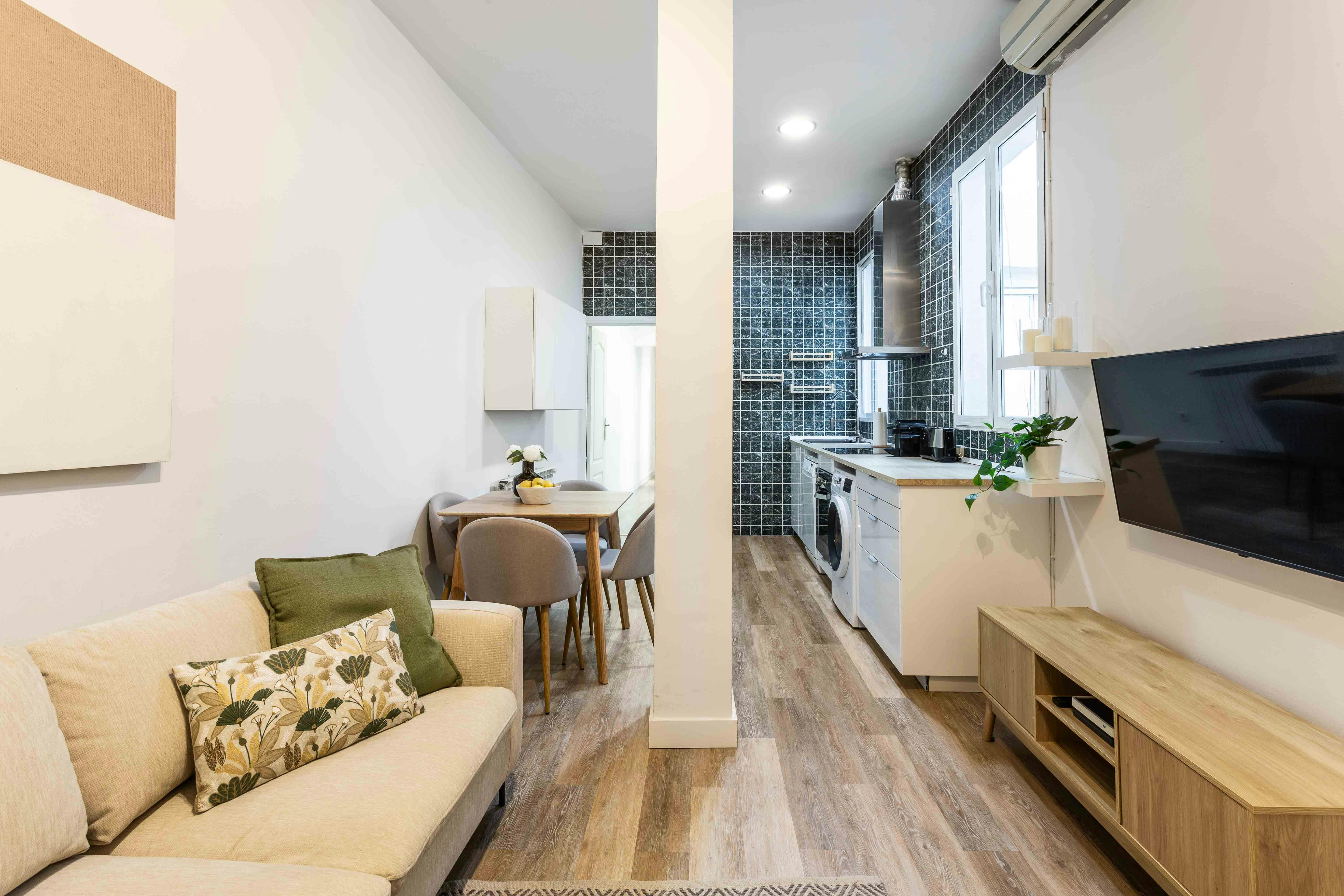 Located on the quiet yet central Calle San Bartolomé, this bright and spacious two-bedroom apartment is perfect for short- or mid-term stays in Madrid. Large windows fill every room with natural light, and the high ceilings enhance the sense of space throughout. The two double bedrooms are generously sized, each with a double bed and built-in wardrobes — ideal for professionals, families, or students. The open and cozy living room is perfect for relaxing or working from home. The kitchen is fully equipped, and the modern bathroom is clean and functional. The apartment comes fully furnished and ready to move in: it includes bed linens, sets of towels, complete kitchenware, and everything you need to feel at home from day one — just bring your suitcase and sleep in from the first night! Outstanding location just steps from bars, shops, public transport, and all the highlights of central Madrid.Composition: bedroom / living room Amenities: iron & ironing board, bed linen & towels, washing machine, dishwasher, cable tv, satellite tv, air conditioning, no smoking rooms/facilities, heating, pets accepted under request, no parties, hangers, wardrobe, ceiling fa...
