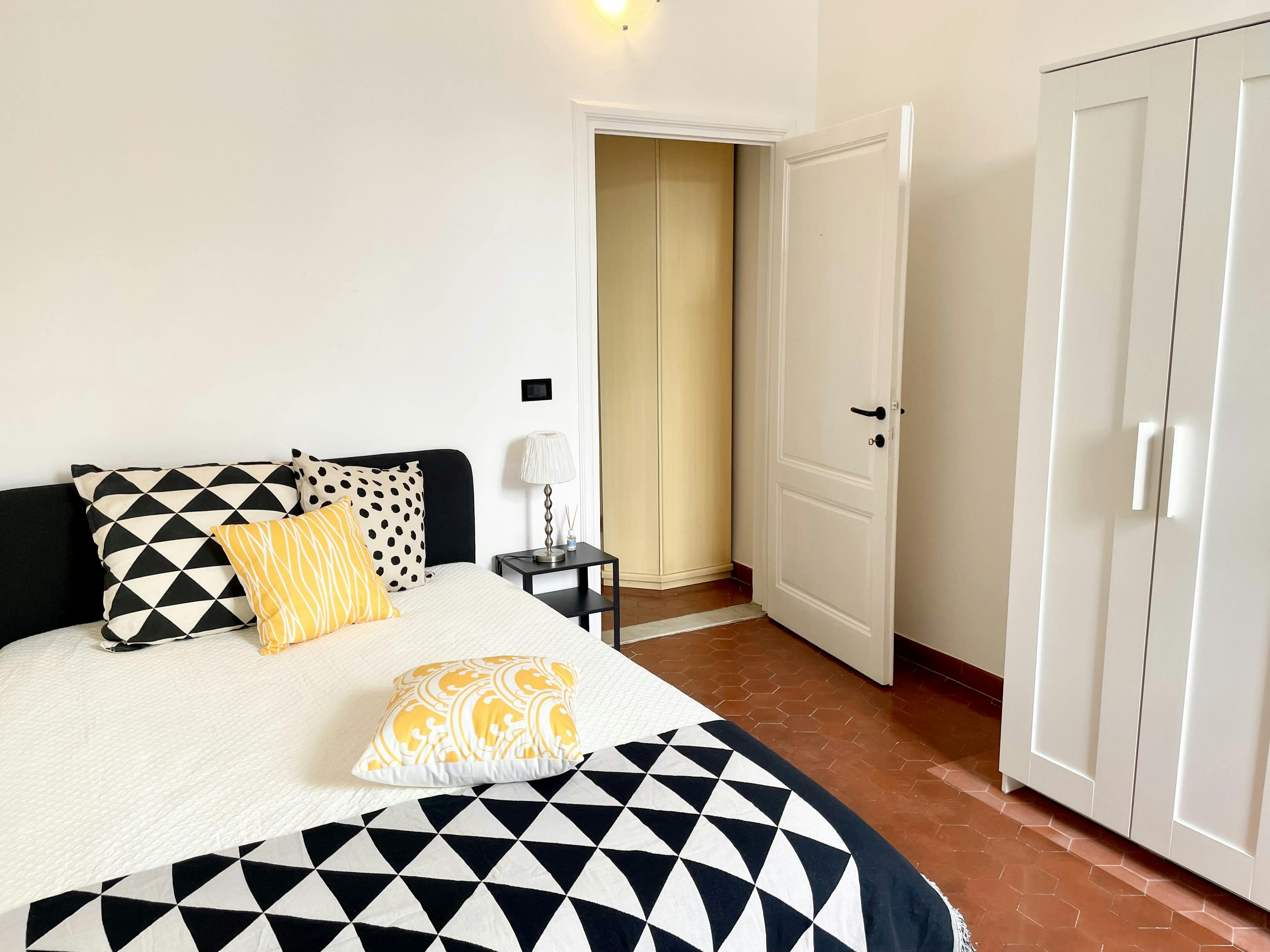 Luminosa e confortevole camera singola, con letto una piazza e mezza, aria condizionata e Wi-Fi (connessione Internet veloce – Fibra). L'appartamento, appena ristrutturato, si trova in zona Novoli, vicino alle principali Università; collegato bene al centro città (20 minuti in tramvia); tutti i servizi sono vicini (supermercati, bar, farmacia ecc.); l'edificio è un terratetto indipendente su 2 livelli: oltre alle camere (5 singole in totale), ha 3 bagni, con doccia, e cucina attrezzata (con fornelli, microonde, 2 frigoriferi, lavatrice e lavastoviglie..) con balcone; al piano terra ci sono 2 camere, la cucina ed 1 bagno; al primo piano questa camera e altre 2 camere e 2 bagni (questa camera condivide il bagno con un solo coinquilino); il tutto arredato con mobili nuovi, ed è rifornito di pentole, piatti, posate etc. etc. I coinquilini sono studenti, ragazzi e ragazze, sia italiani che internazionali. PREZZO TUTTO INCLUSO! (Affitto + riscaldamento e condizionamento + tassa rifiuti + bolletta elettrica, acqua e gas + INTERNET + pulizia mensile delle parti comuni dell'appartamento); avrai da aggiungere solo la spesa iniziale per registrazione del contratto, assicurazione e pulizie iniziali e finali Bright and comfortable private room, with queen-size bed, air conditioning, and Wi-Fi (fast Internet connection – Fiber). The apartment, recently renovated, is located in Novoli area, close to the main universities; well connected to the city center (20 minutes by tram via); all services are close by (supermarkets, bars, pharmacy, etc.). The building is a detached house, on 2 floors: in addition to the bedrooms (5 single rooms in total), has 3 bathrooms, with showers and kitchen (with stoves, microwave oven, 2 fridges, washing machine and dishwasher..) with balcony; on the ground floor there are two rooms, the kitchen and 1 bathroom; on the 1st floor this one and other 2 rooms and 2 bathrooms (this room shares the bathroom with only one flatmate); all furnished with new furniture, and is stocked with pots, plates, cutlery etc. etc. The roommates are students, boys and girls, both Italian and international. ALL INCLUSIVE PRICE! (Rent + heating and air conditioning + waste tax + electricity, water and gas bill + INTERNET + monthly cleaning of the common areas of the apartment); you will only have to add the first expense for registration of the contract, insurance and first and final cleaning...