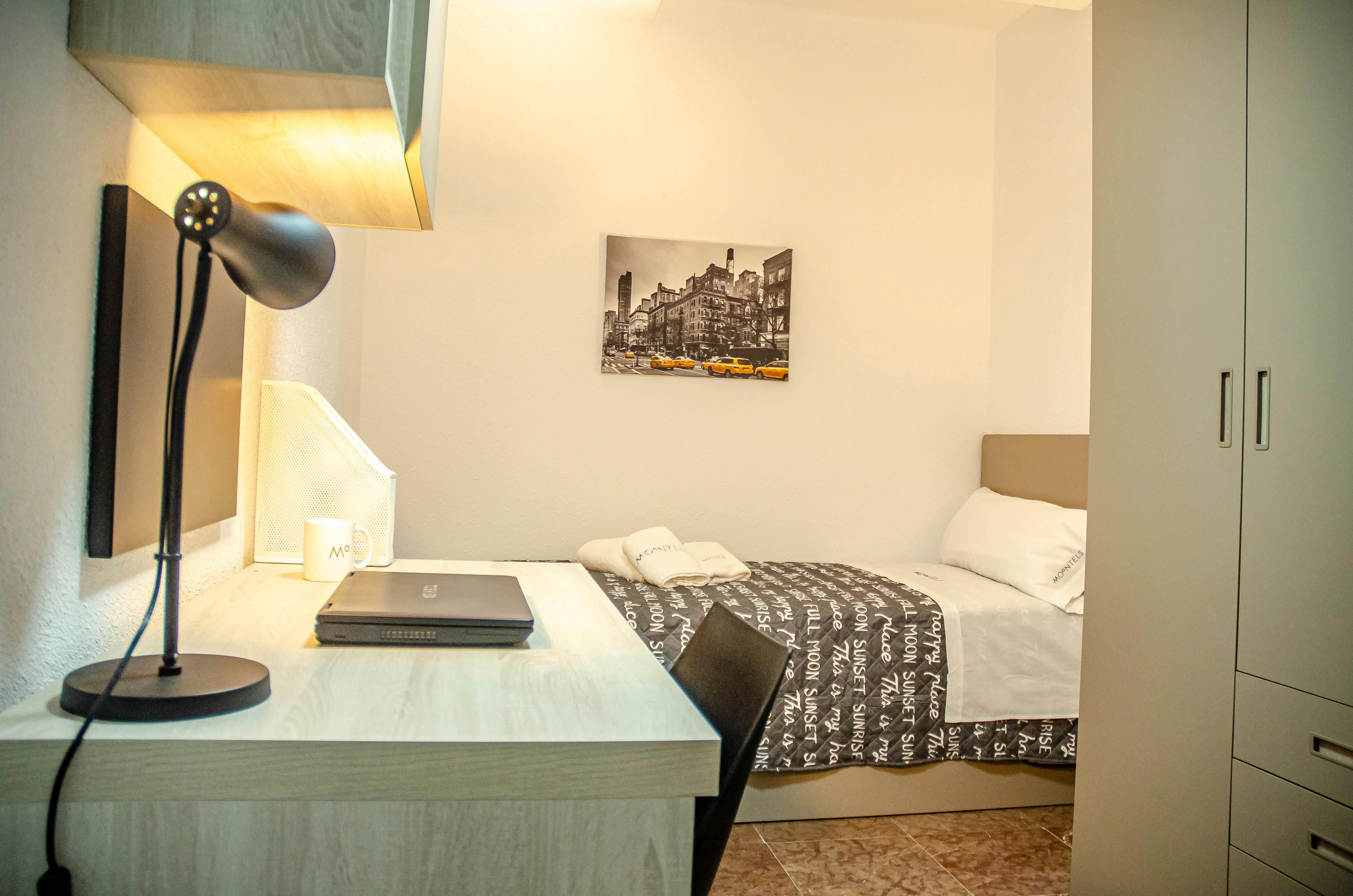 Excelente habitación privada en un piso compartido con otras 9 personas en el centro de Valencia. Si estás buscando un piso compartido para pasar una temporada ya sea porque te cambias de ciudad, por teletrabajo, o bien porque decides cambiar de alojamiento, este alojamiento es para ti. Características: Consta de 10m2 en un piso compartido, con vistas al patio interior, está totalmente equipada para que no te falte de nada y con todas las comodidades que puedes necesitar durante tu estancia. El apartamento dispone de 2 habitaciones individuales, 4 habitaciones compartidas, 3 baño con ducha, cocina y un balcón. La cocina se encuentra completamente equipada, con horno, microondas, placa vitrocerámica, tostadora y cafetera, además de menaje, cubertería y vajilla. La habitación privada dispone de una cama individual con arcón, escritorio con cajonera, silla, armario y mueble estantería . Además contamos con un sistema de seguridad en el que podrás acceder a tu habitación mediante cerradura electrónica. La localización de los apartamentos Moontels Guillem 13 es privilegiada al encontrarse en el centro de Valencia, con los mejores servicios y una amplia oferta multicultural. Además se encuentra a unos minutos caminando de la estación de trenes y los servicios de transporte de metro y autobús. ¿Qué vas a encontrar en tu habitación individual? Moontels Keeper (asistencia personal) WiFi de alta velocidad Limpieza semanal de zonas comunes Limpieza de habitación (opcional) Sábanas y toallas Cerradura electrónica en la habitación Lavandería (autoservicio 24 horas) Mantenimiento integral...