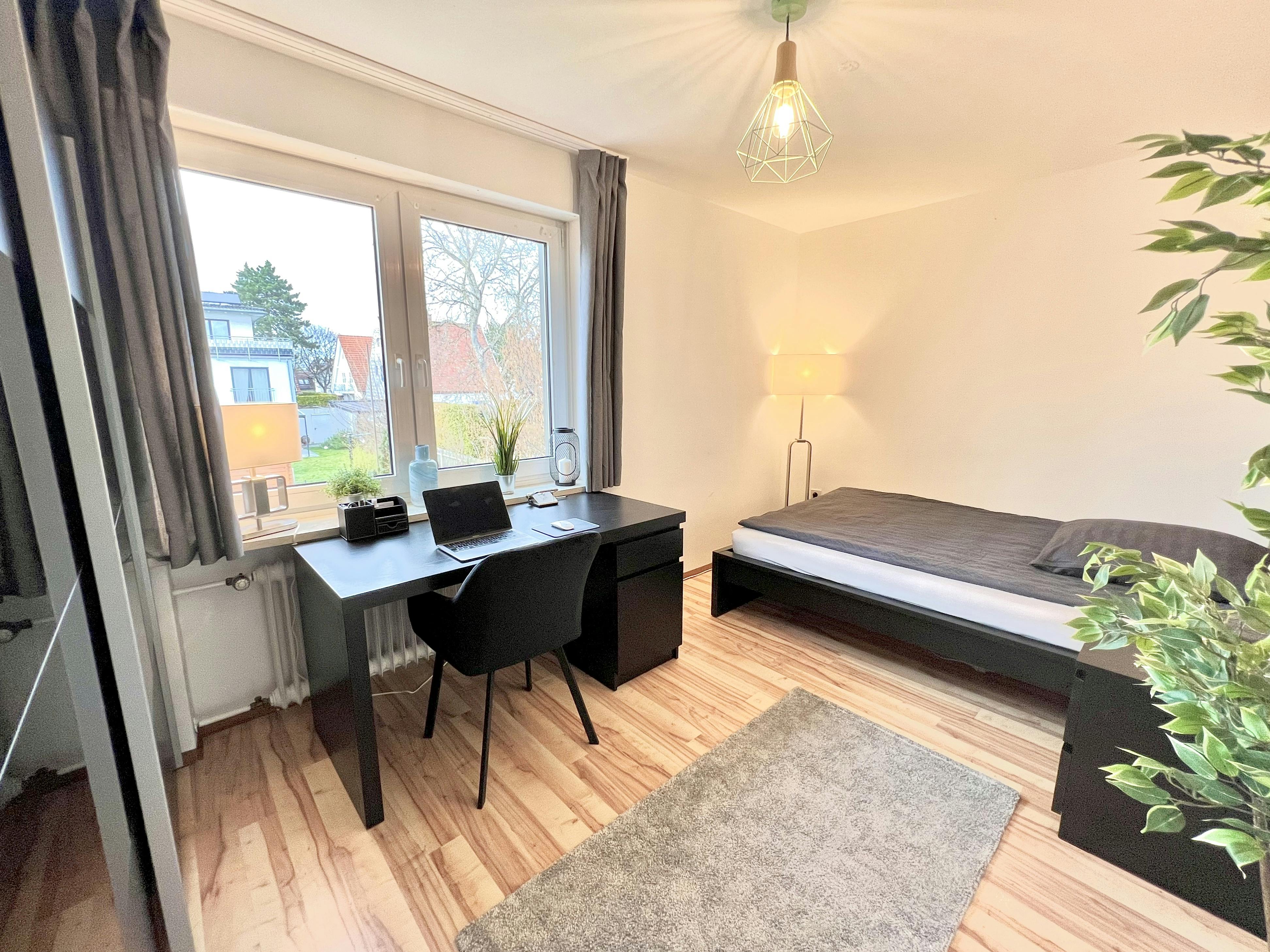 You can go on a virtual tour through the whole apartment: https://my.matterport.com/show/?m=NSvnSPLJH8b The newly fully-furnished room is part of a 91 sqm apartment in Munich and comprises the whole first floor of the building. If you're interested in another rooms in this apartment, please notice also the other advertisements. The rent already includes all costs for using your room and all common areas (no hidden costs!). The comfortably furnished room has the following brand new furniture: - 140 cm bed with adjustable slats and medium-firm foam mattress with mattress protector - Bedside table - Extra-Large wardrobe - Desk with drawers and upholstered chair - Wall picture - Curtains and Shutter - Short pile carpet The table and floor lamps, plants, and office supplies shown in the pictures are for illustration purposes only and are not included with the rental. The generous hallway gives a very inviting impression and provides access to all rooms of the large apartment. The fully equipped kitchen with Siemens devices offers all imaginable conveniences: - All kitchen equipment such as plates, glasses, cookware, etc. - Coffee machine and kettle - Dishwasher - Hob, oven and extractor hood - Large refrigerator There is also a storage room for cleaning stuff and other utilities, although in the kitchen are probably already enough shelters for everything. Washing mashine and drying rack is also included (without coins) and available in (hidden)ment of the building. The apartment also has a brandnew bathroom and WC. Of course, you also have unlimited access to the fast WiFi with 100 Mbit/s. The apartment is equipped with everything you need and is perfectly prepared for you to move in just with your case and feel at home immediately. Connection: The apartment is also convincing due to its very good connection to public transportation. The bus stop is located in front of the door and brings you in 3 minutes to the S-Bahn-, Metro- and Tram- Station "Moosach". You can also go there by foot in 5 minutes. From there you only need 20 minutes to the heart of Munich to Marienplatz. You can also find all the daily necessities such Aldi, bakery, pharmacy, hair salon, doctor's office, and various restaurants in your vicinity...