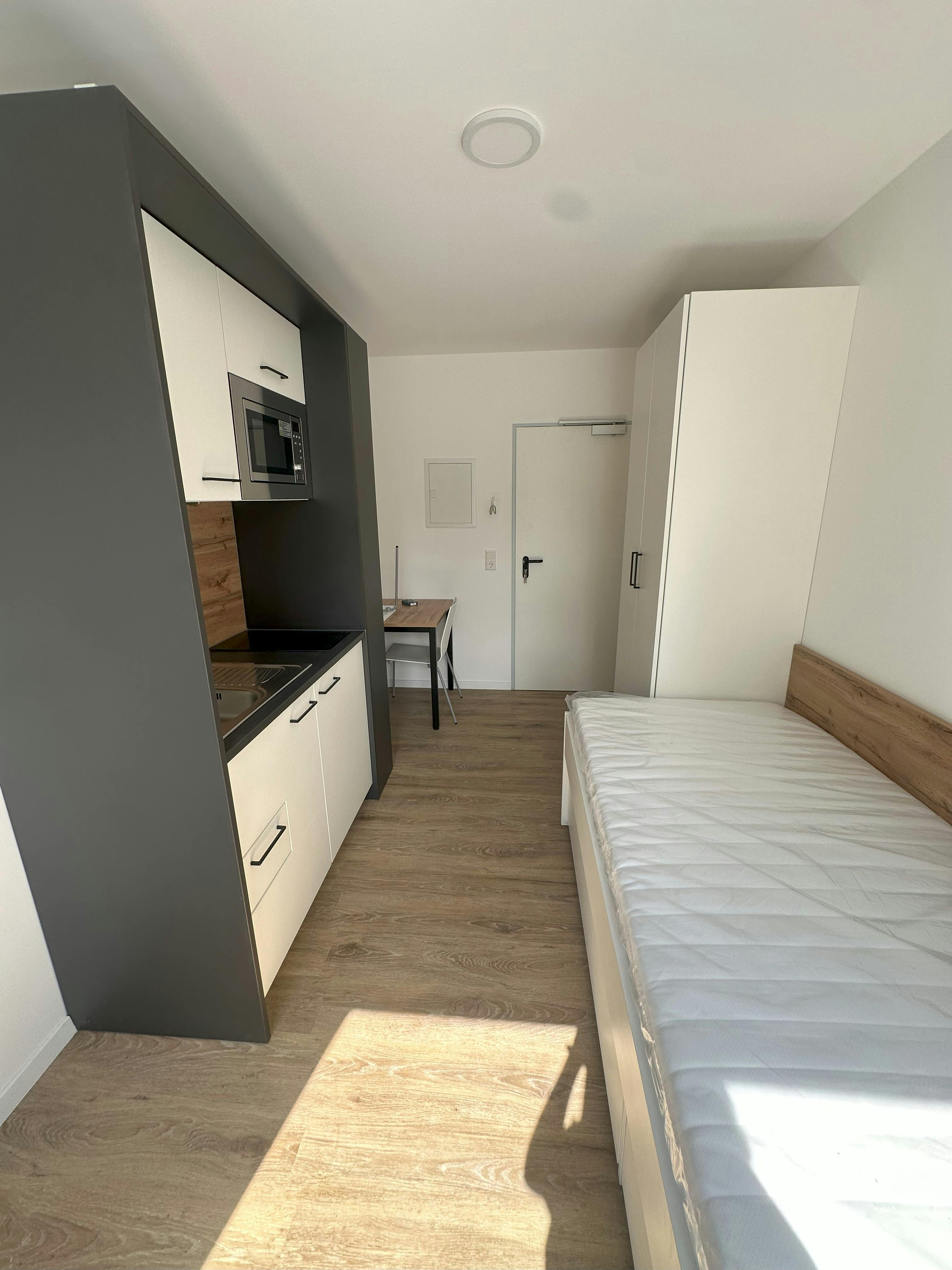 In unmittelbarer Nähe zur Universität befindet sich das gerade kernsanierte Gebäude mit insgesamt 17 möblierten Apartments. Der Gemeinschaftsraum im Erdgeschoss kann von allen Bewohnern genutzt werden und lädt zum Verweilen ein. In ihr neues voll-möbliertes Apartment können Sie direkt einziehen! Im Mietpreis enthalten ist eine moderne Pantryküche, ein Bett inkl. Matratze, Esstisch mit Stühlen, ein Kleiderschrank, einem Garderobenpanel, sowie ein großes Regal für genügend Stauraum. Die Fenster im Wohnraum wurden mit verdunkelnden Plissees ausgestattet. Das Badezimmer ist ausgestattet mit einem ebenerdigen Echtglas-Dusche, WC, Waschbecken sowie einem Schränkchen mit integrierter Beleuchtung. Zudem ist das Bad mit einem Fenster ausgestattet, welches für Sichtschutz mit Milchglasfolie versehen wurde. Die Apartments wurden vor kurzem kernsaniert und mit neuen Möbeln ausgestattet, Erstbezug war September 2025. Im Keller befindet sich ein abschließbarer Spind für zusätzlichen Stauraum. Dort ist auch eine Waschmaschine sowie ein Trockner zugänglich, die gegen Gebühr vom Anbieter WeWash genutzt werden können. Das angebotene Apartment hat die ideale Lage für Studenten der Universität Essen. Das Hörsaalzentrum S04 des Campus befindet sich direkt auf der anderen Straßenseite und ist in wenigen Minuten zu Fuß erreichbar. Auch die U-Bahn Haltestelle befindet sich hier direkt. Das Stadtzentrum ist mit den öffentlichen Verkehrsmitteln oder dem Rad in ca. 10 min erreichbar. Der nächste Supermarkt ist in ca. 1,5km Entfernung. Ein Kiosk liegt in etwas 400m Entfernung. Ein Waschsalon liegt in etwa 100m Entfernung. In den Nebenkosten sind bereits Kosten für Strom, Wasser, Heizung, Müllentsorgung, etc. vorhanden. Lediglich die Kosten für den Internetanschluss kommen noch hinzu, der direkt über unseren Partner Heycom ab 19€ p. M. bezogen werden kann. Für die Nutzung des Internets ist ein eigener Router notwendig...