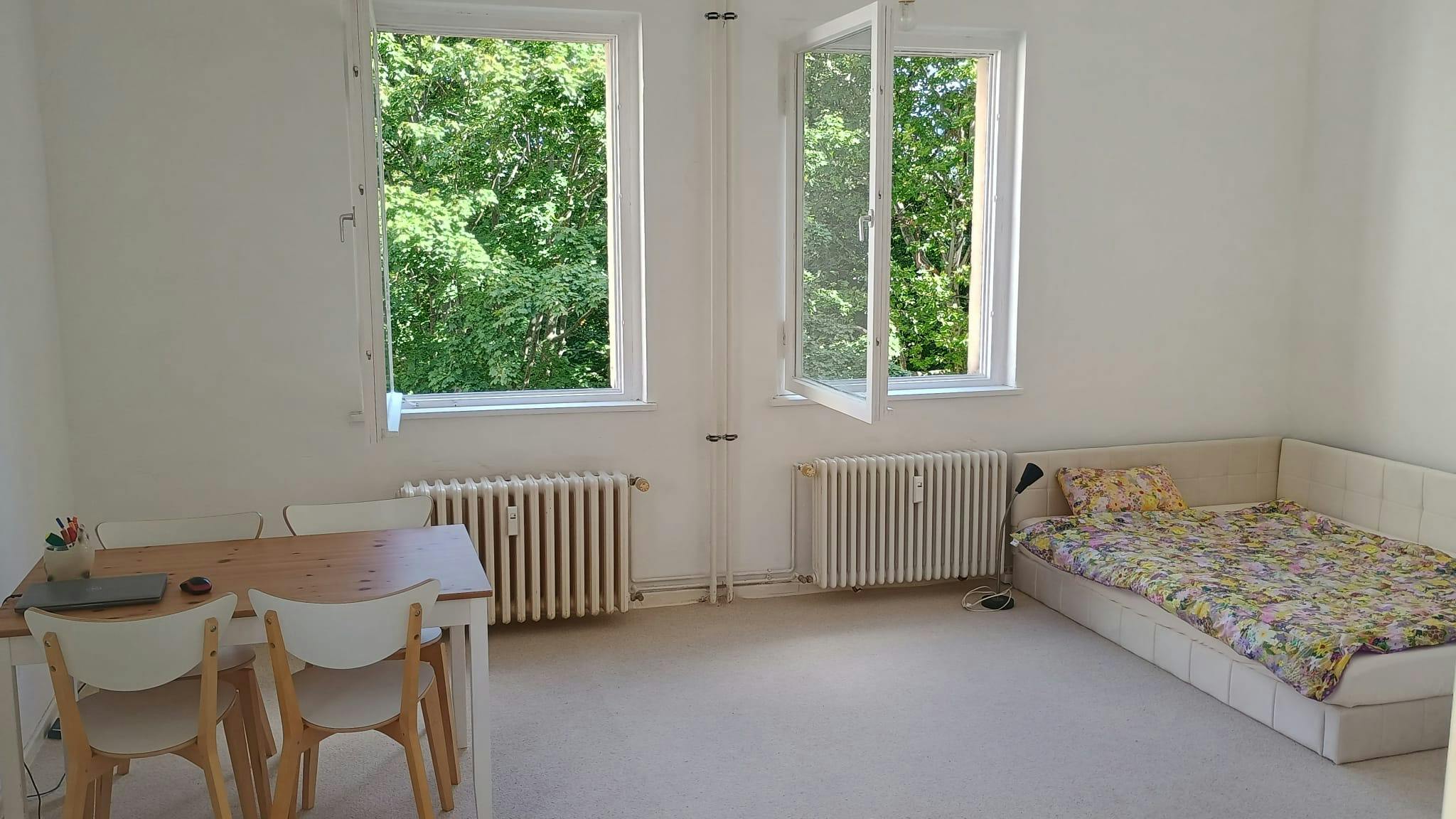Suitable for guest researchers, international students and visiting professionals Property description: We are renting out our wonderful, bright one-room apartment (36 m2) in Berlin Schöneberg. Fully furnished and equipped with new high-quality electrical appliances. The monthly rent is €1300. This flat rate includes water, electricity, heating, and Telekom WiFi, so you don't have to worry about a thing. The furnishings includes: - A fully equipped new fitted kitchen with a 4-plate stove and oven. Refrigerator with *** freezer compartment (Sharp), coffee machine, washing machine (Bosch). High-quality tableware (Rosenthal), cutlery, and pots and pans in all necessary sizes. - The living room includes: A new bed (200x140 cm) with a new mattress, a dining/work table with 4 chairs, 2 shelves, a wardrobe, high-quality blinds, a large beanbag (can also be used as a guest bed!), electric guitar. - The bathroom is equipped with a mirror cabinet and another small cabinet, has a corner shower and a toilet. There is a new set of towels prepared for you. All electrical appliances and furniture are brand new. Location of the apartment: The apartment is located on the second floor of a very well-maintained residential building from the 1920s. It has 4 windows facing east and south and is very bright. In front of the windows is a small green area, so you always have a view of the greenery and can hear birds chirping. Living environment: The S-Bahn line S 1 is only a 3-minute walk from the apartment. It takes you to the FU Berlin (Zehlendorf stop) in just 11 minutes and (in the other direction) directly to Potsdamer Platz in the center of Berlin in 10 minutes, as well as to the international hub and long-distance train station of the DB. The apartment is quiet and centrally located in the international and friendly district of Schöneberg/Friedenau. Supermarkets (Edeka, Netto, Rewe, organic food store), bookstores, cafés, and international restaurants (Korean, Indian, Thai, Nepalese, etc.) are just around the corner. The famous Schlossstraße shopping mile with all the major shopping centers, malls, international brands, and cinemas is also only 15 minutes away....