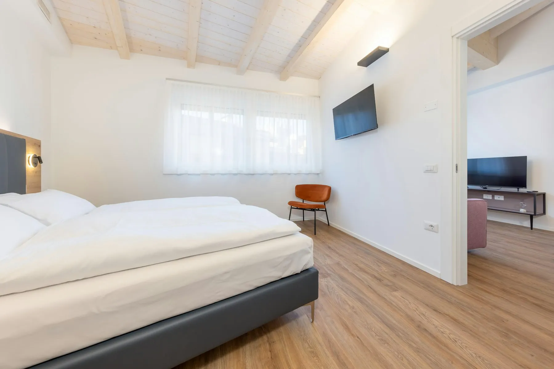 Luxury Student Apartment with Sauna Room: Elegant and bright double bedroom, furnished in a modern, linear style. The exposed-beam ceiling and wooden floors add warmth, while the large windows with sheer curtains provide a pleasant natural light. The room features a large double bed with a backlit padded headboard, a spacious wardrobe, a flat-screen TV, and a comfortable designer armchair. An exclusive added value is the private wooden sauna, perfect for enjoying moments of relaxation and well-being in total privacy. An ideal solution for those seeking modern comforts and high-quality details in a shared setting yet with high-end private spaces. Apartment: In the heart of the city, a stone's throw from the University of Trento's humanities departments, stands Minerva Student Housing, a recently renovated building that combines the charm of a historic setting with the comfort of modern amenities. A home just steps from the Duomo, where you can live in an international environment, study, and make friends. The residence consists of 24 single rooms with private bathrooms and air conditioning and 2 apartments, all designed to ensure everyone has the privacy, study, and rest needed to maximize their academic performance. This is one of two apartments in the property, tastefully furnished, spacious, bright and with a sauna! We're a bit old-fashioned and still prefer deposits like the good old days, so we require the deposit payment to be made to the property manager's bank account immediately after completing the reservation process on HousingAnywhere...