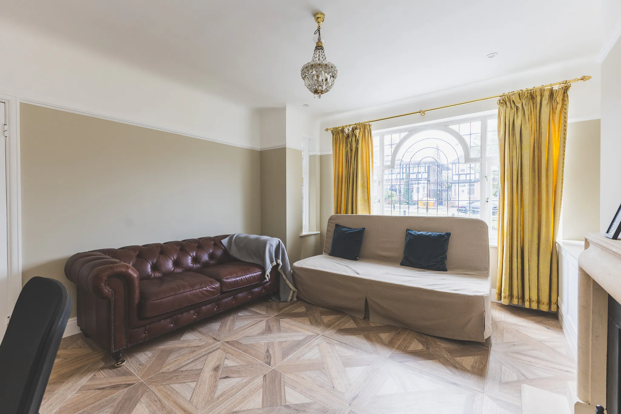 This stylish Hanger Hill home offers a blend of modern comfort and thoughtful design, creating a welcoming base for families and groups visiting London. Spread across the ground and upper floors, the property balances sleek, contemporary finishes with warm, homely touches, providing a versatile setting for both relaxation and entertaining. The house comfortably accommodates up to eight guests with three well-appointed bedrooms. Sleeping arrangements include a king-sized bed, a double bed, a single bed, and an additional double sofa bed in the living room. Two bathrooms serve the property, one featuring a sleek walk-in rainfall shower and the other offering a bath-shower combination, ensuring both practicality and comfort for guests. DISCLAIMER!! Please note, the garden is not available for guest use!! The living and kitchen spaces are the heart of the home. The living room is arranged with a large, deep-cushioned sectional sofa that transforms into a sofa bed, complemented by a sleek media unit and large TV. The style is modern yet inviting, with clean lines, statement flooring, and a soft, neutral palette creating a polished but welcoming atmosphere. The kitchen and dining area open up through skylights and glass doors, flooding the space with natural light. A striking marble-topped island with bar seating and dark cabinetry makes a bold statement, balanced by a rustic wooden dining table for more formal meals or relaxed family gatherings. The bathrooms bring a boutique-hotel feel to the home. One is designed with bold hexagonal tiling, white subway walls, and brass finishes, centred around a sleek walk-in rainfall shower. The other is bright and elegant with marble-effect tiles, herringbone insets, and patterned floors, offering both a full-sized bathtub and shower. These thoughtfully designed spaces combine modern sophistication with everyday practicality. We offer custom pricing for any duration, with rates varying based on exact move-in and move-out dates. Rates start from 4803...