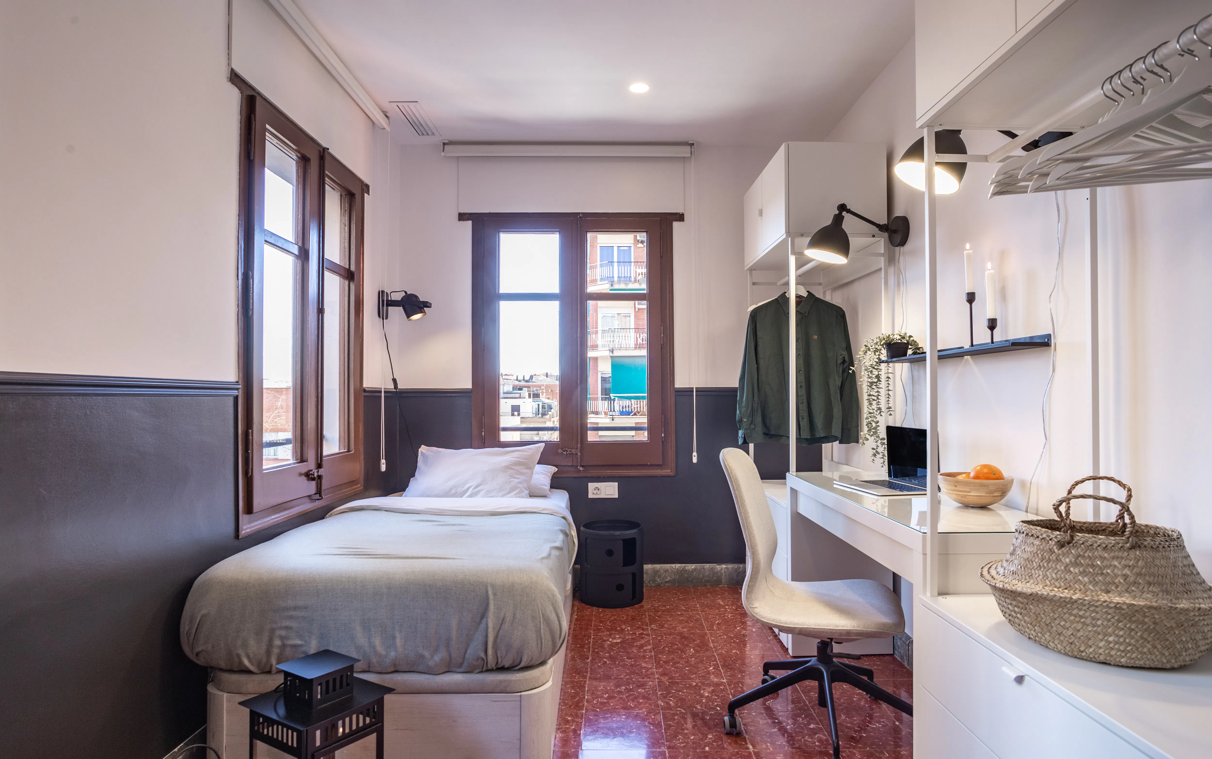 More than just a room. Your stay includes regular cleaning of the common areas, maintenance support, high-speed internet and all the essential household supplies such as soap, paper and cleaning products. You will also have 24/7 assistance from a Community Facilitator, access to community events and exclusive discounts at local partner brands. Everything is designed to make your life in Barcelona simple, comfortable and socially connected. 🏠 About the room Bright twin double room featuring two beds with lift-up storage to maximize space, open-concept wardrobes, a shared desk ideal for studying or working remotely, clothes racks for jackets, and stylish designer furniture. The room also comes with an aerothermal system for year-round comfort and a digital lock on the door. 📍 About the neighborhood Gràcia is a charming neighborhood known for its 19th-century boulevards and pedestrian streets, lined with unique boutiques, galleries, and cinemas. The Plaça de la Vila de Gràcia, with its iconic clock tower, is surrounded by bistros offering Catalan cuisine and wine bars. The area showcases Antoni Gaudí’s modernist architecture, including the Islamic-inspired Casa Vicens and Park Güell, an extraordinary open-air space with vibrant mosaics perched high above the city. 🔑 Membership fee A one-time fee of €275 is applied at the beginning of the stay. It covers the drafting and signing of the contract, check-in support and a full bedding set (duvet, blanket, sheets, two pillows and two towels). 🧹 Final cleaning fee A €125 final cleaning fee must be paid at the time of check-out. 💕 For couples: If the members are a couple, the Welcome Service fee increases by €100 to include the additional set of towels and keys, as well as handling and management for two occupants. The monthly fee increases by €265, which includes utilities for two people and all shared services. ✅ Check-in/out information - Check-in time (Monday - Friday): 15:00 - 18:00 - Check-out time: 11:00 - Check-in between 18:00 and 21:00: an additional fee of 50€ applies - Check-in after 21:00 or on public holidays: an additional fee of 90€ applies 👨👨👧👦 Community events You will be part of an international community where residents often share activities such as language exchanges, outings, workshops or simply conversations in the common areas. 😎 Exclusive discounts Members benefit from special rates at gyms, cultural spaces, restaurants and local services through our community partner network. 📝 Contract type Contracts are fortnightly. Please review the full breakdown of costs on the platform before confirming your reservation. If you are interested in booking this room, send a booking request or a message including your age and occupation. We look forward to welcoming you to Haaus Coliving in Barcelona! 💚 Virtual tour: https://my.matterport.com/show/?m=xvjf5f7nmfv&cloudEdit=1&ss=99&sr=3.14,.7...