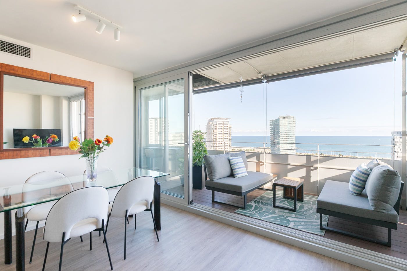 *Available only for rentals longer than 32 days for leisure, holiday, recreational or cultural purposes, and only when accompanied by the corresponding documentation that verifies such purpose.* This high-end monthly rental apartment in Diagonal Mar is located on the 18th floor of a stately building with luxury finishes on each floor and quality amenities such as a swimming pool, gym, parking included in the price, and 24/7 concierge service. The apartment has a spacious and bright living area. The living-dining room is furnished with a sofa, a portable TV, and a dining table for four people, with direct access to a large 15 m2 terrace equipped with outdoor sofas and panoramic views of the Barcelona coastline and Diagonal Mar park. The separate, well-designed kitchen has all the necessary appliances, ample storage space, additional work space, and a dining area with sea views, as well as direct access to the terrace. The sleeping area consists of two double bedrooms with built-in wardrobes. One of them has a table and chair, designed for studying or working. The bathroom is complete and has a shower tray. The apartment includes air conditioning, heating, and high-speed Wi-Fi. The building offers a communal swimming pool, parking space included in the price, gym and 24-hour concierge service. In terms of location, it is in one of the most exclusive areas of Diagonal Mar, just 4 minutes from the Diagonal Mar shopping center, 4 minutes from the metro station, and 6 minutes from the “Selva de Mar” stop for both the metro and tram. It is also a stone's throw from the beach and has easy access to Avenida Diagonal to connect with the rest of the city. ** ** ** ** ** ** SERVICES INCLUDED: - Check in and Check out in the apartment - WIFI included in all our apartments - Maintenance included (For damage due to normal use) - Fully equipped and furnished apartments - Multilingual manager assigned during the entire stay TERMS: - Deposit for stays shorter than 3 months: 1 month's rent - Deposit for stays longer than 3 months: 2 month's rent - Maximum Stay: 11 months - Registration Possible only for stays longer than 6 months - The utilities of Gas, Water and Electricity are not included in the renting price LOCAL TAXES (I.T.P.): 0.5% of the total reservation (Monthly cost calculated as "other" in the Rent summary. The total amount will be collected before the check-in). Be aware that HousingAnywhere is an online booking platform. Therefore exchanging CONTACT DETAILS and offering VIEWINGS is NOT POSSIBLE. The platform keeps your payment safe until 48 hours after your move-in date. In case the accommodation is not as advertised, you will be entitled to get a refund. “BOOKING PROCESS: After the reservation is confirmed, you will be required to pay the remaining payments directly to the advertiser before the handover of the keys...