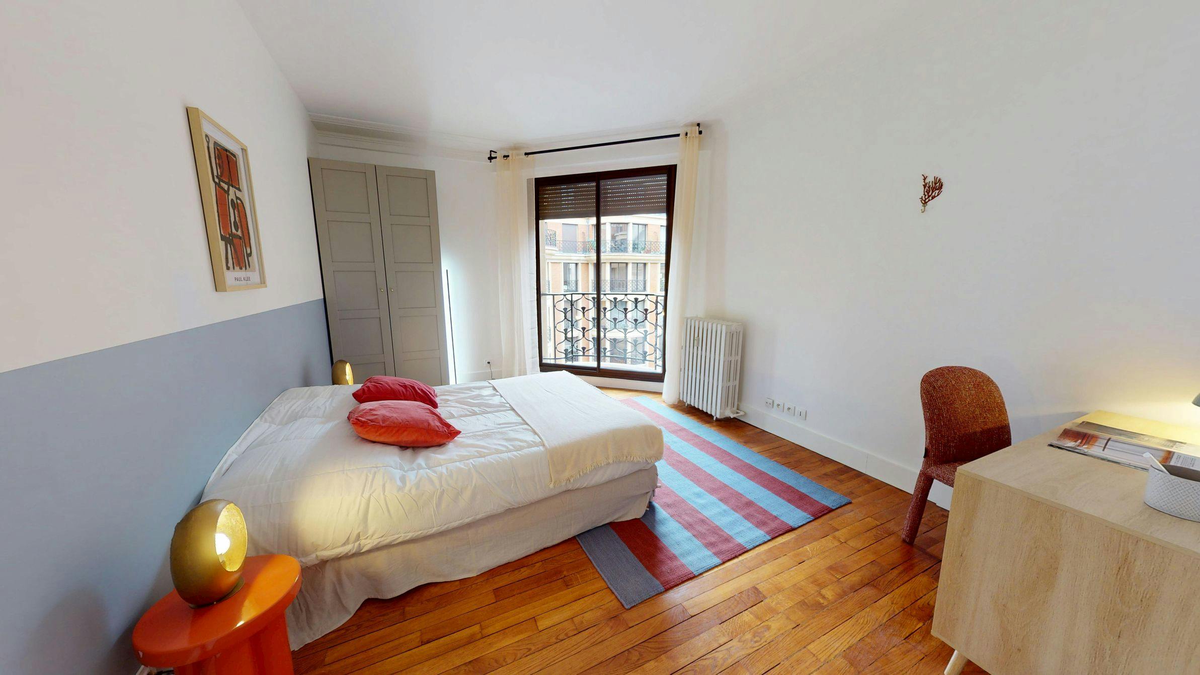 Furnished flat share ! All our flats are located in the city centre and close to all amenities and public transport (Metro, Tramway and Bus). This lovely private bedroom in a fully equipped, furnished and all-inclusive flatshare in Paris is a mix of comfort and design. It has got household furnishings, including a bed with pillows and duvet What is missing is your things to feel at home! The room can be locked if you need intimacy. All our rooms are fully furnished (bed, desk, wardrobe, duvet, pillows...). The flatshare can be found in the Champs Elysées neighborhood, in the heart of Paris. Plenty of shops, public transports, restaurants are accessible close by. The apartment is on floor 4 with lift. It is entirely equipped and is composed of a large kitchen with refrigerator, microwave, pans, crockery, kitchen ustensils, kettle... The accommodation also contains an ironing board, a washing machine, a clothes rack, an iron. Additionally, you will find cleaning items in the accommodation: bagless hoover, dustpan and brush, broom, mop and bucket... Every Joivy furnished flatshare includes all expenses: housing insurance, water, electricity, unlimited wi-fi, condominium fees, household waste tax. All our flats are fully equipped (washing machine, dishes, decoration...) by our teams, who also take care of the technical and material maintenance. Minimum stay : 1 mois Apartment eligible for CAF up to 258€ / month. The CAF for Caisse d'allocations familiales is a free public service eligible for all, including foreigners and can help you financially to pay part of your housing according to your situation whether you are French or foreign. To find out the potential amount of your assistance, go to the CAF website and complete the online APL (housing assistance) estimate. Service fee : from 990€ The service fee covers the writing of the lease but also the assistance throughout your stay. The service fee covers the repair and maintenance of the equipment as well as access to our ultra-reactive support in case of need for intervention in your accommodation. Deposit : 1200...