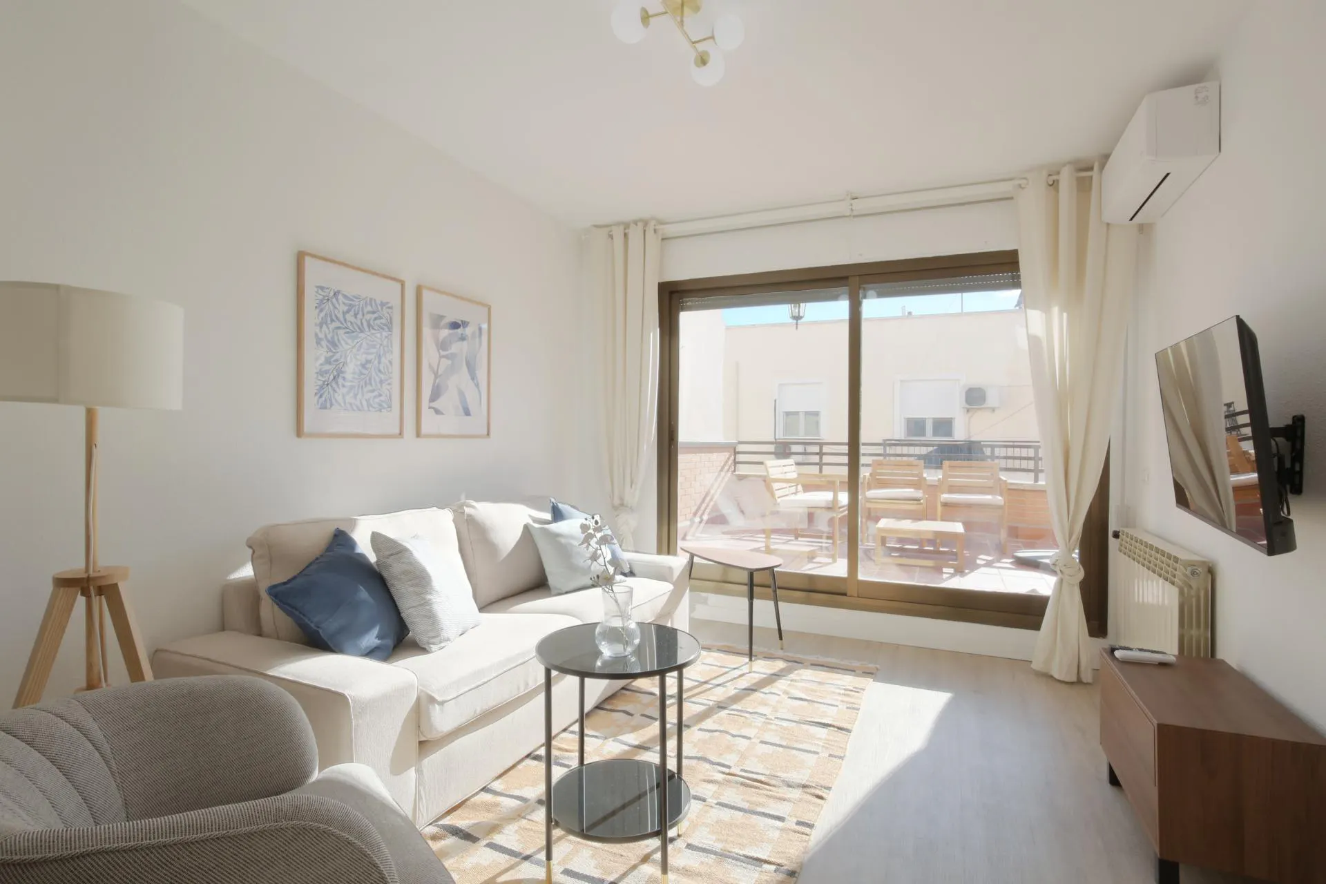 MONTHLY RENTAL Bright apartment with terrace, brand new in Puerta del Ángel, Madrid We present this exclusive, newly renovated apartment , located in the emblematic Puerta del Ángel neighborhood , in the Latina district . With a private terrace, this apartment is perfect for those looking for a modern and functional home in a privileged location . This bright apartment stands out for its contemporary design and well-used spaces . The living-dining room , with direct access to the terrace, is equipped with air conditioning , a comfortable sofa , dining table and SMART TV , creating an ideal environment to relax or receive guests. The house has a double bedroom with a built-in wardrobe and air conditioning , offering maximum comfort. The fully equipped, independent kitchen has new appliances such as an oven , microwave , refrigerator and washing machine , as well as basic utensils for everyday use. The modern bathroom includes a practical shower . This apartment has heating and all the necessary elements to guarantee your comfort from the first day. The apartment is surrounded by essential services such as supermarkets , restaurants , shops , pharmacies and green areas such as Madrid Río. In addition, it has excellent public transport connections : just a few steps away are the Puerta del Ángel metro station (L6) and several bus lines (31, 33, 36, 39, among others) . Ideal for those looking for a new, comfortable and well-connected space , with the privilege of enjoying a unique terrace...